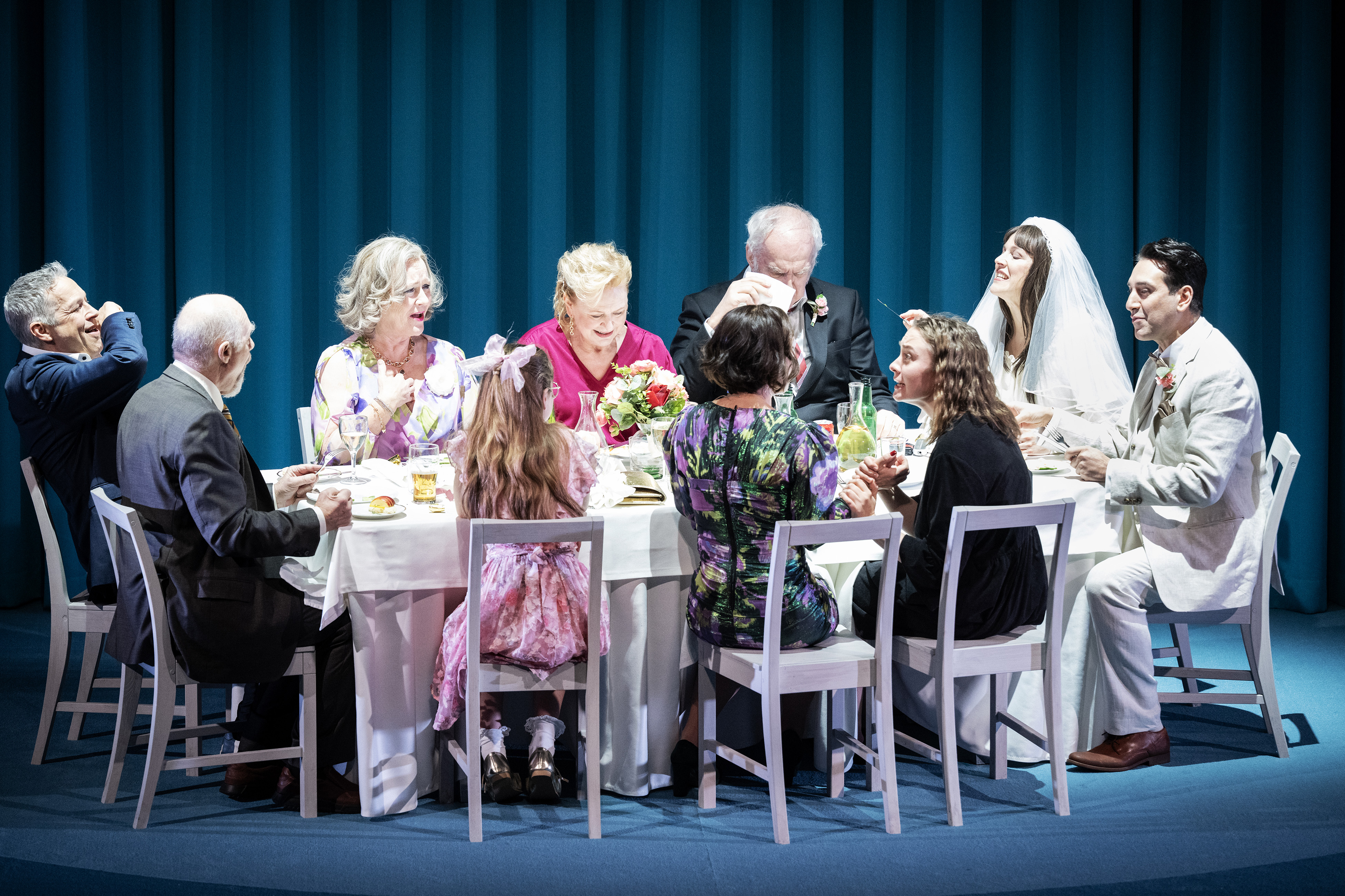 Det är överhuvudtaget kvinnornas tillställning det här. Inte för att männen är staffagefigurer i pjäsen, men för att de främst är fyrkantiga i sina karaktärer och också spelas så och för att kvinnornas roller är oändligt mycket mer mångfacetterade. Det är ju också kring deras relationer sins emellan och mot sin män/fäder det mesta utspelar sig inför bröllopet och under detsamma med tillhörande bordssittning och blöta fest all inclusive.