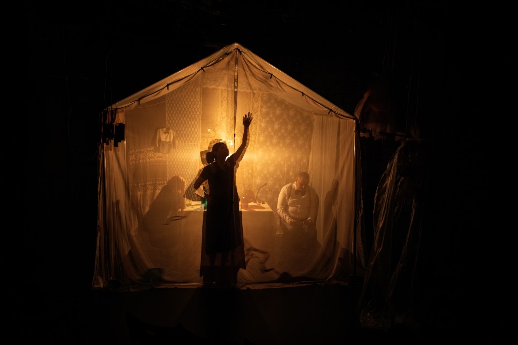 Tygerna kläs av ”huset” och blir segel på ett skepp, eller draperingar för något helt annat. Det är hela tiden ett aldrig sinande flöde av möjligheter.