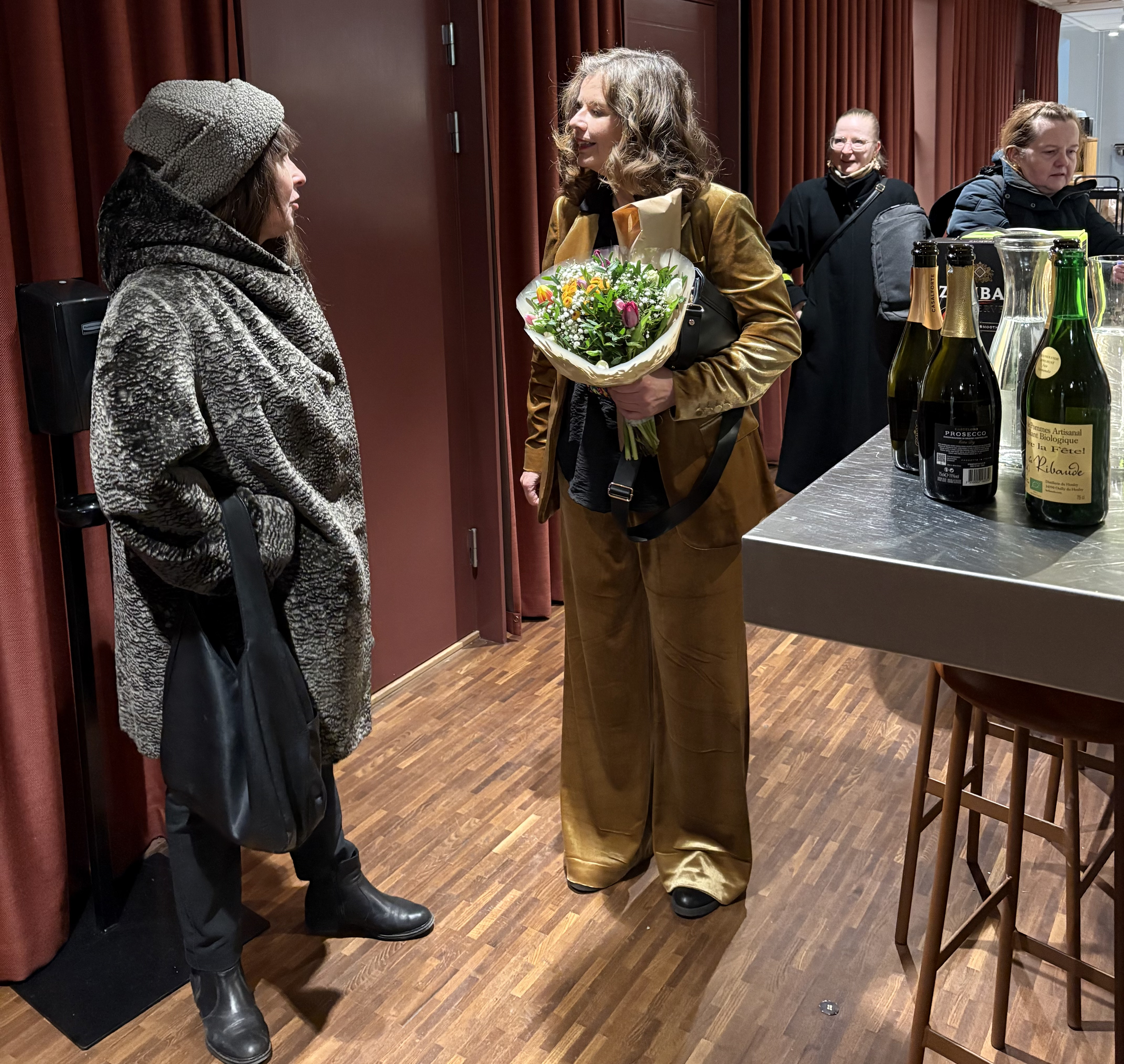 Tiden dröjer. Men jag går upp mot förlaget och innanför fönstret ser jag hur det rumsteras och fixas. Jag knackar på, blir insläppt och välkomnad, hjälper förstås till. Som aviserat blir besöket kort, men hjärtligt. Hon är populär, Jeanette.