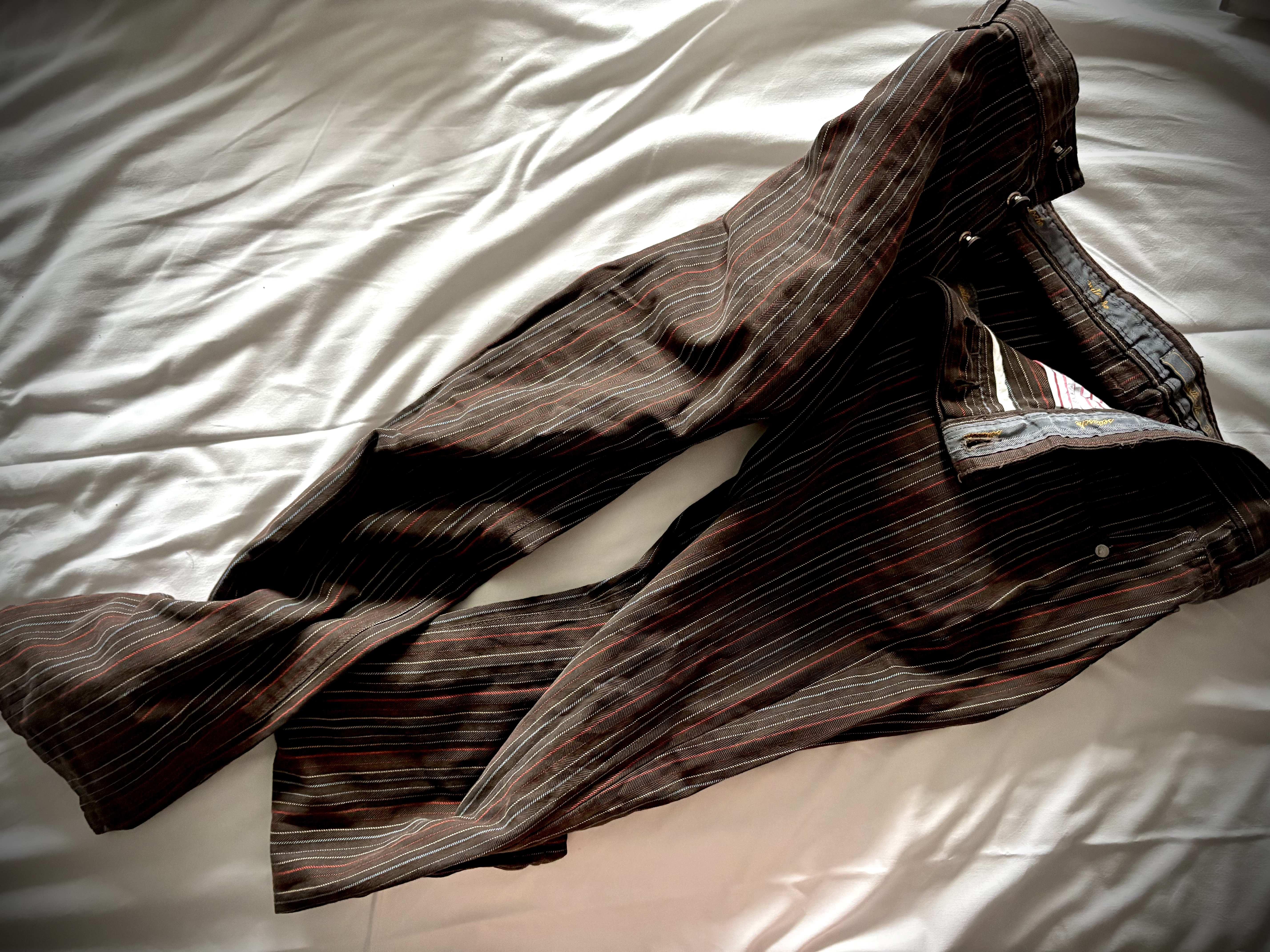 Det gick att vädra våren, men det var rått och kallt i luften. Över Oslofjorden svepte en tät dimma in allt i ett töcken. På vägen tillbaka smiter vi in UFF Vintage Heaven på Prinsens gate. Vi cirklar runt lite var för sig, jag nyper i ett bara snygga Bosssneakers… men nej. När jag är på väg ut ser jag ett par randiga byxor som lockar. Jag kollar in dem, ett par jeansliknande, italienska Ursnygga, i min storlek (jag måttar, och det står sol 38, vilket är för mycket, egentligen). Men Seitasche säger mig ingenting. Jag ser ju att de är välskräddade, men en googling ger inget svar. Köper dem för 295 norska, vilket blir en tia mindre i svenska. Mycket nöjd.