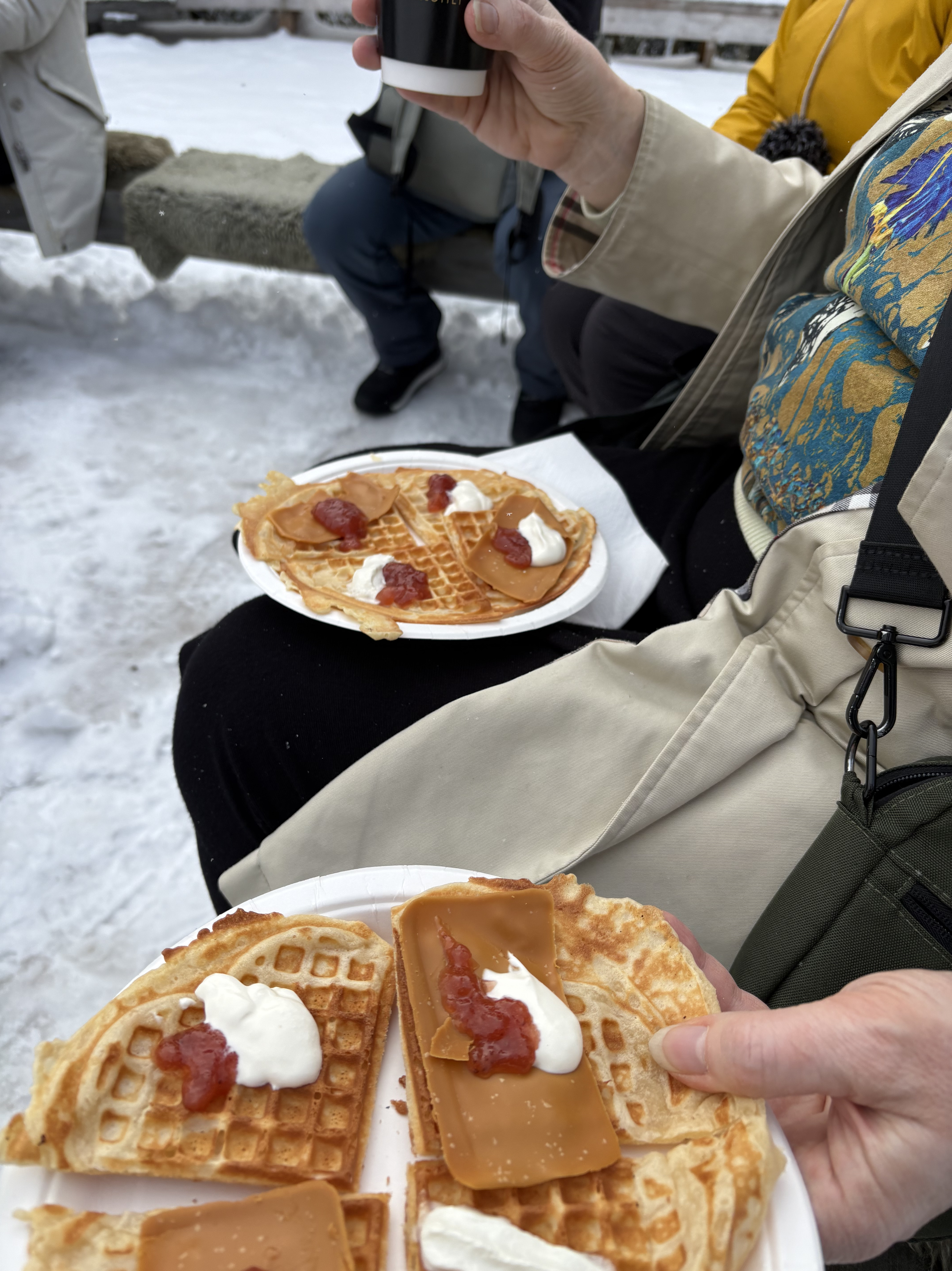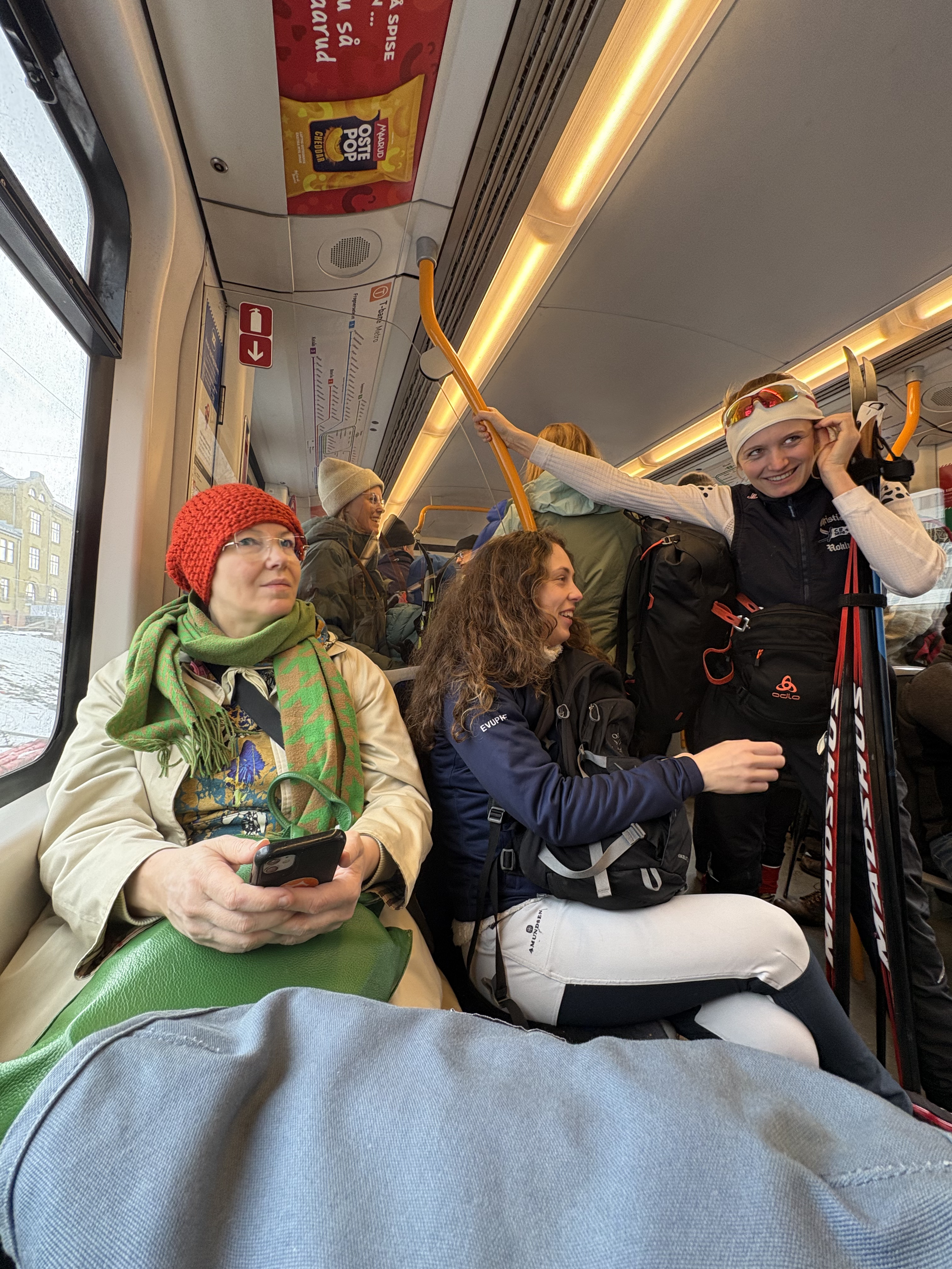 Omtumlade tar vi oss ut i dagsljuset, går mot stationen och åker upp till Frogneseteren, ändstationen på Holmenkollenbanan. Där nosar Z reda på ett fik som serverar varmchoklad och våfflor med brunost. Så gott ute vid den öppna elden utomhus. Vi åker åter och Z kräver att vi ska gå av vid Holmenkollen för att kolla in skidstadion. Vi är inte ensamma. På vägen upp har vi noterat, som alltid i Oslo vintertid, hur skidåkare bär sina tur- eller slalomskidor för lite friluftsliv bara några minuter från centrum. Men det är också en skidtävling för de minsta, som lockat tusentals deltagare plus föräldrar. Det är massivt med ungar. Vi knatar backen upp, solen har trängt igenom diset och snön är som isen i en frozen margherita. Hoppbacken reser sig väldig och vid en scen underhåller maskotar för de små. Vi nöjer oss. Tar vägen tillbaka, lyckas ta en trick innan den stora rusningen och kommer ned till stan igen.