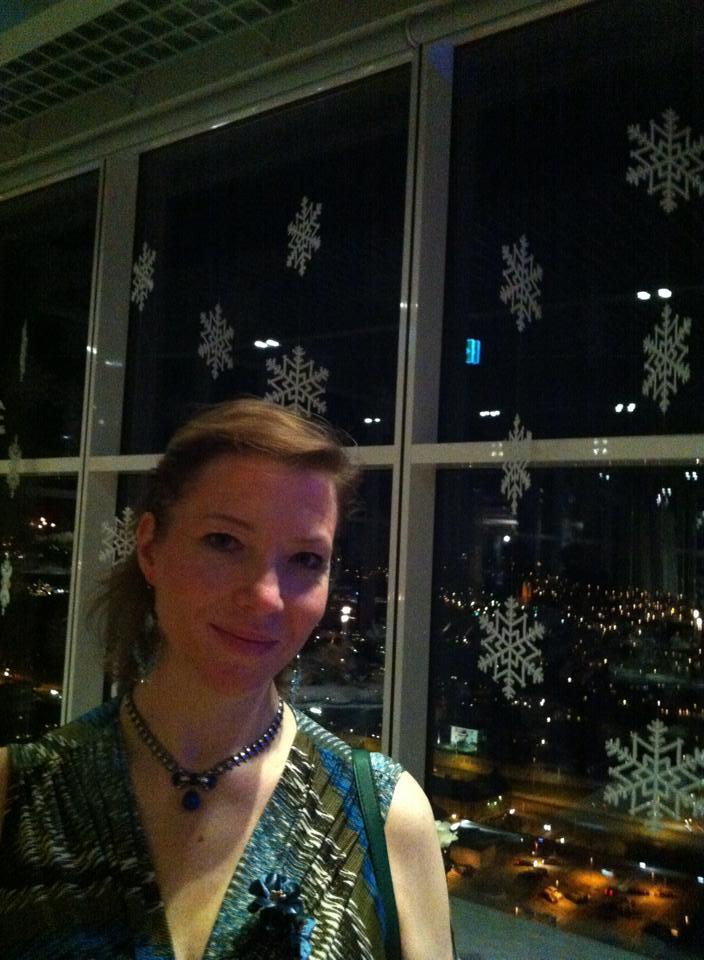 Jag får i ögonvrån se en före detta kollega, en kvinna som jobbade på tidningens grafiska sida för drygt 20 år sedan. Hon var sig skamligt lik och vi pratar en stund varpå hon undrar om vi inte ska hänga med. Hon med sällskap är på väg till en guidad tur högst upp i tredje tornet, dvs hundra meter upp. Vi hänger på, åker den halv inglasade hissen som vätter mot Liseberg och får en resa mot himlen och stjärnorna.
