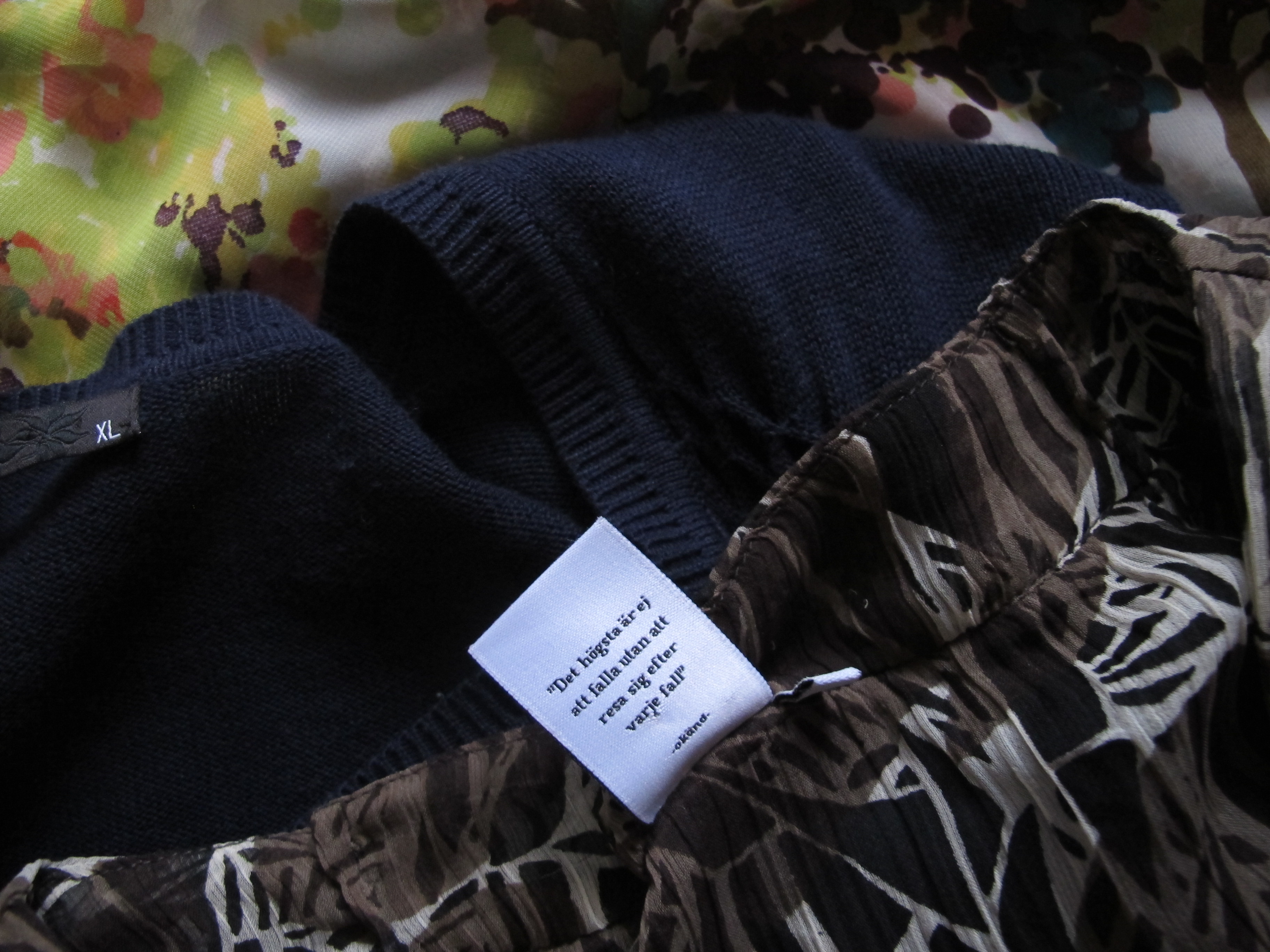 ”Det högsta är ej att falla utan att resa sig efter varje fall” står det på etiketten, som också ger uppgifter om kvalitet och tvättråd.