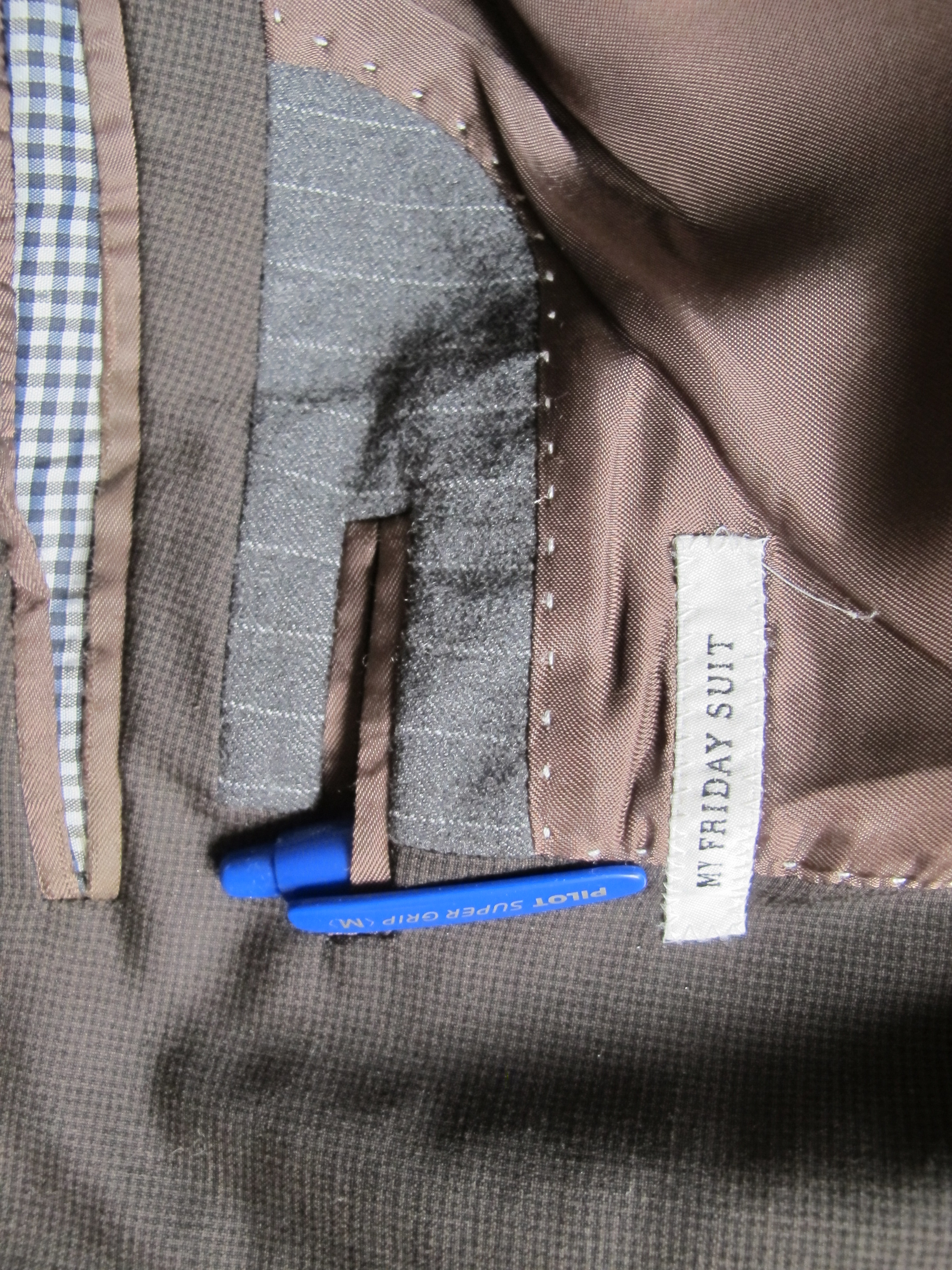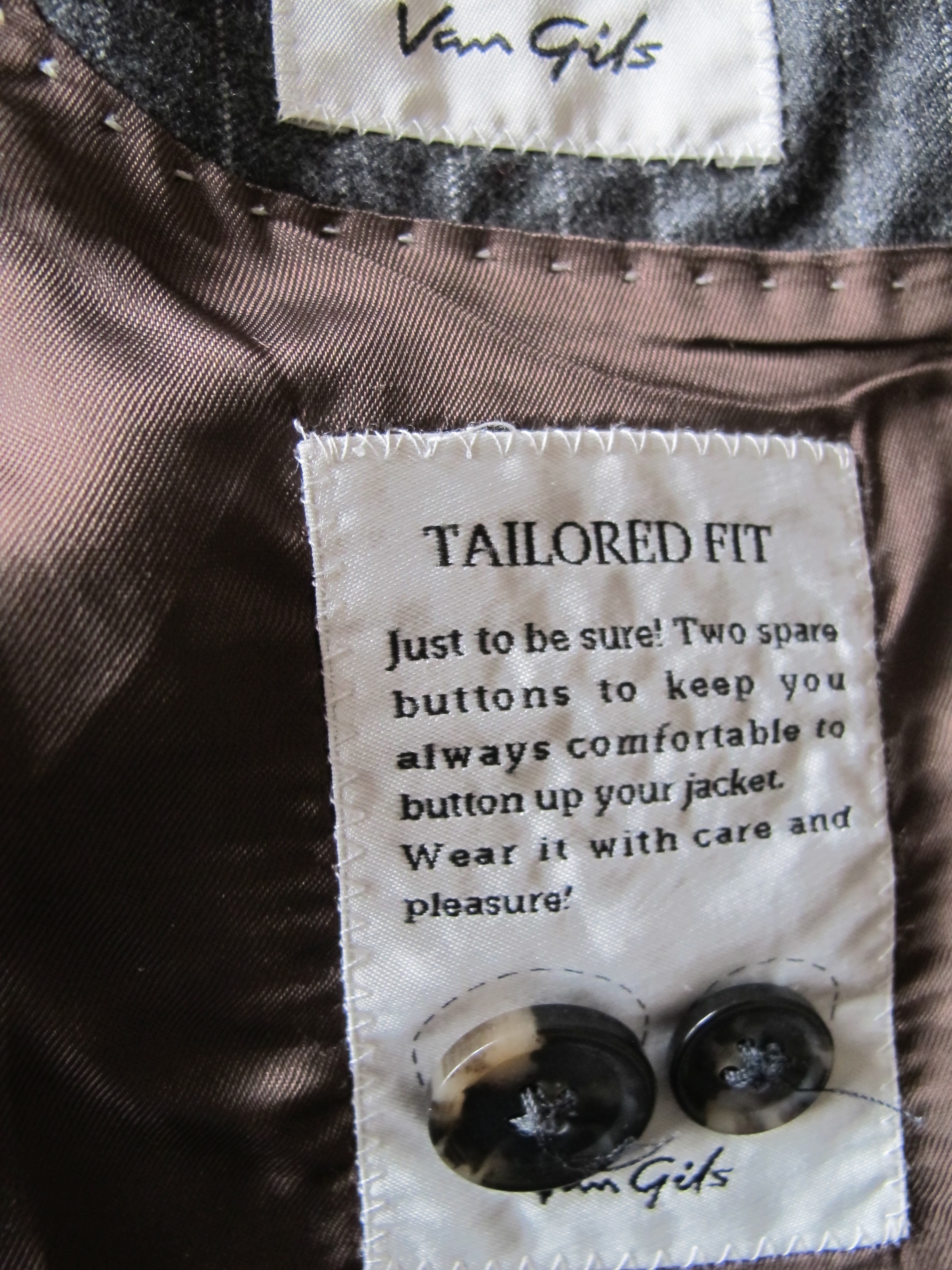 Till höger står det på en liten etikett ”My Friday suit” och till vänster, på en smula större ”Tailored fit” i rubriken och sedan ”Just to be sure! Two spare buttons to keep you always comfortable to botton up your jacket. Where its with care and pleasure! plus två extra knappar inrammade av streckade cirklar. Trevligt.