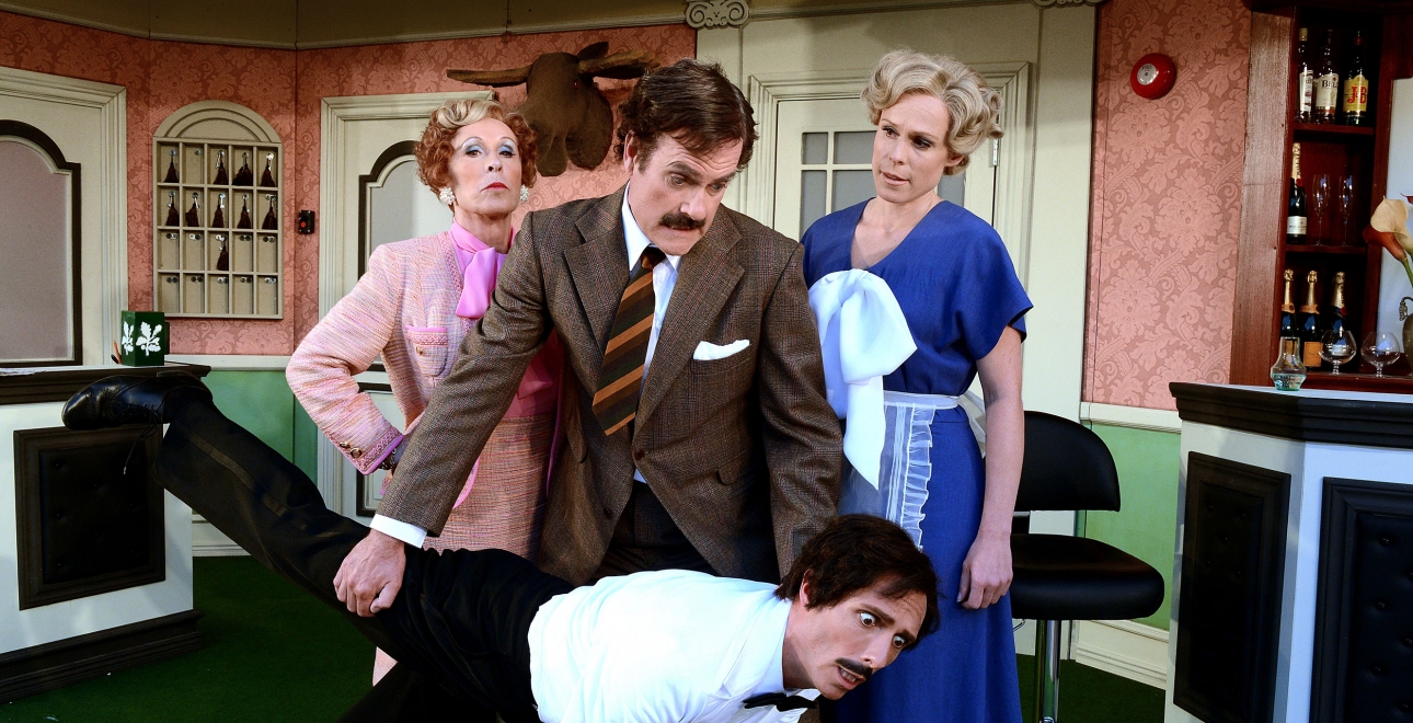 Det är inte utan att jag kliar mig i huvudet inledningsvis. Malmöuppsättningen av ”Pang i bygget”, som gästar Göteborg under våren, är ju som fullständigt, på pricken kopierad från tv-serien från 70-talet, då John Cleese skruvade på humorn på ett aldrig skådat vis.