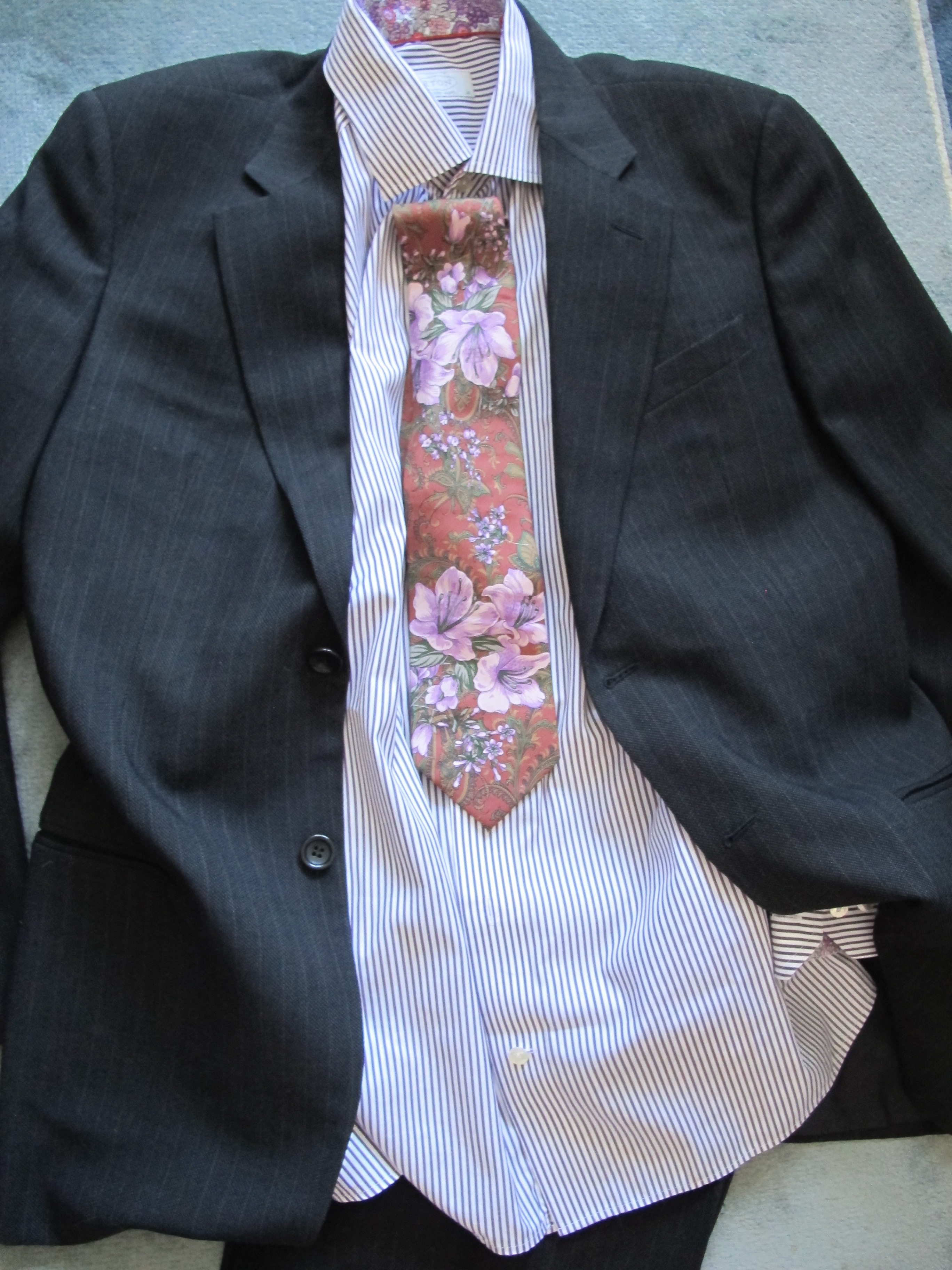 Kostymen tillsammans med skjortan och den ljuvligt blommiga slipsen matchar inte bara perfekt, allt sitter som om det vore skräddarsytt. Filippa K-skjorta spänner över min bringa på ett sätt som inte bara är orsakat av ett gott leverne med Z. Men jag tänker på min lillkille, fotomodellssnygg och med inte lika stor spännvidd över bröstet som jag. (När han senare får den blir det verkligen som en dröm, han klär i den som vore den sydd för honom.)