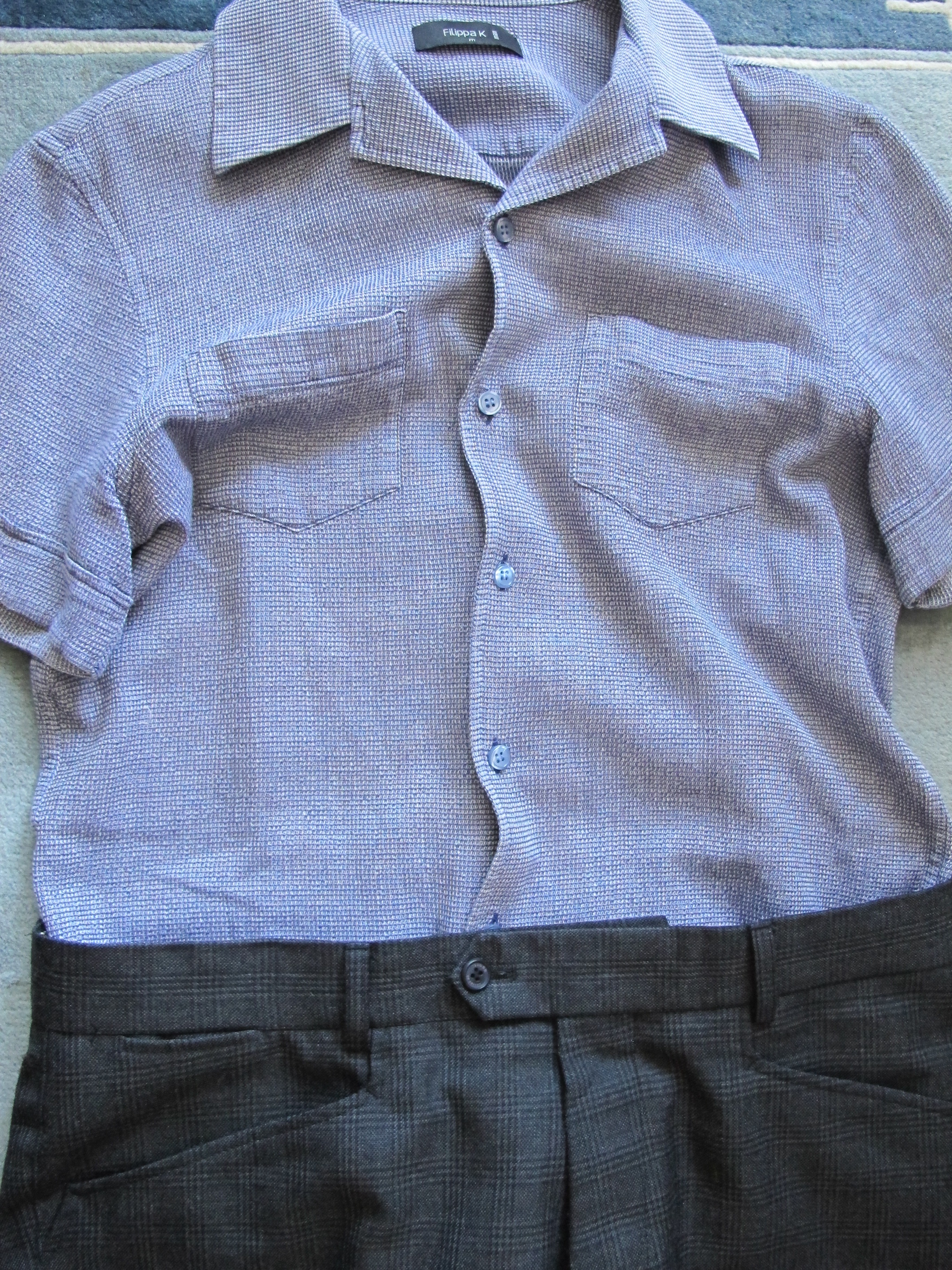 Förra veckan hade jag dessutom fallit till föga på Reningsborg och hittat en tämligen corny, men också kaxig skjorta – en högkragad Hawks & Curtis, svartvitmodellerad i mönstret med fyrkantiga knappar, röda detaljer och sömmar – som liksom hängde och bad om att bli köpt av mig för 85 kronor. Kanske verkar det snobbigt med märkesnämningarna, men faktum är att det oftast är av god kvalitet och därmed ger det inte bara valuta för de förhållandevis små summor som jag handlar för utan också längre brukstid. Jag försöker dessutom hitta plagg som är någorlunda klassiska, men med en personlig touch som passar mig och sitter väl. Det gör också att användandet kommer bestå och glädjen för plaggen likaså.