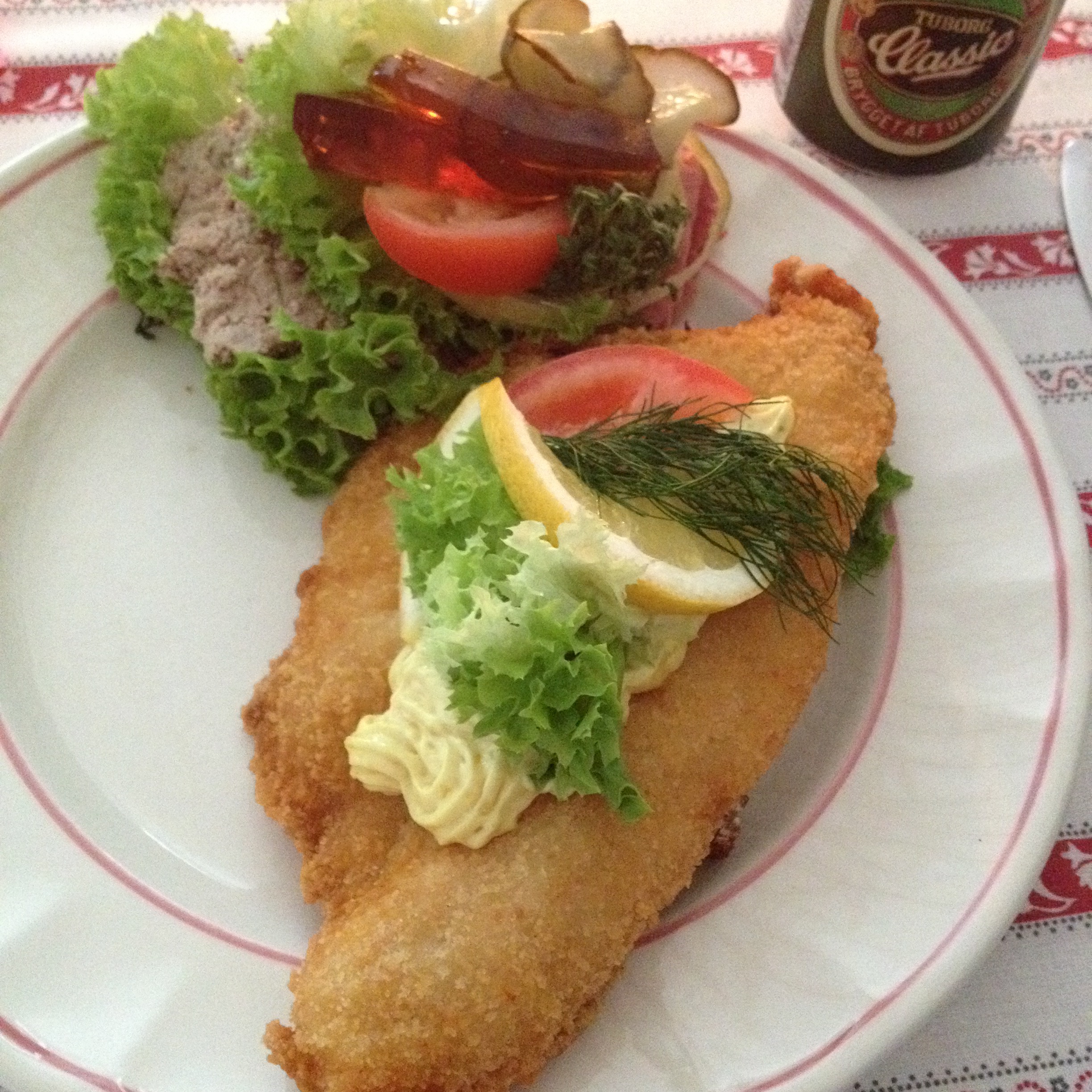 En förrätt, sallad, blev fördärvad av köket med vinegrette och fick göras om och göras rätt. Vis av detta tog Z kontakt med kyparen, för att poängtera vad hon faktiskt beställt, så att det inte skulle bli några misstag vid huvudrätten. Det blev värre. Sås till köttet, som var stekt i fett då det skulle vara utan, salladen till hade krutonger som det var tillsagt att det inte skulle vara. Maten kommer till våra vänner, men jag får vänta och hustrun än mer på grund av alla turer. Personalen, det är tre inblandade kring bordet, ber om ursäkt och säger att misstag kan göras. Men Z är tuff och förklarar att det inte handlar om misstag eller missförstånd; de har helt enkelt inte gjort som hon önskat. På notan fick vi kaffe och dessert om plåster på såren, men Z var inte nöjd och med lite uppläxning på danska blev hennes ”rätter” strukna, återigen med en obegriplig förklaring om att det hela var ett missförstånd som man beklagade.