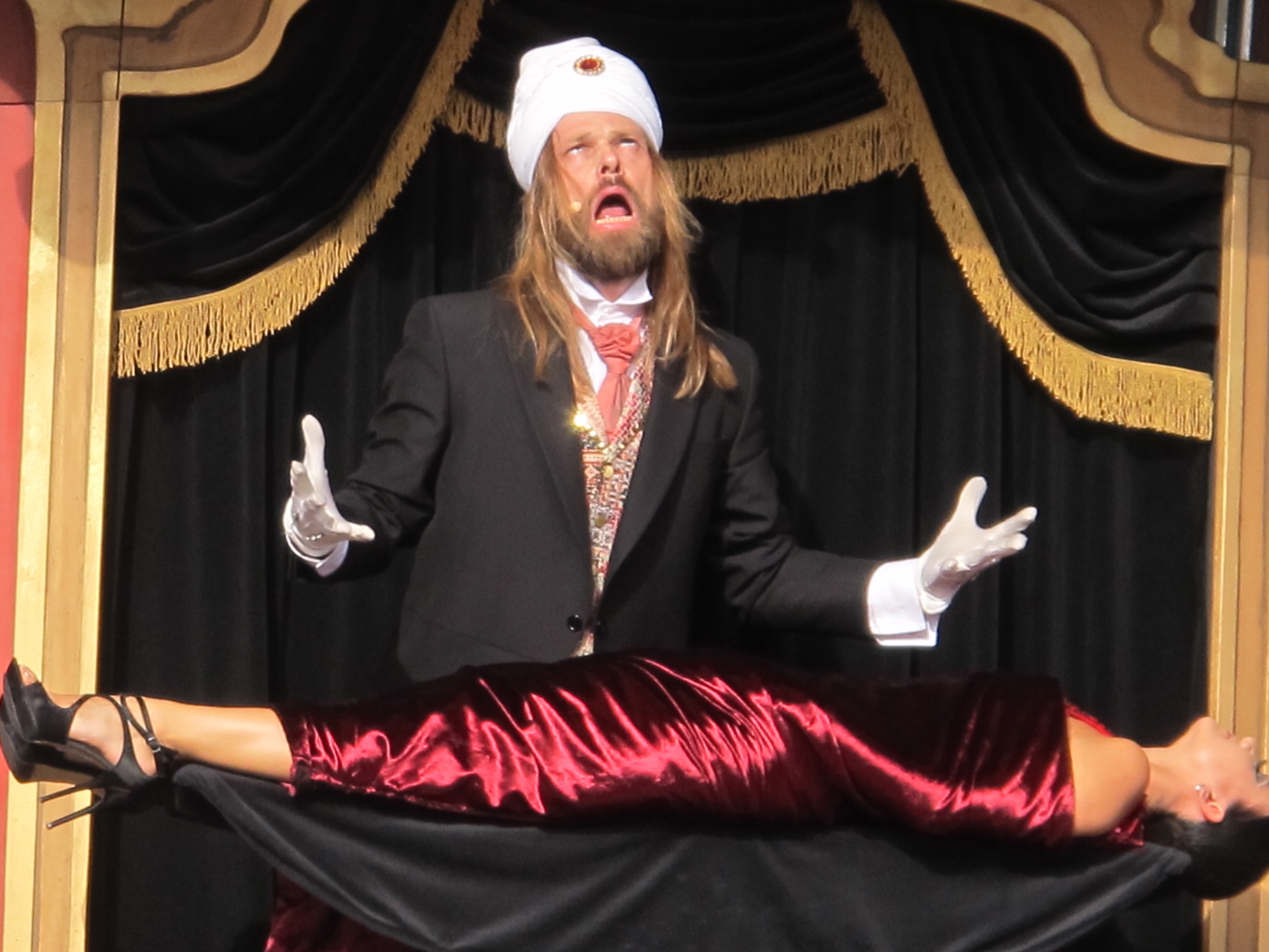 Det är naturligtvis en sceneffekt och en gimmick, som är väldigt mycket Carl-Einar Häckner. Ja, så mycket att det kan ha äventyrat hans talang, som då han (medvetet) lär ha fallit över scenkanten vid ett trollkarlsevent i Las Vegas för ett tiotal år sedan, där mängder med promotors och arrangörer satt utan att förstå intelligensens i detta fall och som definitivt inte lockades av att engagera denne märklige svenske entertainer.