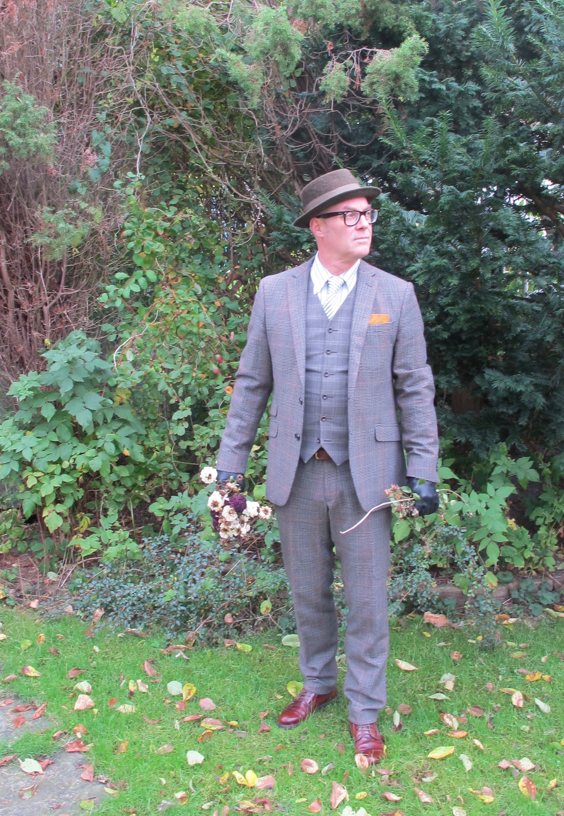 Kom höst, kompost. Oscar Jacobsonkostym, Freeport 1200 kronor, väst Oscar Jacobson, 450 kronor, Freeport, skjorta Morris, Ted & Teresa, Göteborg, 300 kronor, slips Atlas design, Ted & Teresa, 100 kronor, Björn Borgskor, Reningsborg, 70 kronor, hatt Rockel, Erikshjälpen, 30 kronor., handkar TM Jewin, London east end, gåva, livrem, Mulberry, arv, snusnäsduk, Next Reykjavik. Foto: ZEBA PEDERSEN LÖWEN-ÅBERG