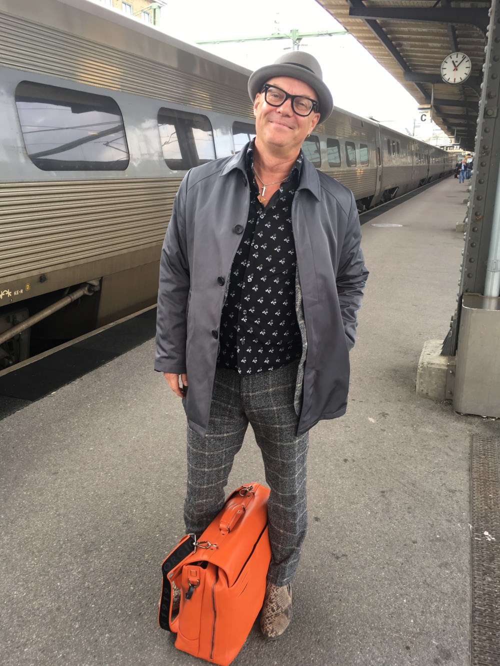 Jag tackar smickrat och ler. Känns fint. Går till stationen och väl vid perrongen med tjugo minuter kvar försöker jag fåfängt ta en selfie, för Instagram, för hustrun, för världen. Ställer mig längst ner på perrongen, men lyckas inte så bra. Ringer Z och berättar om spårvagnshändelse och hon frågar hur jag ser ut. ja, inte negativt och uppfordrande, utan nyfiket. Jag berättar och hon tycker att jag ska låta någon ta en bild på mig. Jag känner mig inte bekväm med det, men har på senare tid utmanat mig med just detta. En kvinna i 30-årsåldern som också ska med tåget står och väntar på att få gå ombord. Jag frågar henne och förklarar att min hustru vill se hur jag ser ut. Hon ler förtjust och tackar jag till uppdraget.