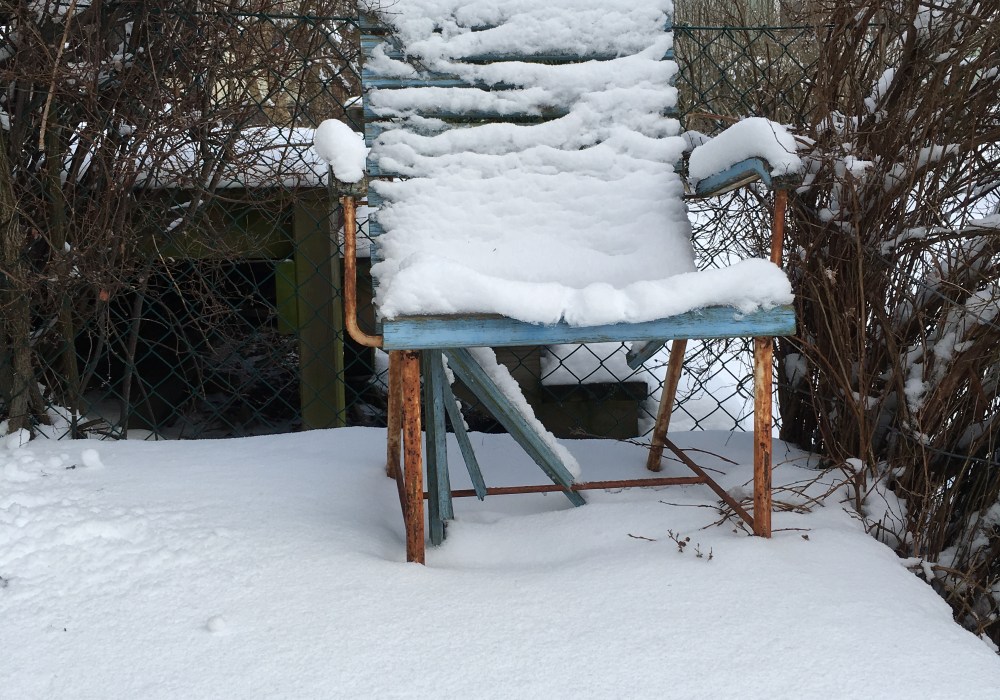 Jurakomposten är frusen, luckan kärvar; jag vet det, det är så det är. Så därför lite verktyg för att separera den isade fukten, som fungerar som ett starkt limm när det är minusgrader. Jag håller på med tålamod, får använda en hink för att balansera komposten, som i sin frusenhet inte är balanserad – tombolan vill snurra runt i fel läge – och sätter den som stopp för att kunna få upp luckan. Det går till slut. Sakta bryter jag upp den och konstaterar att ena sidans kompost är till is, permafrost; den andra är tom och ska nu börja fyllas till sommaren är det mull till gagn för växtligheten.