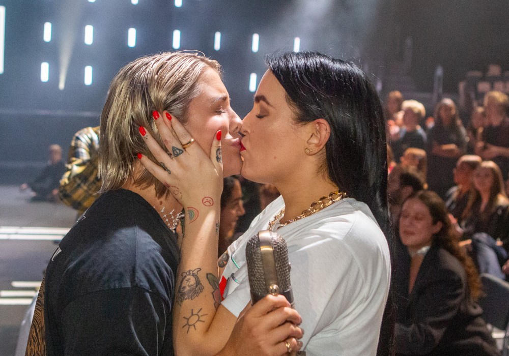 Segerkyss. Molly Sanden får en priskyss av Miriam Bryan på P3 Guldgalan.