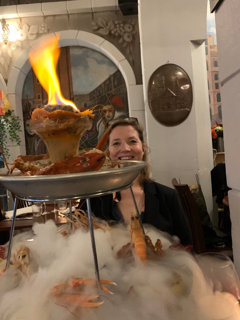 Vi får vänta på vår beställning. Ja, upp mot en halvtimme, trots Z:s gester om uppmärksamhet och en ström av serveringspersonal som cirkulerar utan att göra något. En melodi som restaurangen behåller under aftonen. Men när väl maten kommer utan större ursäkter är den superb, så vi låter det passera. Så kommer tornet med havets läckerheter, som en fyr tänds det ett litet bål högst upp och nedanför gör kolsyreis att allt effektfullt sveps in i en dimma. Showtime! Men inte för en romantisk middag och det borde vi ju ha begripit, att skaldjur utgör ett energiskt arbete med att krossa skal, pilla bort och slafsa med skvätt och sölighet som ackompanjemang. Men vad värre är: skaldjuren smakar ingenting. Det finns ingen sälta, ingen arom, ingenting! Z ger upp då jag kämpar vidare. Men till slut påkallar hon kyparens uppmärksamhet och ber att få menyn, för hon är hungrig. Maten hon/vi har fått går inte att äta, dessutom var jätteräkan rå. Det blir en fettuccine alla norma, toma, aubergine, ricottaost med basilika, och samtidigt som vi beställer den säger Z: efteråt vill vi ha tre ostar och därefter tiramisu och espresso. Klart och tydligt.