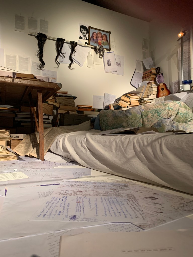 Jag hamnar i ett mörker med skavande, gnisslande musik; Nick Caves värld från barndom fram till konstskola, Melbourne, musik, sturm und drang, flytt till London, flytt till Berlin, samlande av brev, tavlor, hårtestar (!) och ett av Nina Simones tuggat tugggummi. Hör finns sovrum, sängar, skrivbord, böcker, skrivmaskiner, manus, fragment, utkast… Och jag tänker att det är inte helt olikt Freddie Wadling-utställningen på Göteborgs konstmuseum 2017. Samma slags samlarmani för inspiration, en irrationell för en kaotisk, men ändå begriplig konstnärsgärning.