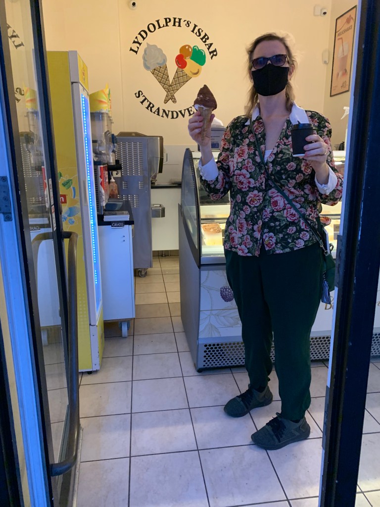 Vi lämnar Hellerup strand när solen blekar ut för kvällen. Låter bilen stå på Onsgårdsvej upp mot glassbaren, maskklädd beställer Z min is och sin plus kaffe, hon är också ungdomarna behjälplig. Med strutar fyllda av olika smaker går vi sakta ned mot bilen igen, njuter av utsikten över Öresund och får en stilla stund på jorden innan bilen styr oss mot Nordhavn igen.