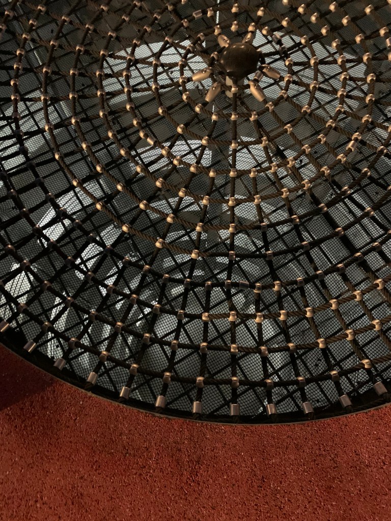 När vi kommer till p-huset släpper jag inte av ungdomarna längst ned. Istället gör jag den snurriga cirkeln upp, upp, upp för att finna en p-plats på femte våningen, närmast högst upp. Gärningen uppskattas inte, men avsikten var att ge dem nya insiktet och utsikter. För när de surt stolpar iväg för att ta hissen (ja, varför använda trapporna…) går Z och jag upp på taket och upptäcker den där stadsparken med träningsmöjligheter. Det är så sinnrikt, rekreation för den målmedvetna eller lekfulle. Träningsredskap samsas med gungor och studsmattor. Över cylindern som leder bilvägen in, upp, ut och nedför p-huset är det spänt ett nät som den djärve kan gå över. Min svindel sätter stopp, men jag gör det. Två gånger.