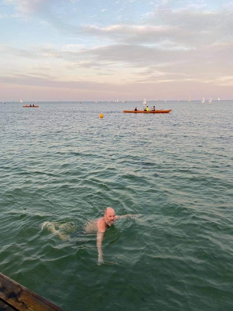Jag har badbyxorna under, tar av mig, samtidigt som Z tackar nej. Det är för kallt i luften. Jag går i, känner Öresunds klara, friska vatten omsvepa mig, tar några simtag, och vi är där där askan av Z:s far spreds för några år sedan med familjen och några svanpar som enda vittnen.