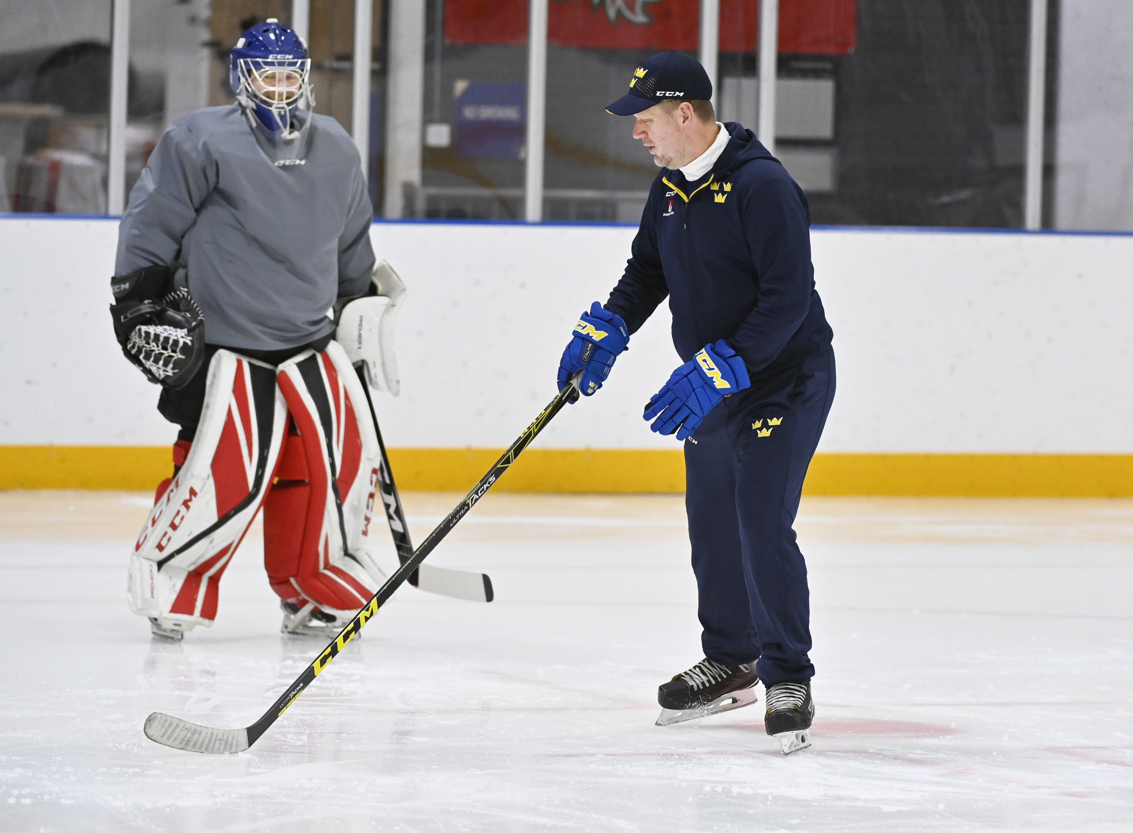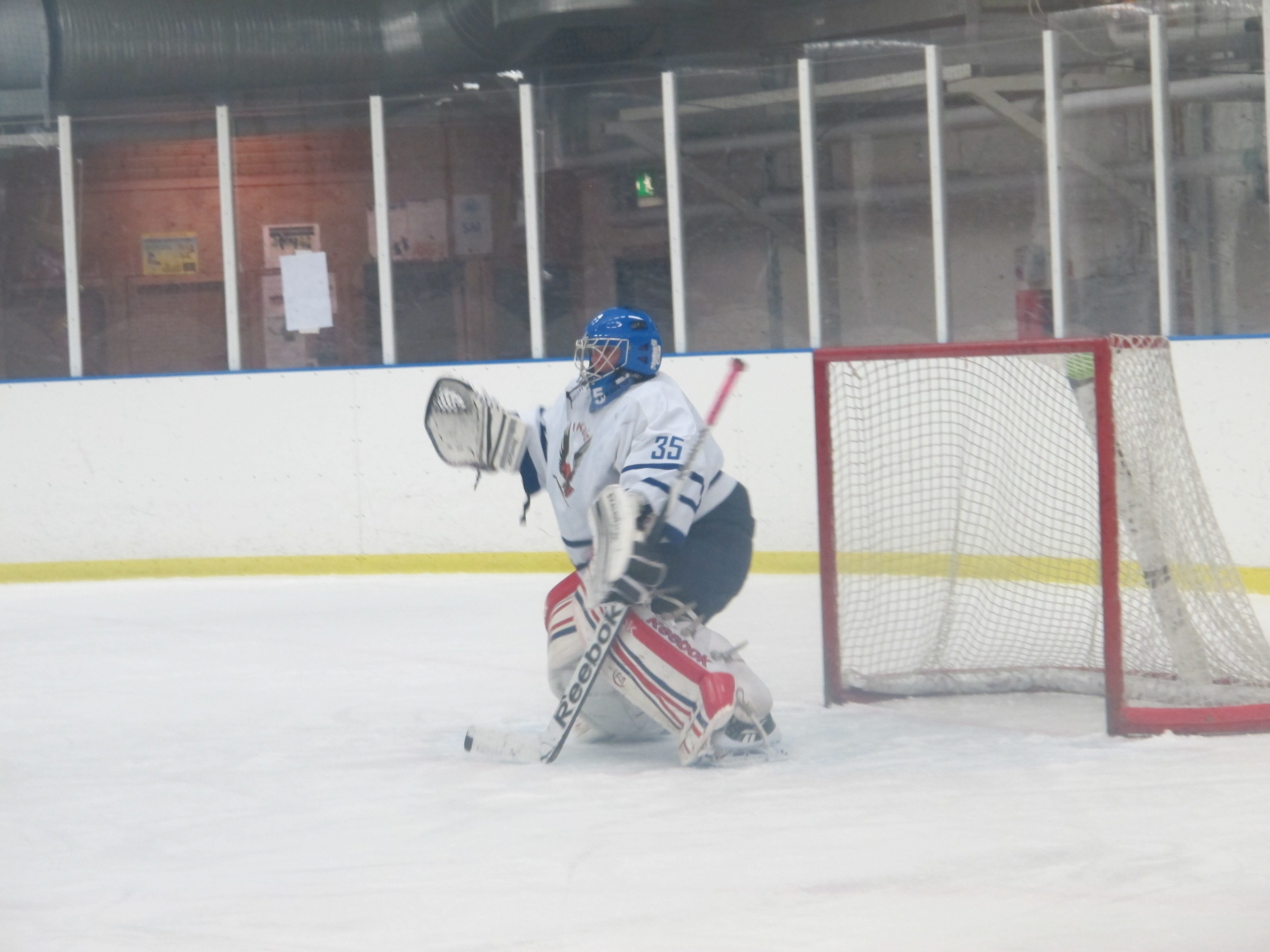 På med skydden, uppvärmning på is och sedan lite skridskoövningar som jag får för balansens skull, men också för att de också ska användas i spel.
