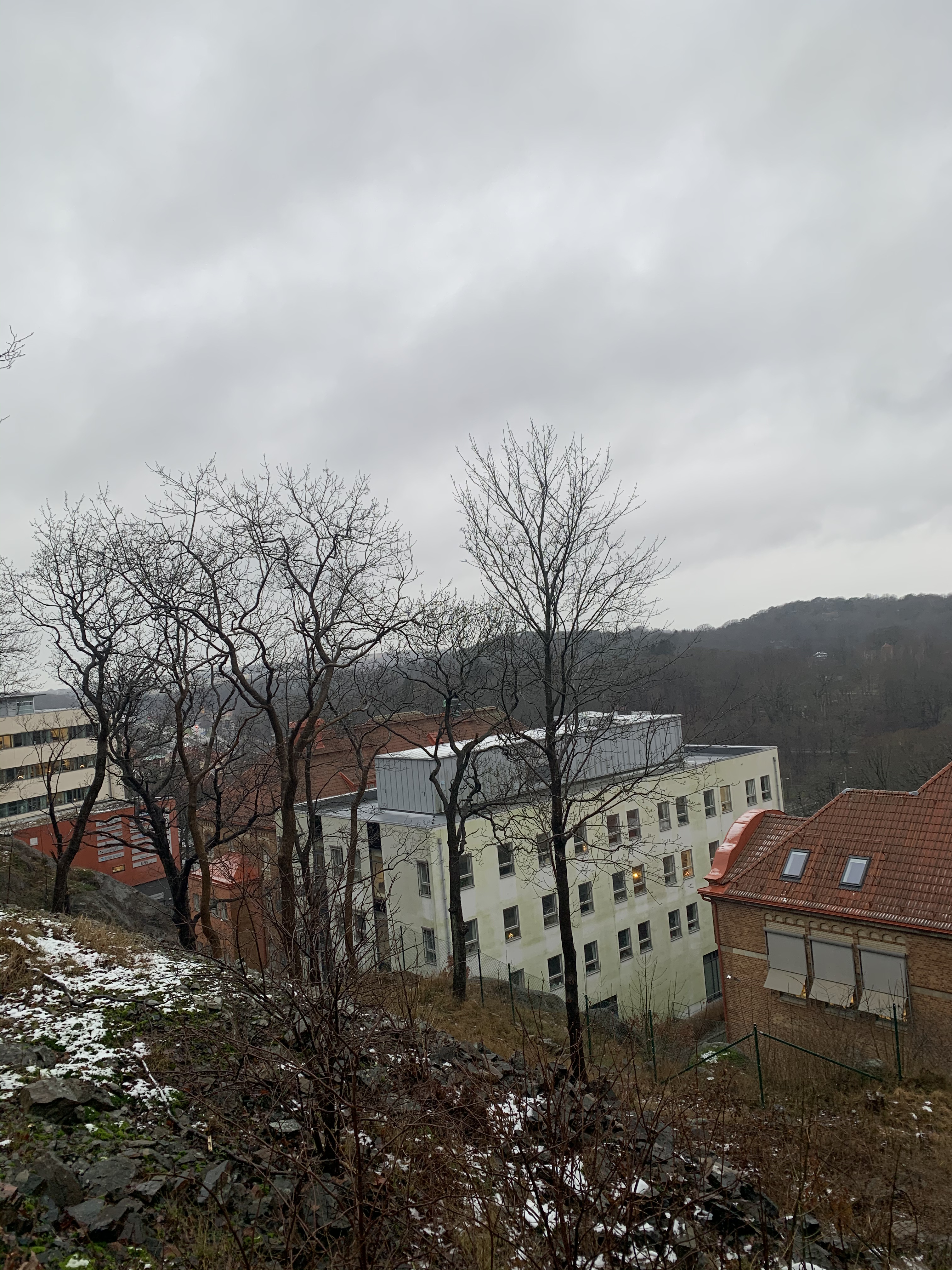 Jag hamnar på återvändsgränder, asfalterade stigar som lovar passage ned till gamla barnsjukhuset och Annedalskyrkan. Får vända om. Kommer till en märklig terrass där jag kliver in för att gjuta mina fotspår i den slaskiga hinnan som dröjt sig kvar efter nattens blöta snöfall. Jag ser ned mot Änggården och en himmel som vägra glipa för sol och blå himmel, som tjurigt håller på sin fuktiga grånad.