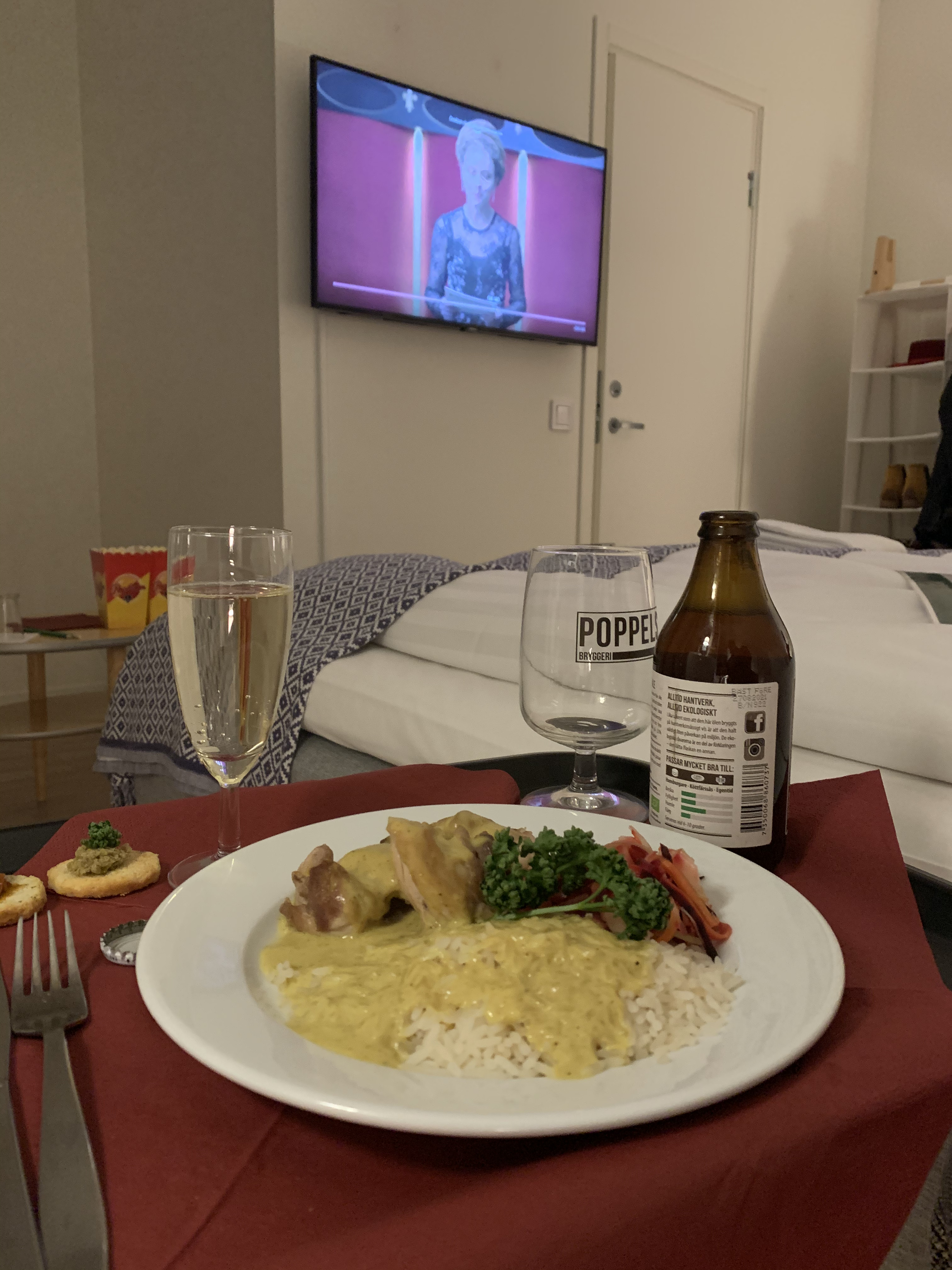 Vi kommer i galastass till hotellet en aningen för sent för att det ska vara bekvämt för vår egen skulle. Missar entrén, som är ytterst blygsamt skyltad och som saknar Filmfestivalens standarer utanför. Men vi parkerar, Z frågar på råd hos Poppels restaurang bredvid bryggeriet och vi kommer rätt. Möts av en värdinna i en entrén, men ingen röd matta och knappast med premiärkänslan vibrerandes i hotellets kalla insides väggar. Går ekande trappor uppför för att checka in (vi missade hissen, men det är ju bara nyttigt), blir visade vårt rum och ska försöka snabbt komma in på Filmfestivalen invigning (som vi är sena till) och därefter premiärfilmen, finska ”Tove”. Det går så där. Trots hjälp från hotellets sida tar det evinnerlig tid. Kanske inte så konstigt. Erbjudandet om Filmfestivalkonceptet rasslade till hos hotellet, som inte hade tv-apparater i alla rum, men snabbt skaffade. Därför var alla inte installerad, däribland vår. Men efter lite krångel löste det sig och vi kunde, med alkoholfritt bubbel och popcorn ta oss an invigningen. Maten knackade på dörren, vi fick en Poppels till och tog oss an filmen om Tove Jansson, som gått svindlande bra i hemlandet, trots coronaåret. En Plantation Barbadosrom, en 60-årspresent där dyra droppar sparats, förgyller kaffe och efterrätten.