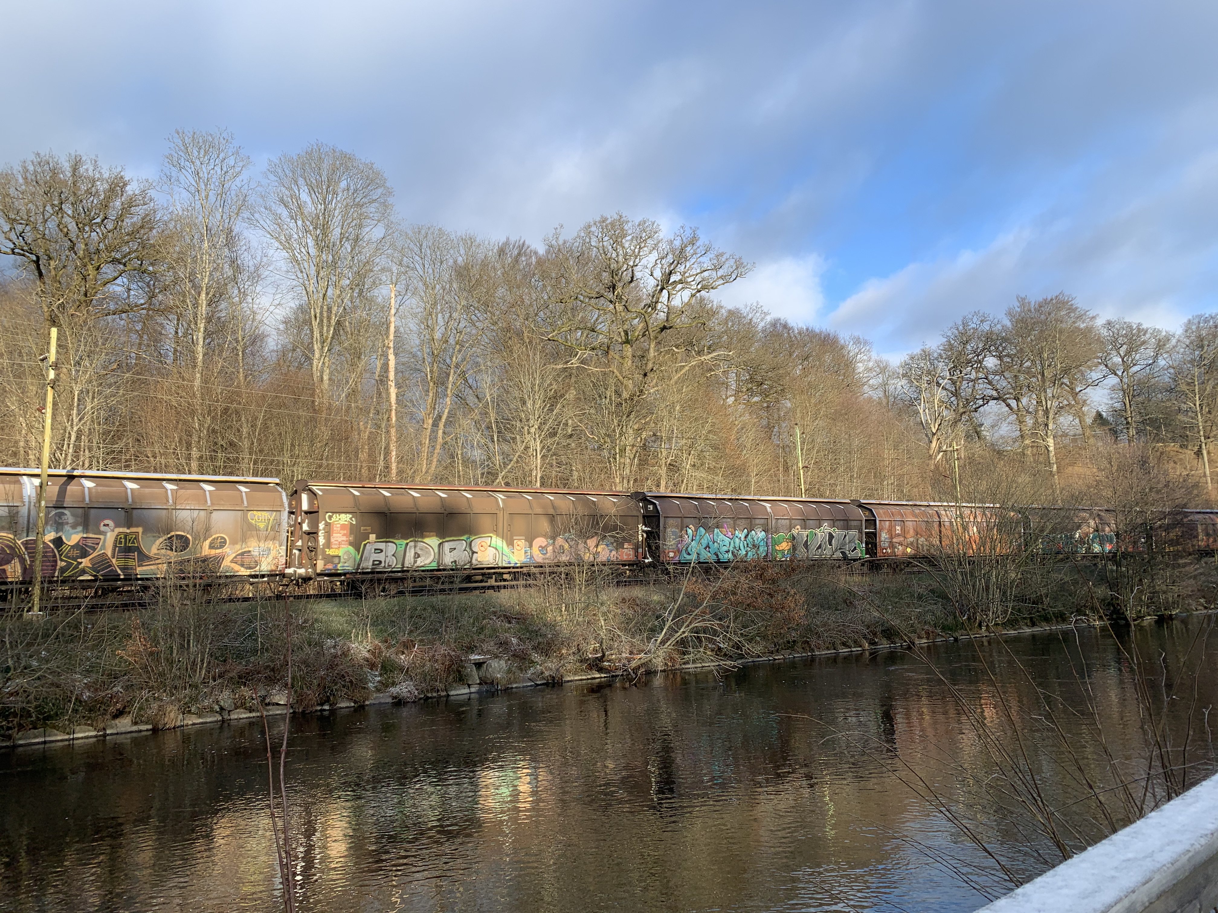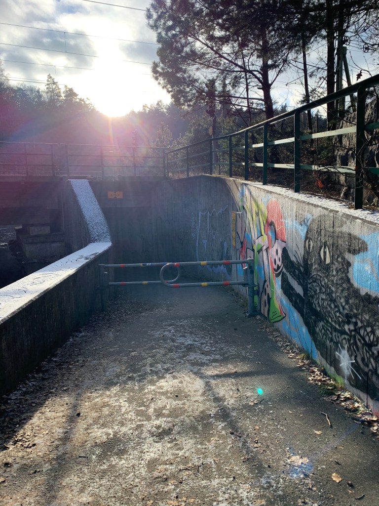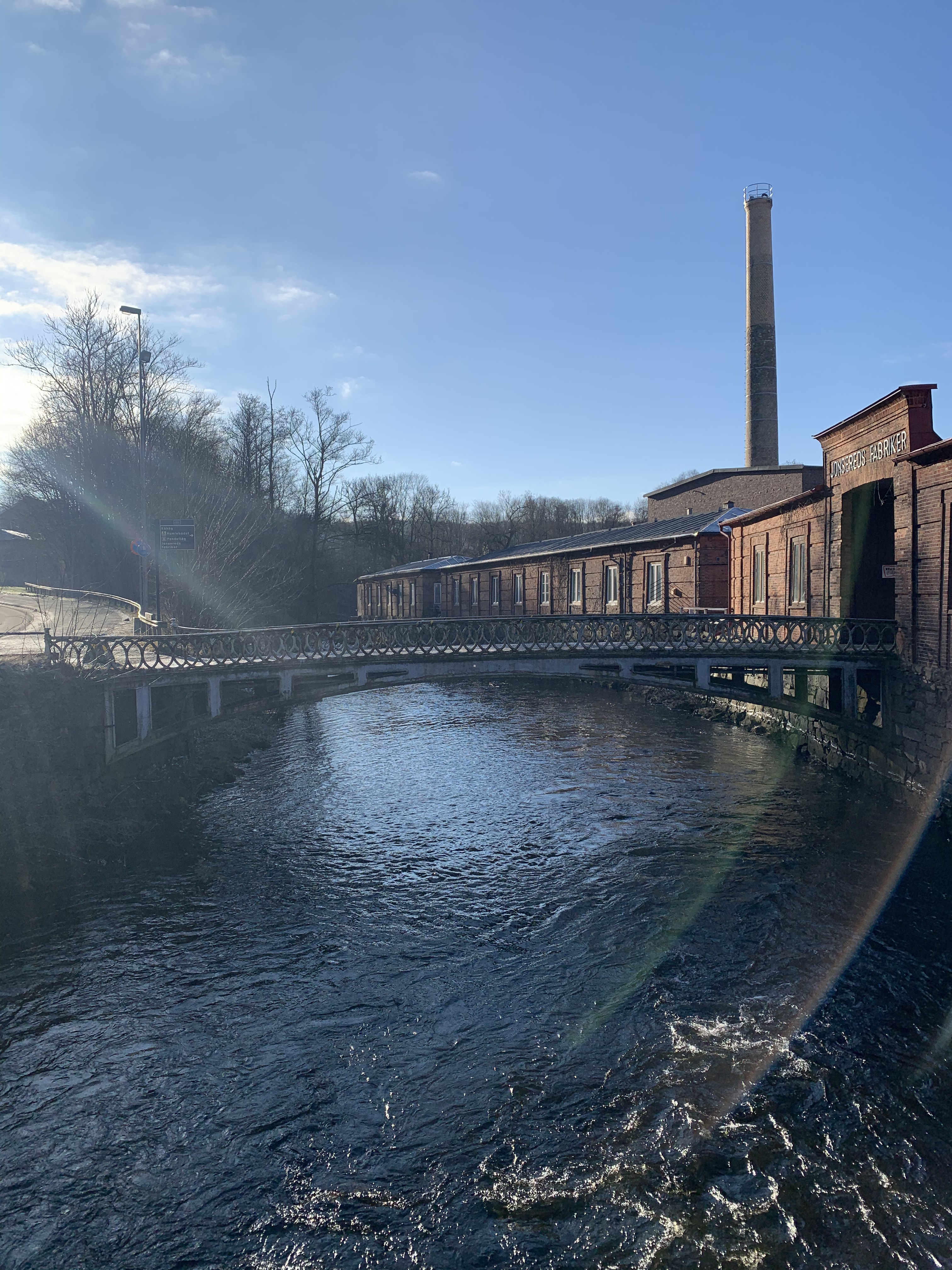 Vi tar lite bilder i den sobra miljön med den vackra utsikten över Aspen, dividerar en smula om den bifogade kartan och hur vi ska gå, innan Z får rätt och vi knallar ned mot stranden, betar av några frågor på vägen, går ned i en grafittimålad tunnel under järnvägen och mot Sävenåns strida strömmar. Det är en kort promenad, men den andas historia och tack och lov att området med Jonsereds fabriker inte har rivits; här är vackert.