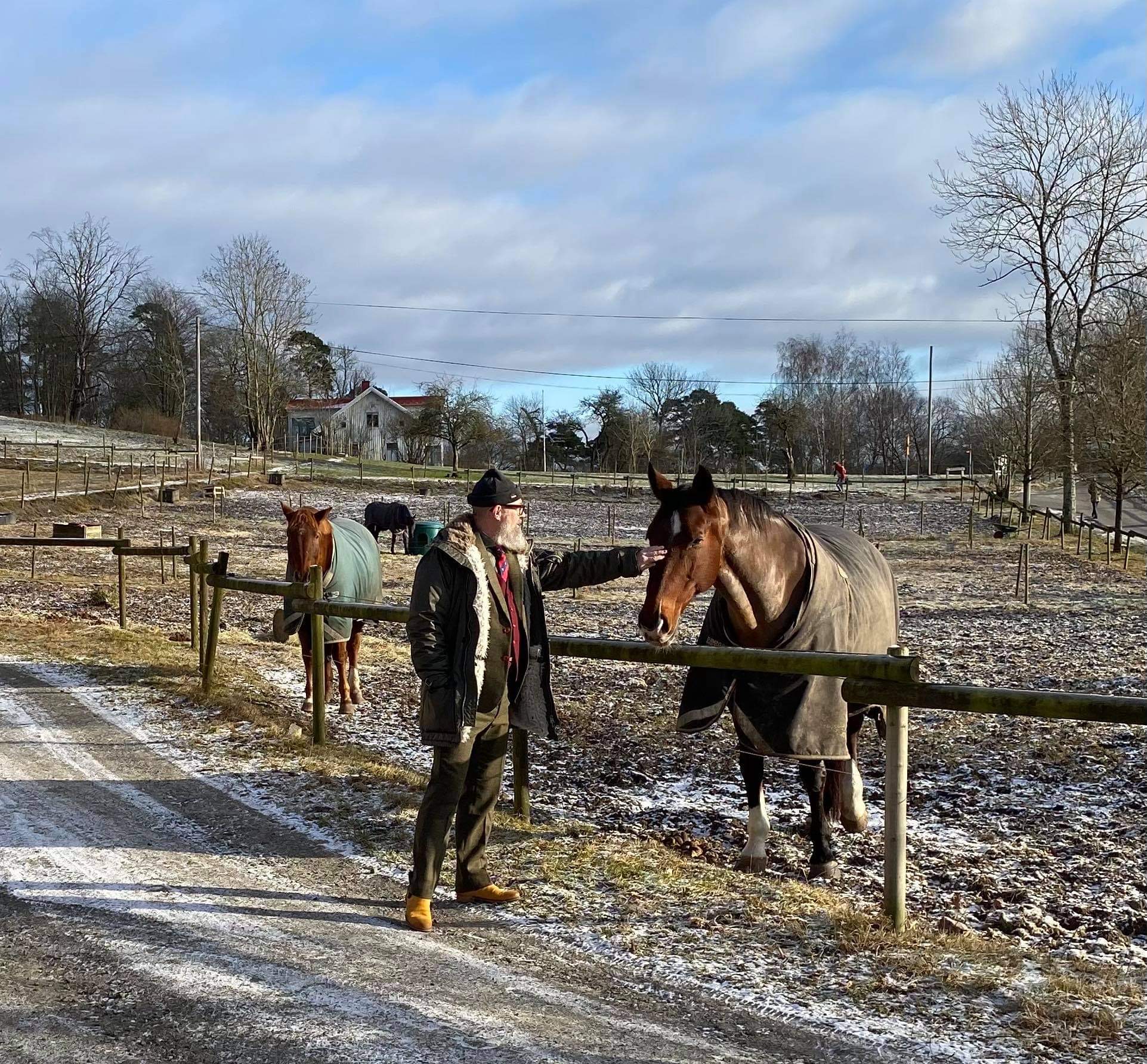 Nära herrgården står några hästar som jag i ett försök av världsvant manér försöker klappa till den ena bruntens förtjusning: ”Mera, mera!” gnäggar den tyst.