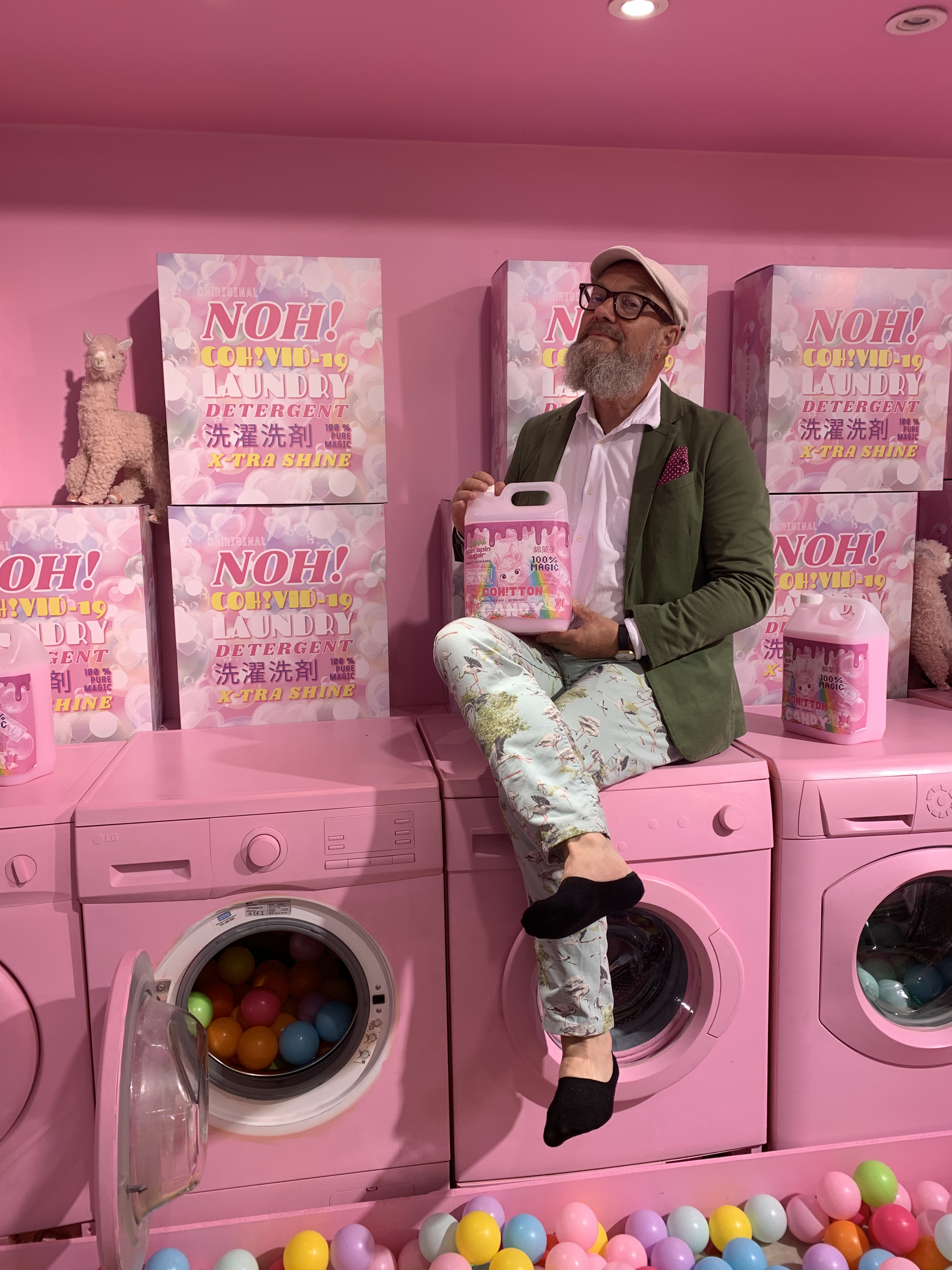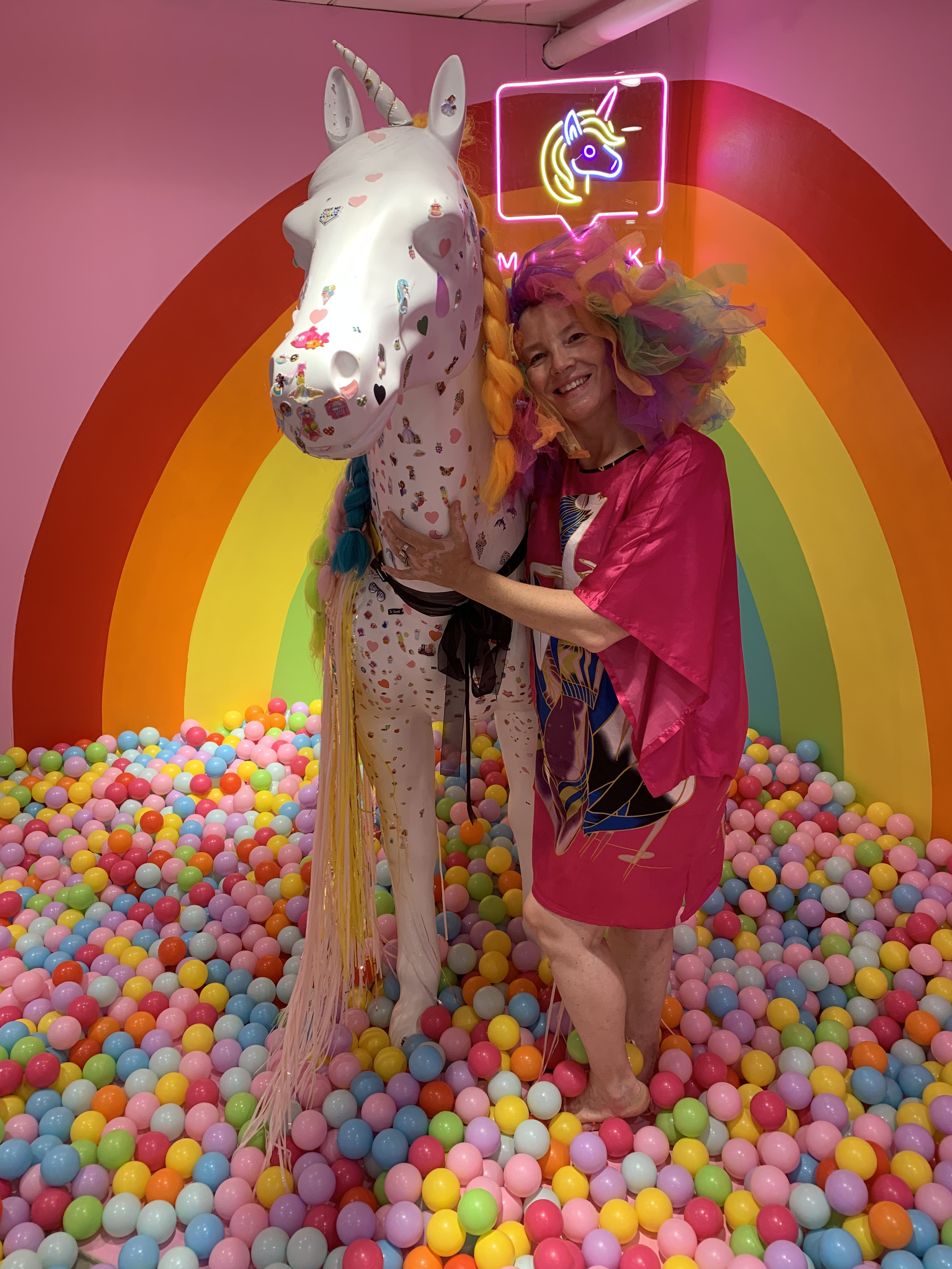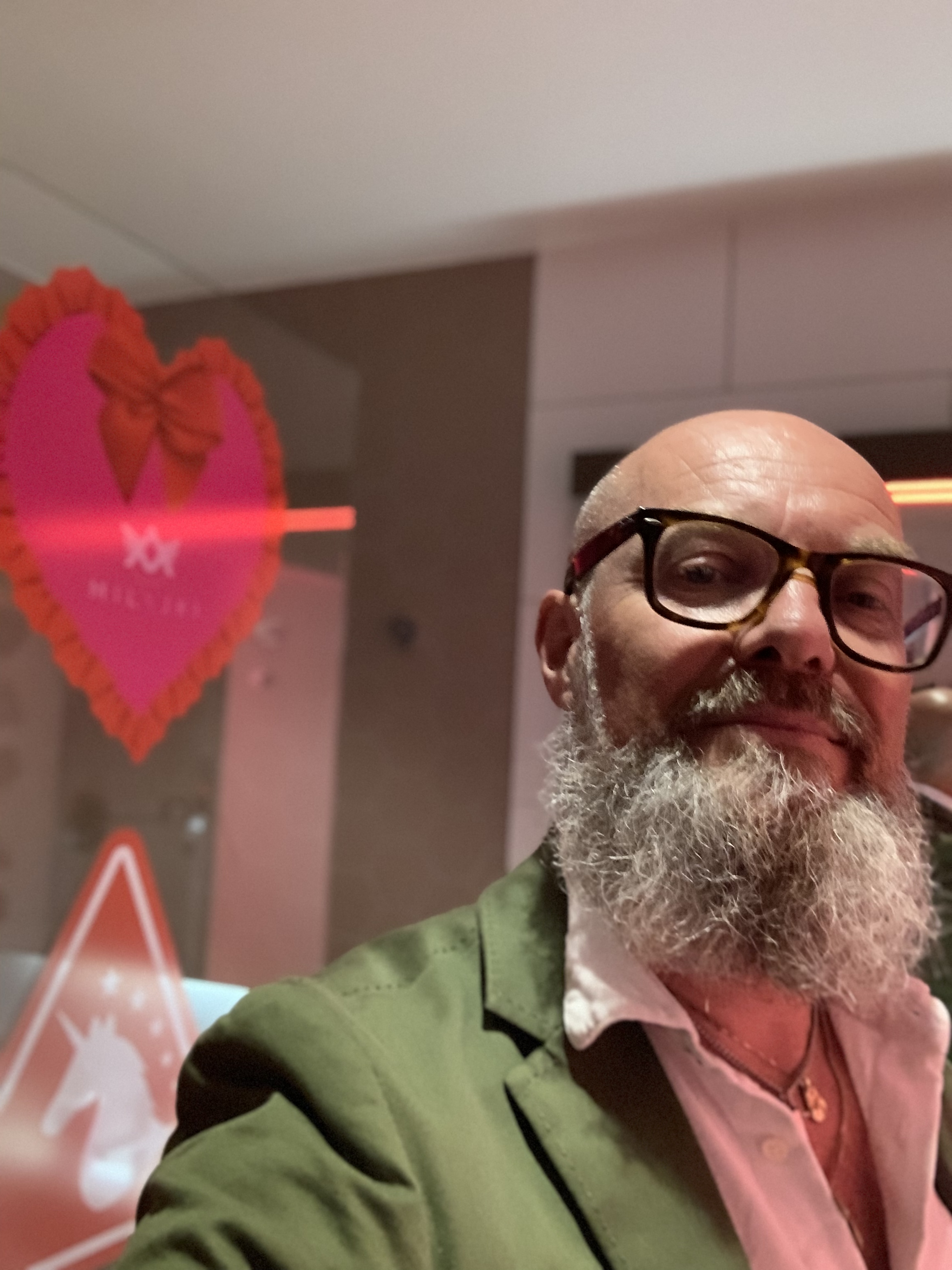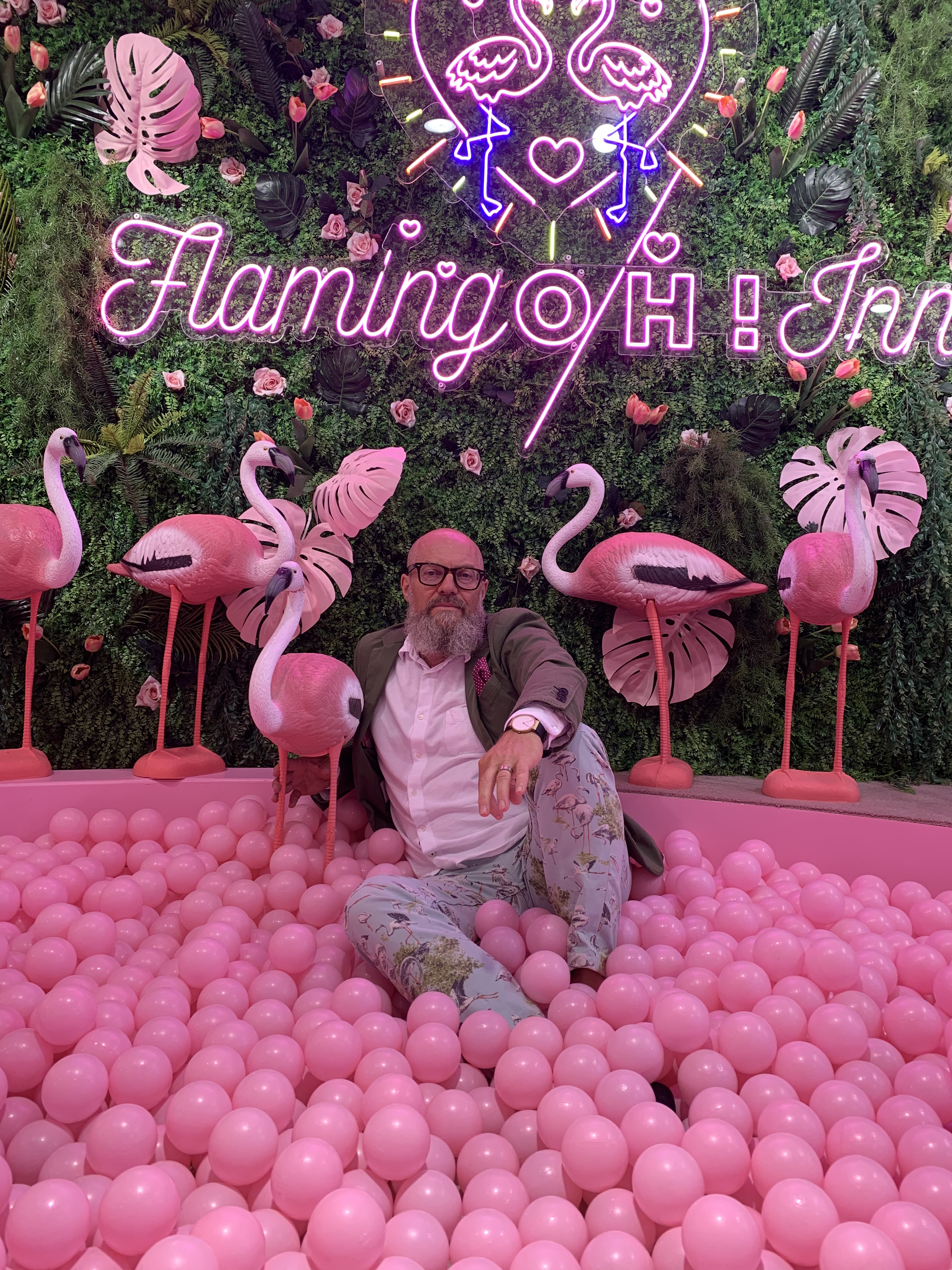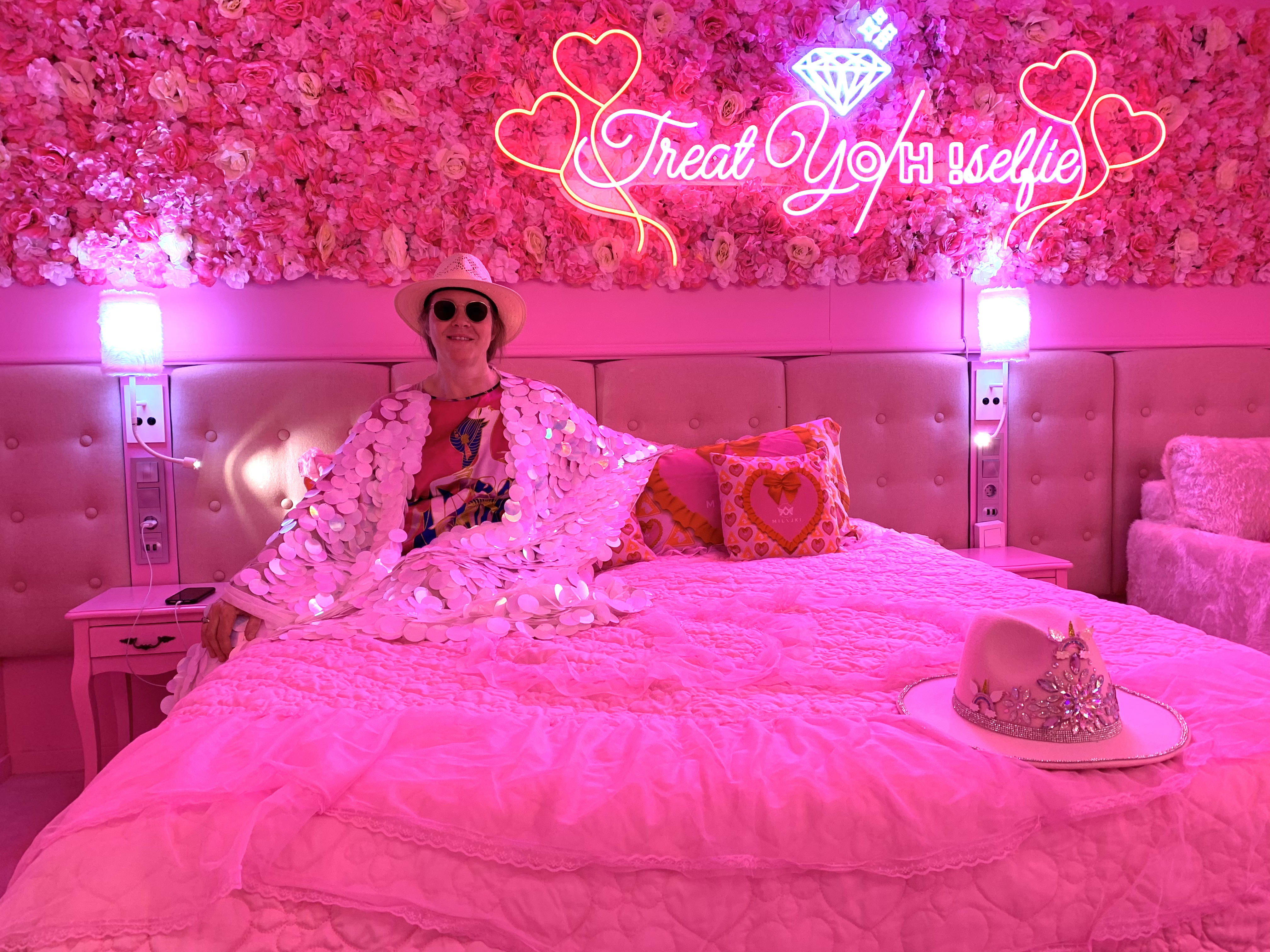 Det är trångt, men ändå hyfsat och respektfullt avstånd i kön och receptionen. Snart är det vår tur och vi får våra rumsbrickor och går med förväntan mot rummet. Det står helt klart vilket det handlar om. Dörren är klädd i vit teddy, inte helt försluten, och då vi öppnar är det för en rosa chock. Härligt! Galet! Barnsligt och uppiggande. Vi hinner knappt in förrän vi börjar ta för oss, eller framför tar bilder av varandra och selfies i det Instagramvänliga rummet. Det är verkligen all in, fullt av trams och glädje, accessoarer att förstärka intrycken, kläder, peruker, hattar… I badrummet tronar lämpligt nog några flamingor i plast, resterna av ett bollhav i duschen, rosa hjärtan på duschväggen… Ja, ni förstår.