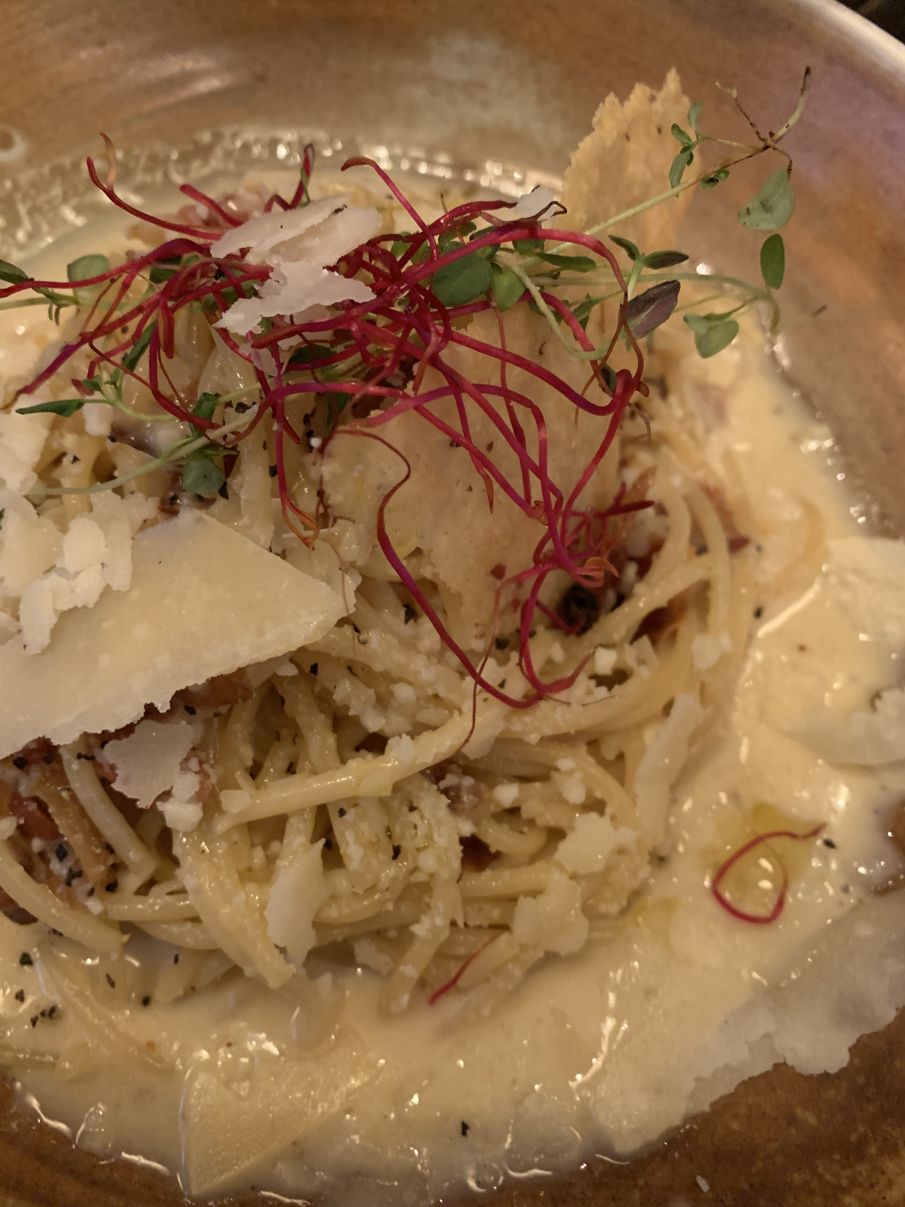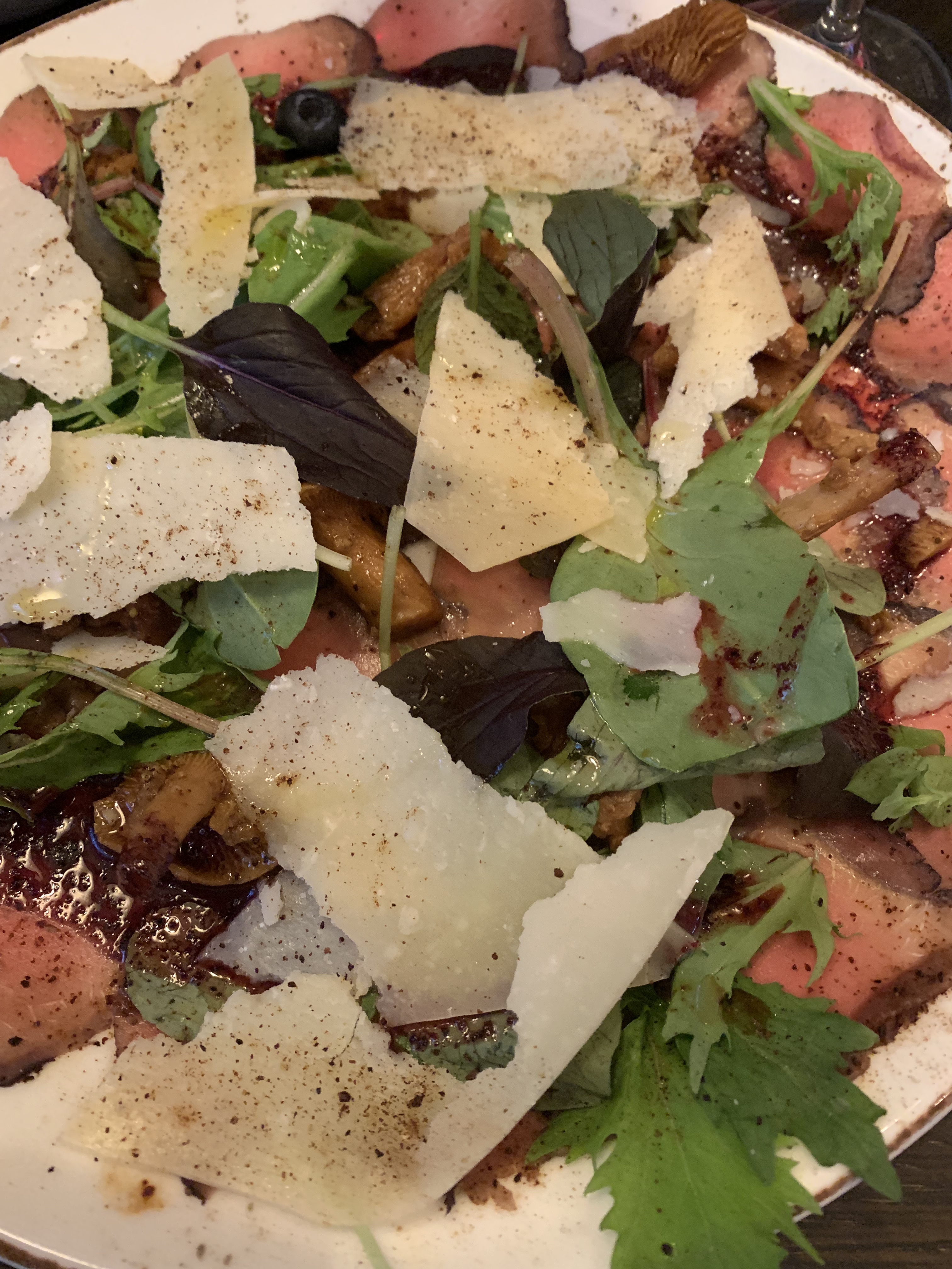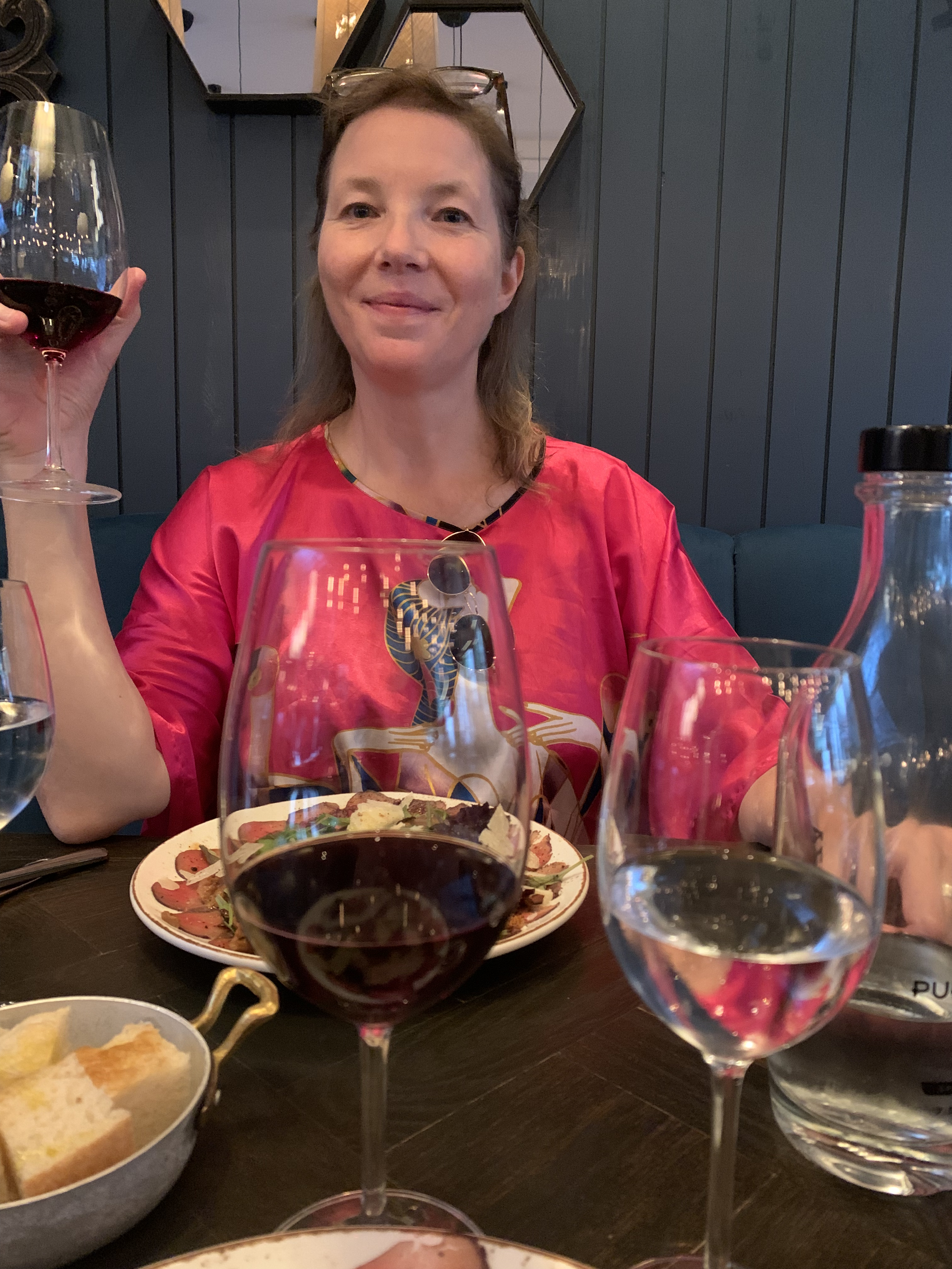 Så gör vi stan. Planerar att äta och går längs med Stora Nygatan mot Bastillionplatsen, stannar vi den nyöppnade restaurangen Klang Market, som trots en stor uteplats inte har något bord ledigt, men som dessutom verkar vara lite för mycket av hippt hamburgerhak. Upp Trädgårdsgatan mot Dorsia, men Z får svindel av priserna. Jag nämner Tavolo på Magasinsgatan, restaurangen i de gamla artilleristallarna, så vi styr mot Vallgatan över Kungsportsplatsens stimmiga rus mot vårt nya mål. Men väl där finns det inte en plats över, förutom i baren. Jag vill inte. Z vill. Men jag känner, att ska jag äta där vill jag insupa atmosfären och lokalen, inte sitta som på nålar på en barstol… Det blir ingen diskussion; jag vänder i dörren och går oförskämt. Så det blir Sorellina på Västra Hamngatan, som vi tidigare haft god erfarenhet av och som inte heller nu gör oss besvikna. Vi gör det lätt för oss, lite lättjefullt, och går på en meny som erbjuder en tunt, fint skuren älgcarpaccio med kantareller, parmesan, ruccola, lime som förrätt, till huvudrätt carbonara med guanciale, pecorino romano, äggula och svartpeppar plus en tiramisu, som efterrätt (den enda som föll ur ramen i denna annars så perfekta middag) och mineralvatten samt Amarone della Valpolicella till plus kaffe till desserten.