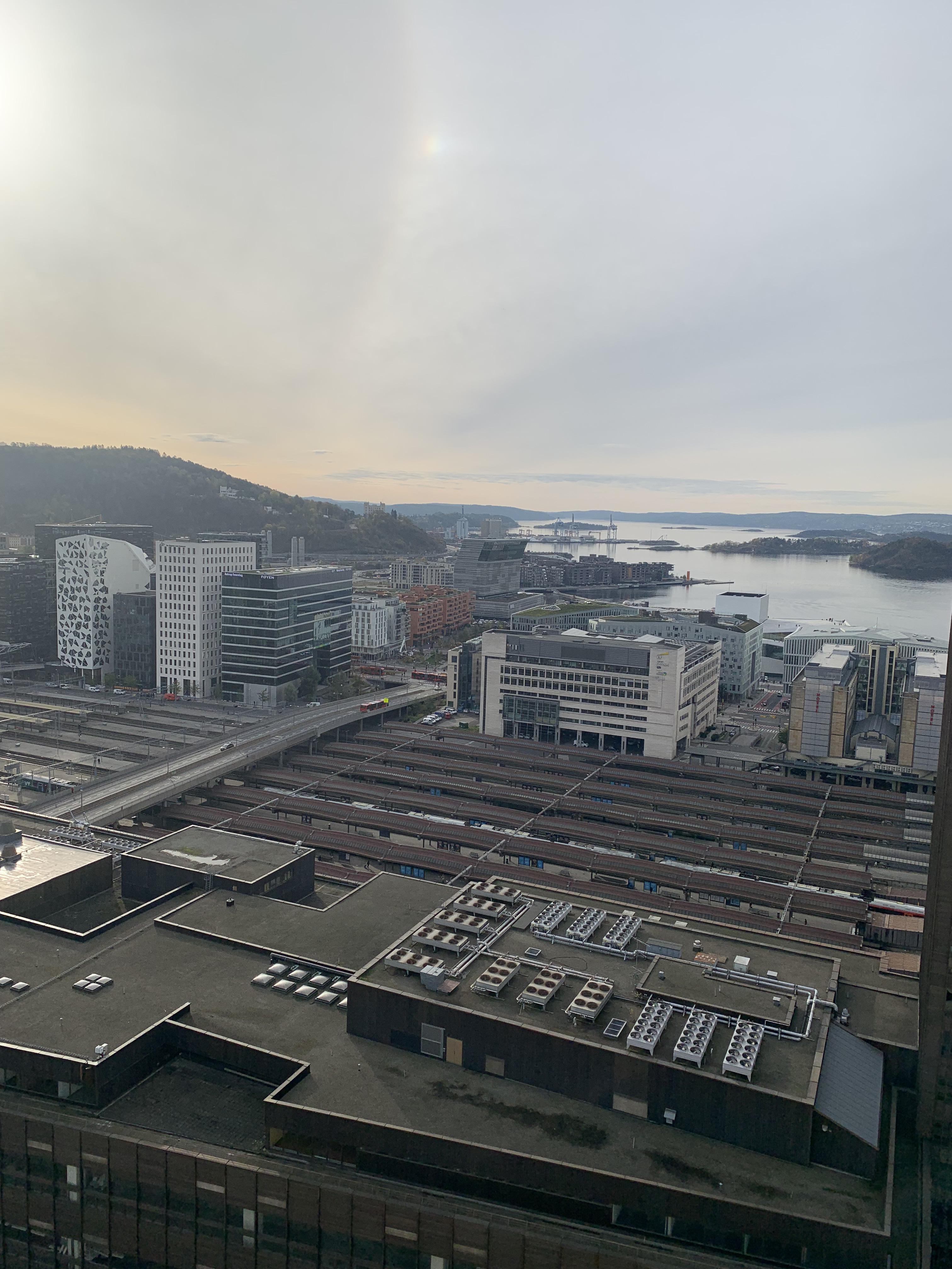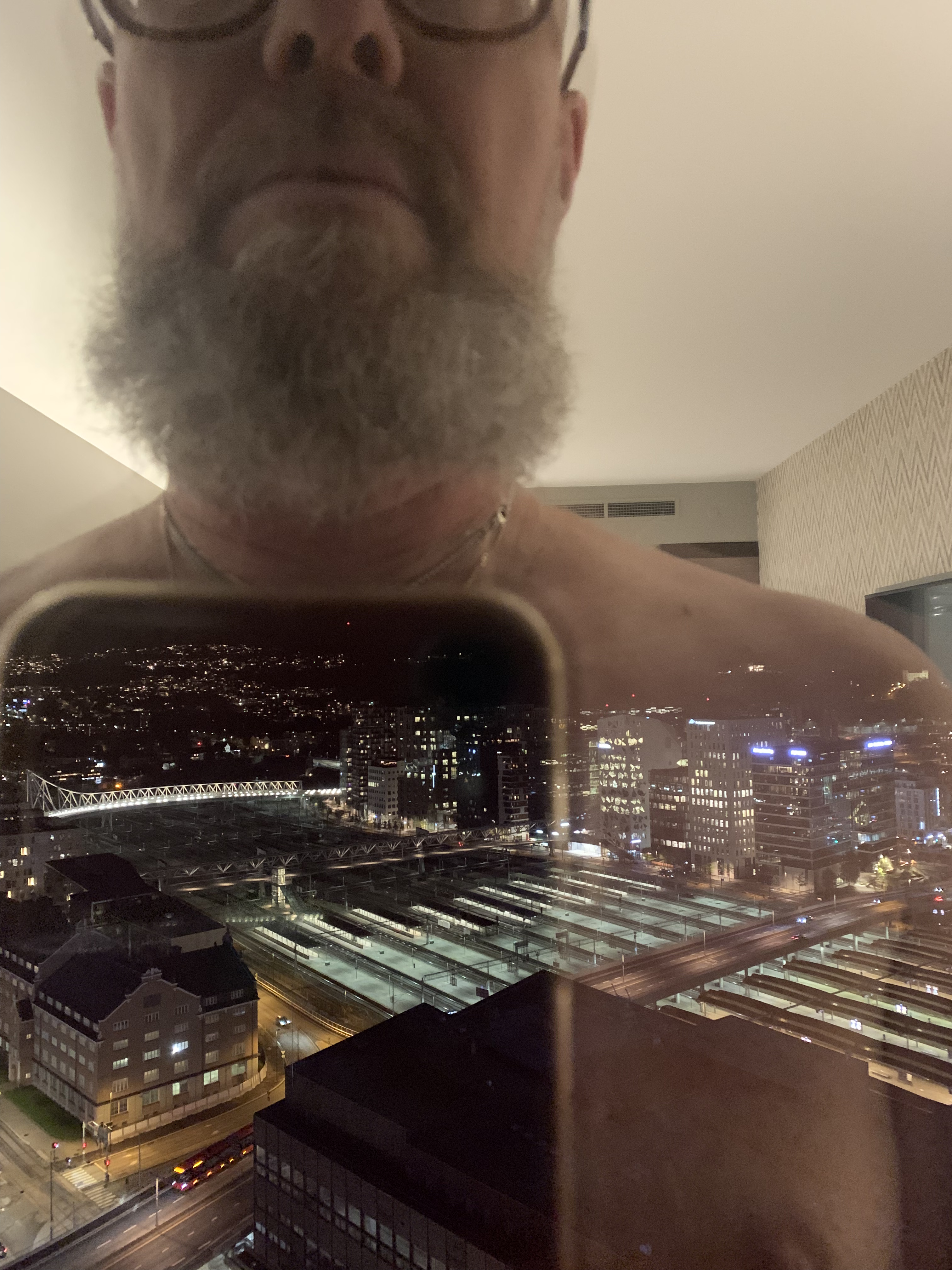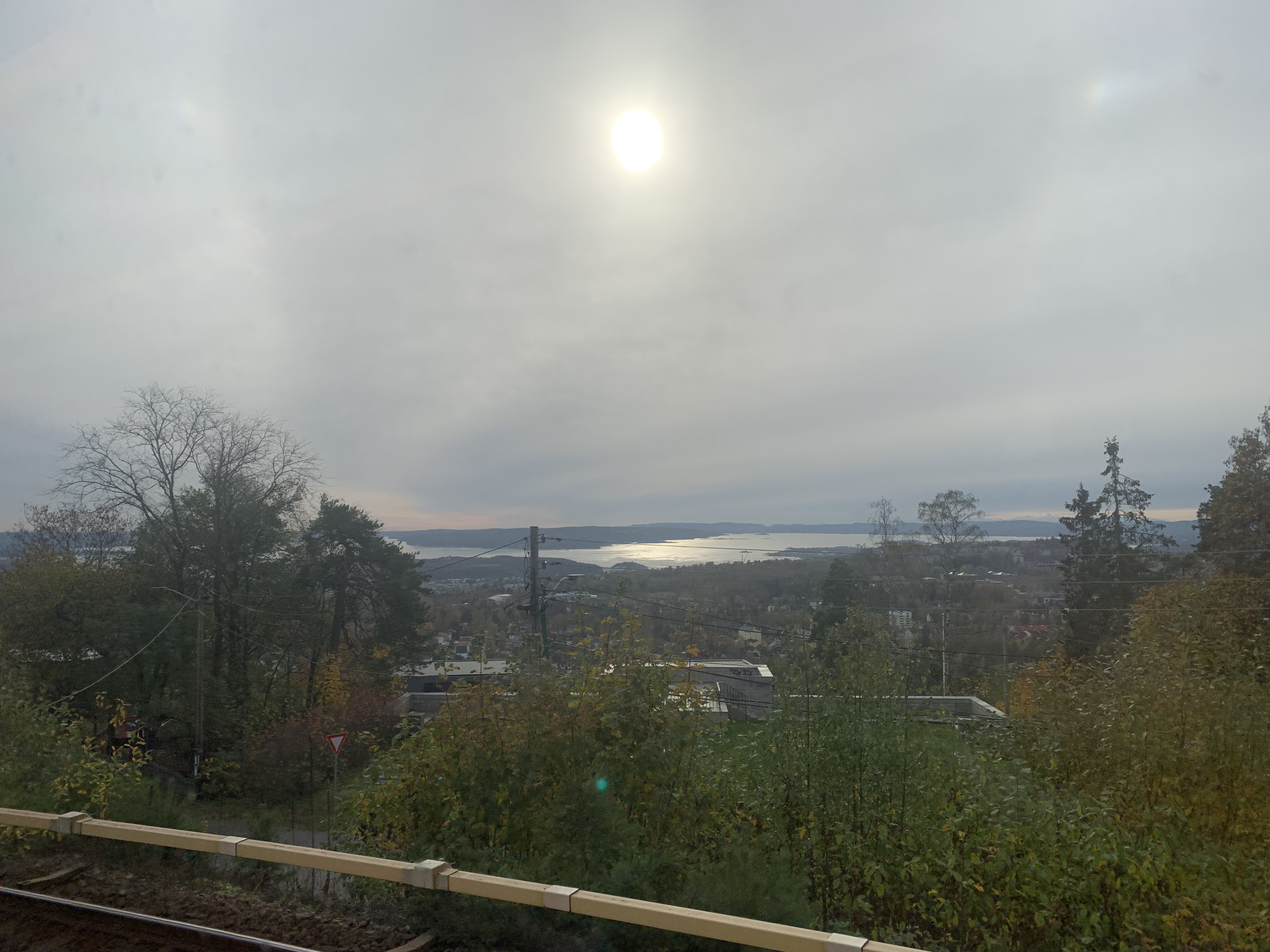 Vi har blivit bortbjudna för kvällen, har en tid att passa strax efter fyra, inser att vi har både tid att köpa en flaska vin och att ta en lur, eftersom natten blev kort innan resan. När vi kraschar i hotellets sängar är det för omedelbar sömn och en knapp timme senare skakar vi liv i våra sömndruckna kroppar, klär oss, tittar på utsikten, tar hissen ned och möter så småningom vår dejt vid busshållplatsen för färd återigen på E6 med buss österut. Syrrans yngsta dotter och hennes fru har köpt hus och efter sina år i Oslo etablerat sig allt mer. Vi har inte setts sedan hennes födelsedag sommaren 2019, så det finns mycket att ta igen. När vi kliver av möter hennes fruga med hund och samkvämet fortsätter. Parhuset de bor i är fantastiskt och sakta formar det unga paret det till sitt. Maten slukas av under och njutning, vin dricks, en cognac slank ned som uppvärmning, en finrom efter efterrätten. Jag firas med en fantastisk present från paret och syrrans övriga ungar med familjer. Sedan tackade vi för oss, fick sällskap på hundpromenaden, ned till Ellingsrudåsens trickenstation, som man når via en lååååång tunnel. Så in mot Oslo centrum, hotellet och godnatt utan att stänga den vidunderliga utsikten ute.