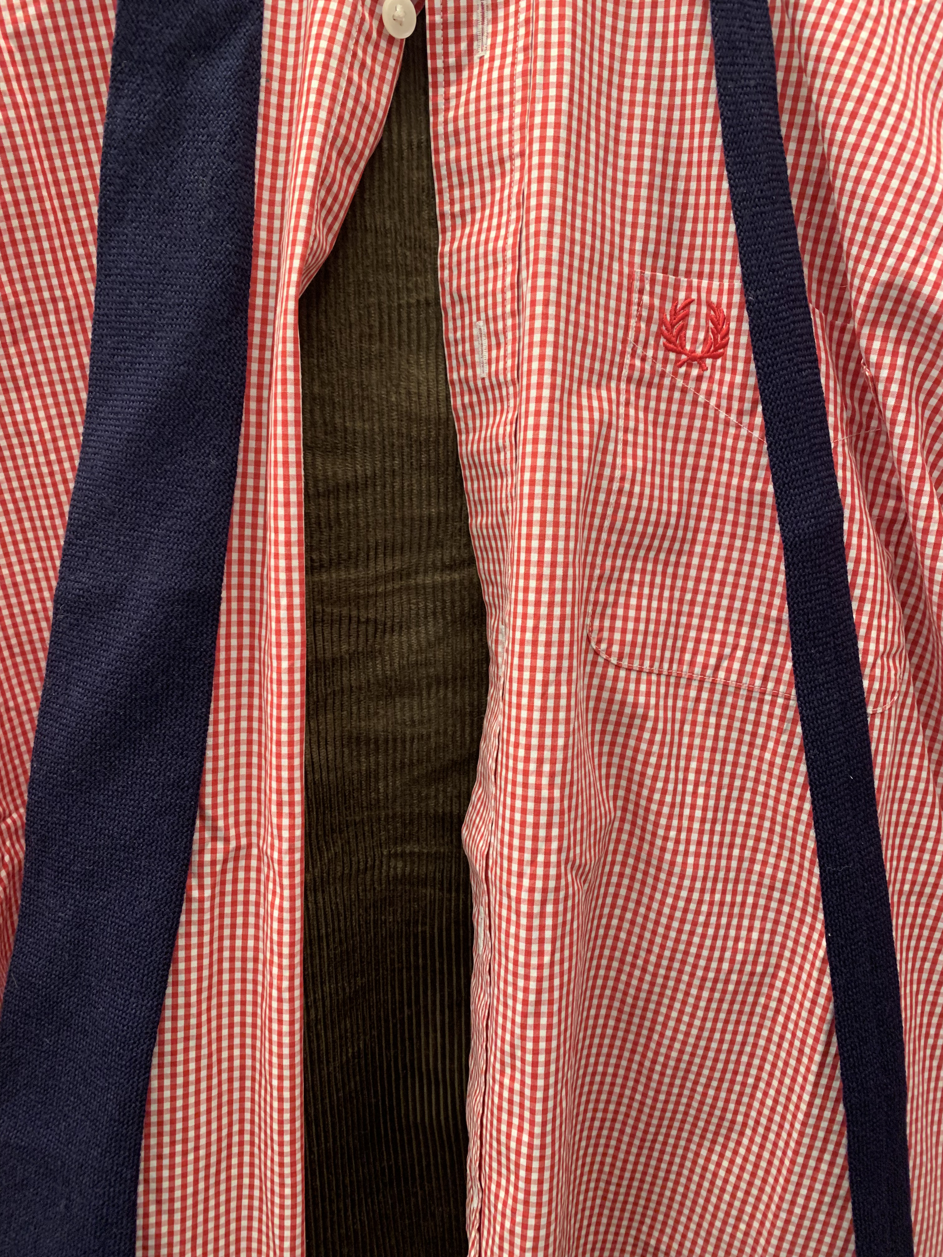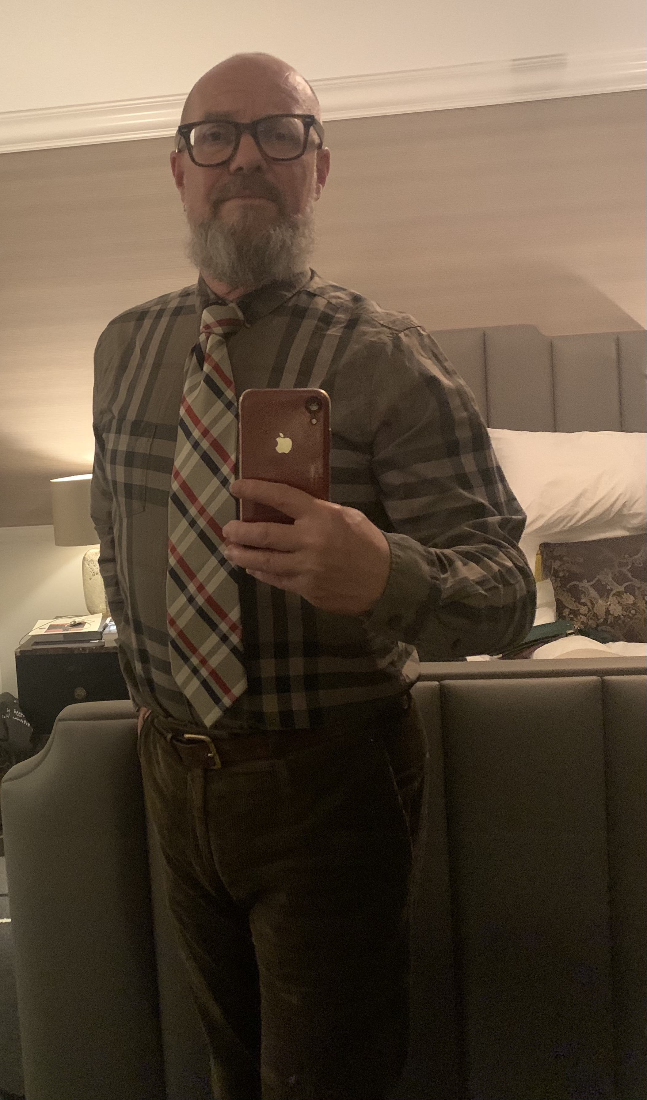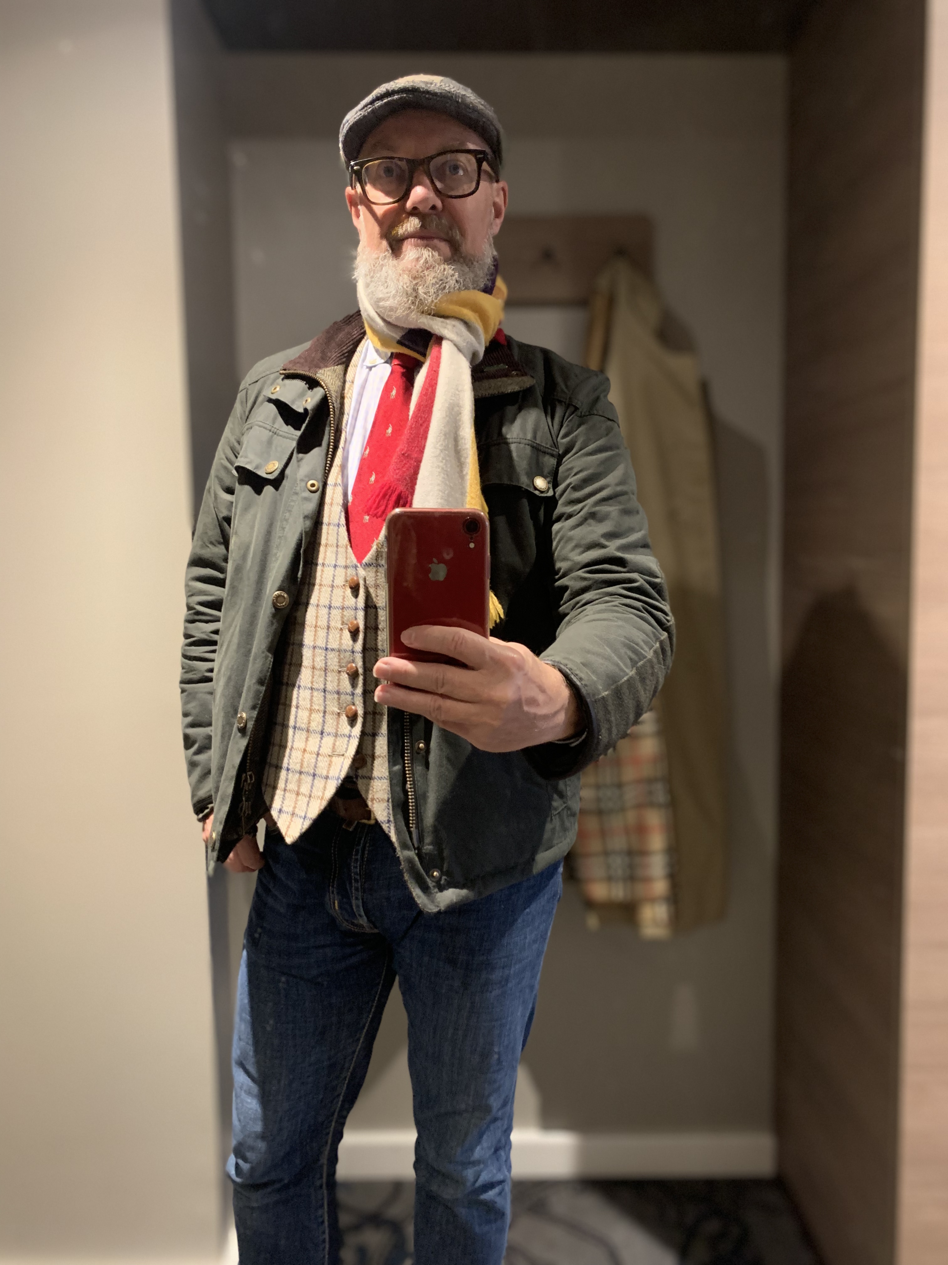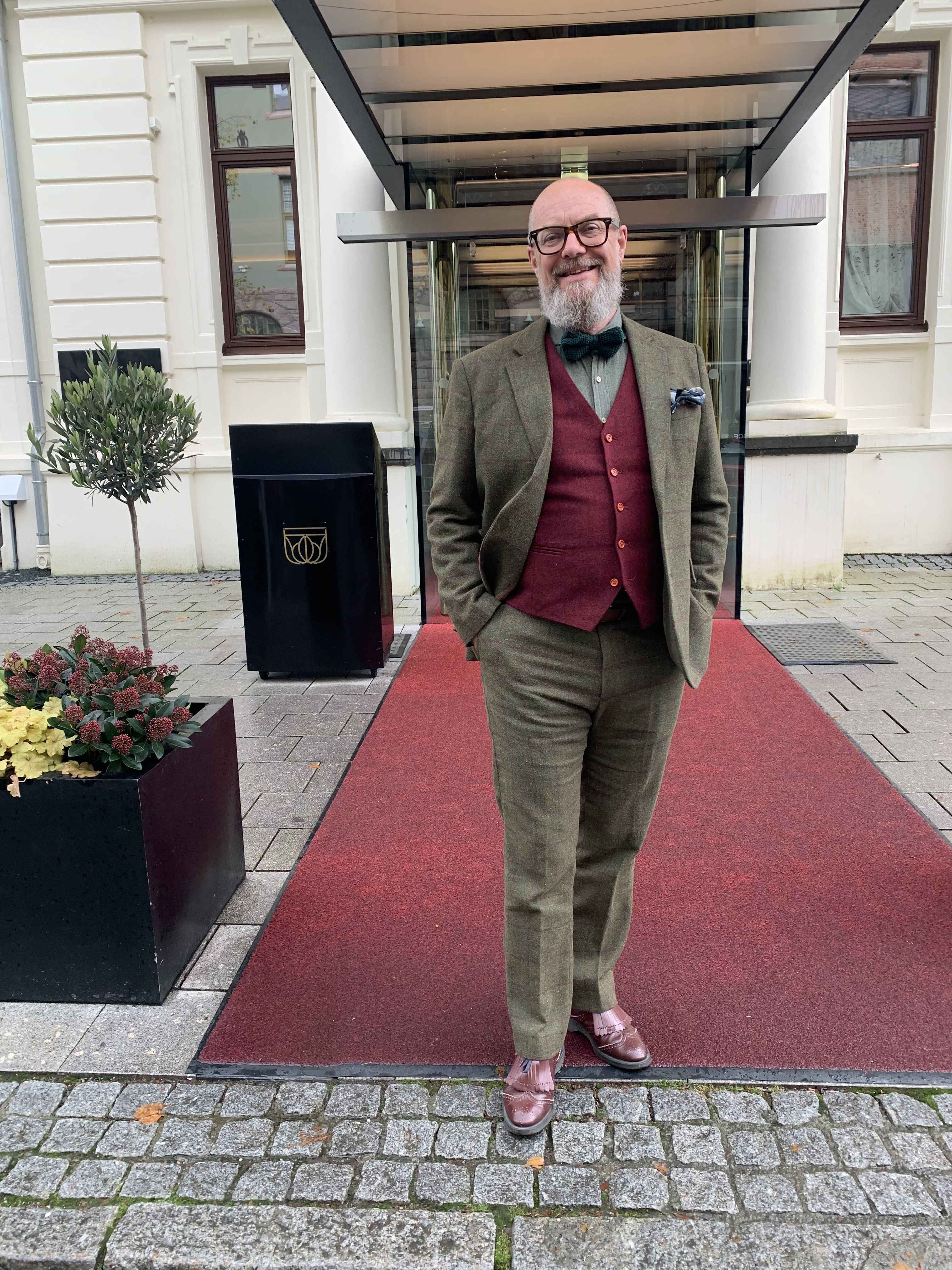 Britannia hotel, alltså. Jo, min garderob var given. Till resan hade jag packat ned min tweedkostym (Tweedmaker) , den tredelade, som jag fick av Z i julklapp senast. Till det en grön Stenströmskjorta (köpt i Halmstad), två alternativa slipsar – Morris/Ralph Laurent Polo – och mina Dr Martens brogskor med fransade flärpar i ett slags försök att ge en golflook. Sällan använda och 30 år gamla, men nu fyller de syftet. På resan upp har jag mina Jacob Cohenjeans (Ragtime herr), en ljusblårutig Etonskjorta (Stadsmissionen Mölndal galleria), en en rutig Oscar Jacobsonväst (Ragtime herr), min fina Vardoc of Oxfordslips (Cirkeln secondhand, Mölndal), Barbourjacka (Ragtime herr), en Johnston of Elginhaldsduk (Stadsmissionen, Mölndal galleria), min tweedkeps från Dublin och de tidigare nämna Clarkskorna. Dessutom, som extra allt, Burberrytrenschen som jag fyndade på Reningsborg våren 2015. Som komplement till garderoben – även de nämnda – manchesterbyxorna, de bruna Oscar Jacobson, Burberryskjortan, en röd- och vitrutig Fred Perryskjorta, en Morrisslipover. Jo, resväskan var stinn.