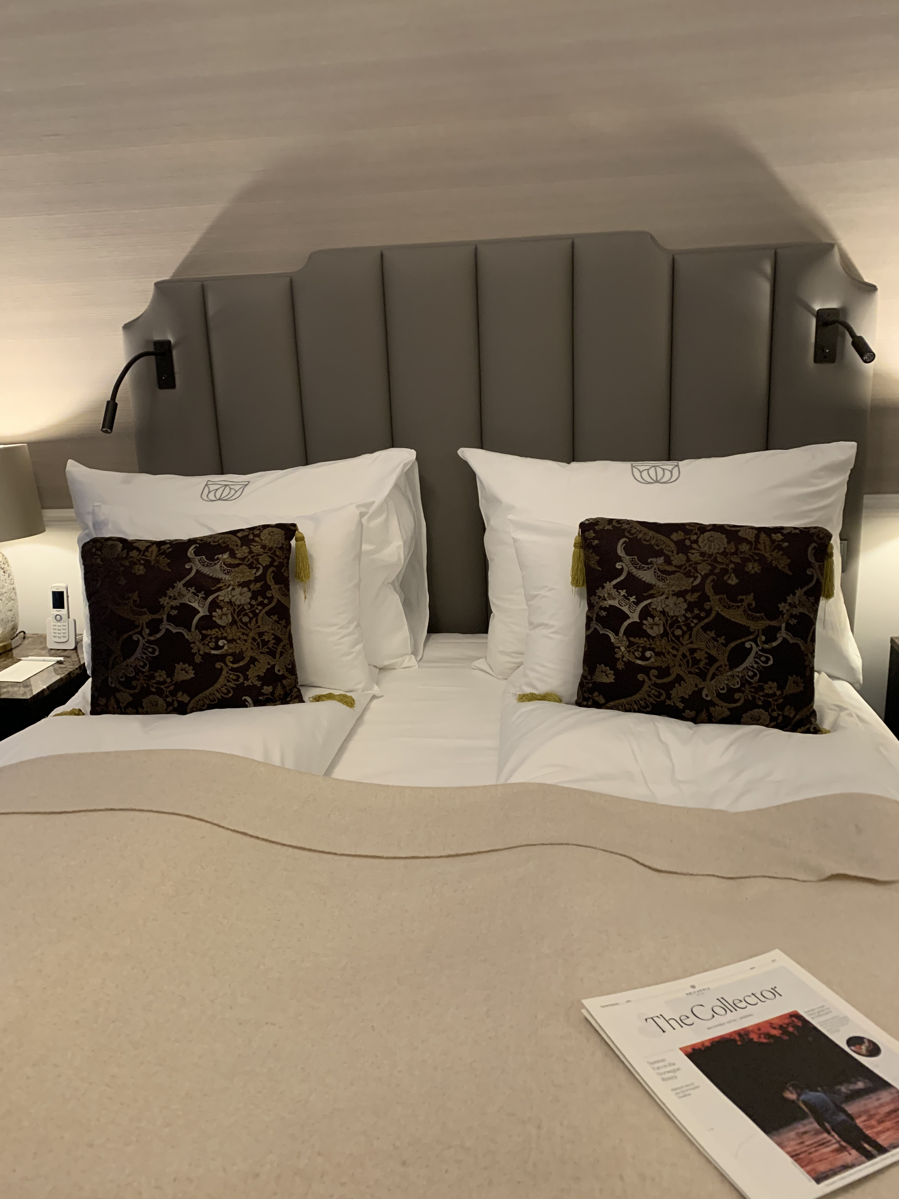 Vi går mätta, nöjda och lyckliga upp till vårt hotellrum. Omfamnas av varandra, men också av sängen, kikar på ”Kastanjemannen” (jag vet vem som är mördaren; jag har läst den spännande boken av Søren Sveistrup) innan vi somnar i den av hotellets kvällspersonal uppbäddade sängen. Jo, mellan 18 och 20 kommer de och gör iordning för natten, tar bort prydnadskuddar och filtar, bäddar försiktigt upp, fluffar till kuddarna, placera en flaska vatten med glas vid vardera nattduksbord, sänker temperaturen och ställer in belysning på kvällsmood. Bortskämt…? Japp. Men trevligt.