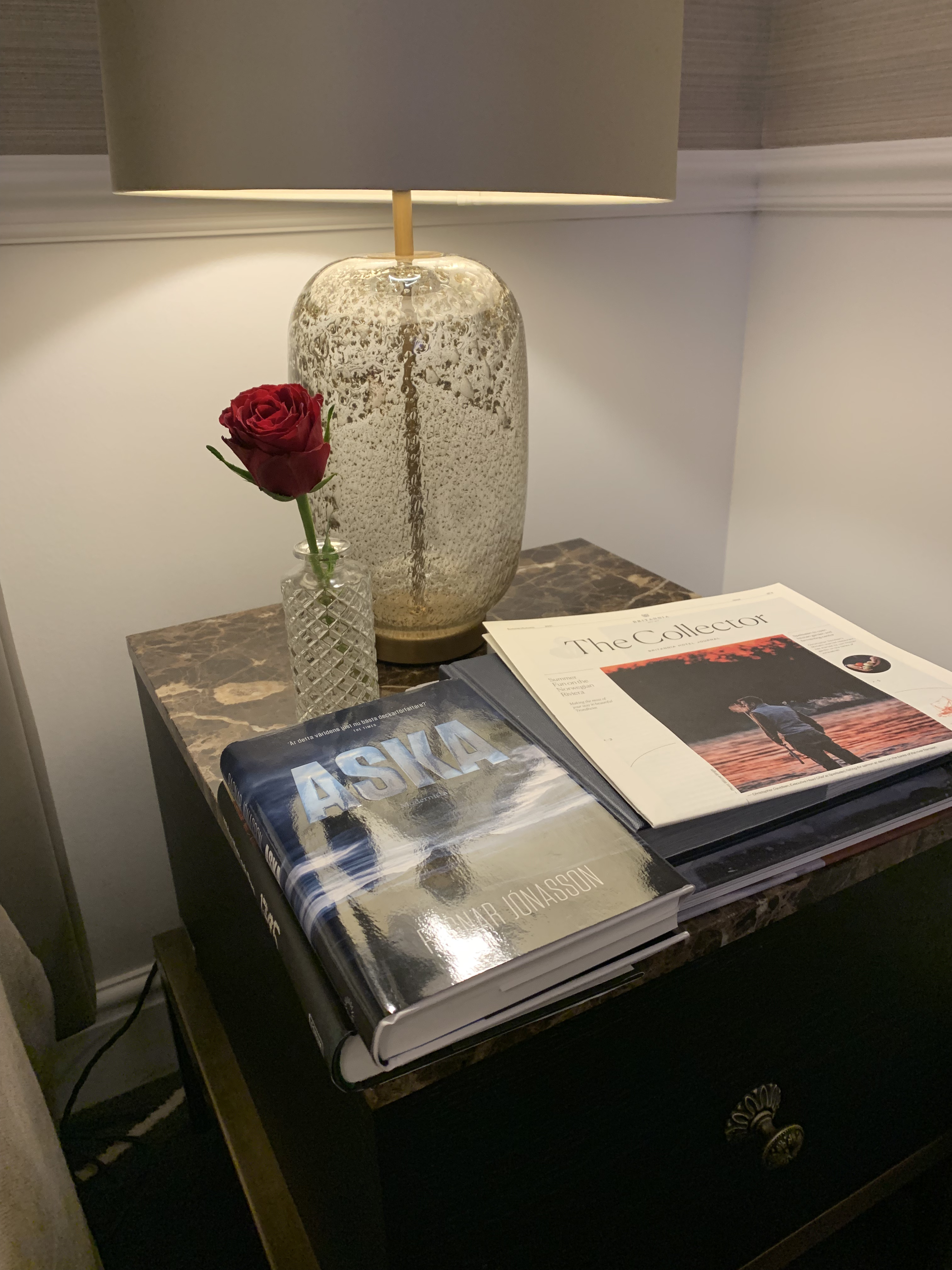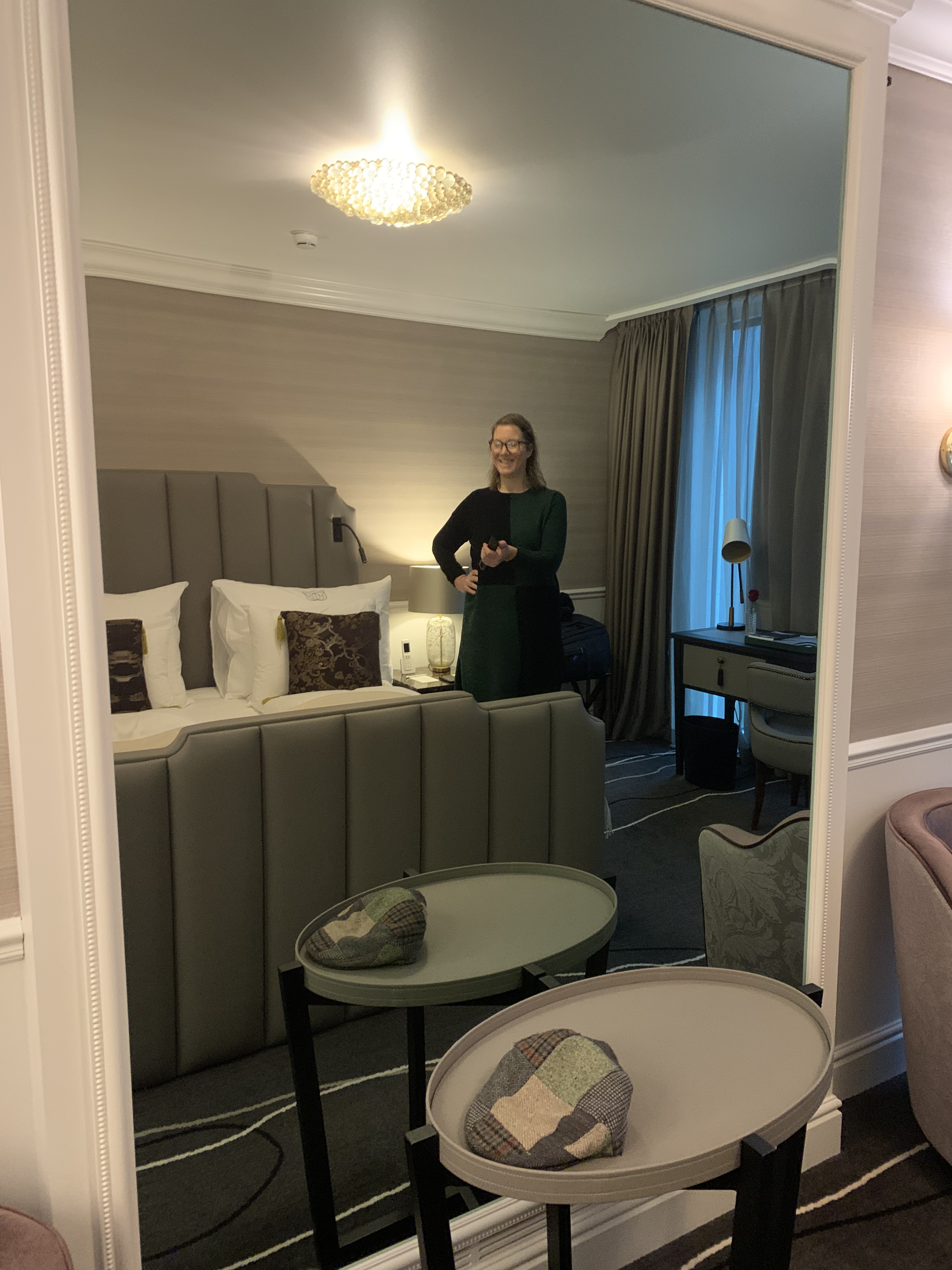 Z har bokat rummen i god tid. Hon har valt lyx för sin man som ska fylla definitivt gubbe inom någon dag. Trots att vi gick husesyn den där sommaren 2019 är det med vidöppna ögon vi går genom hotellet och öppnar dörren till vårt rum. Nej, det är inget stort rum, men det finns en omfamnade känsla, inte bara för de inbjudande Hästensängarna. Badrummets golv är skönt värmande, allt är stil från toalett till tvättstället med två hoar, som vi inte behöver konkurrera om, och den behagliga duschen.