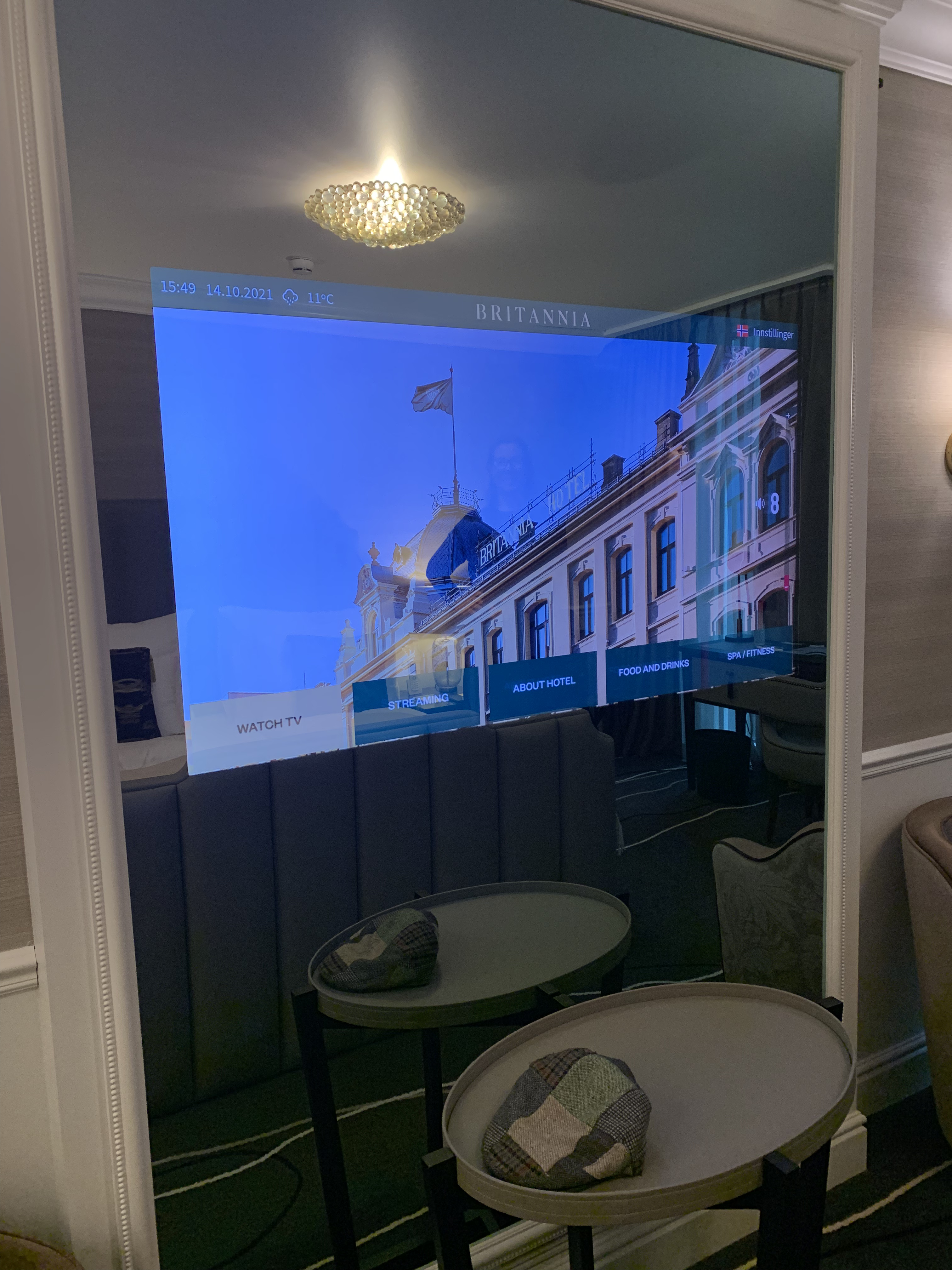 I fotändan av sängen, eller mer korrekt väggen en bit ifrån sängen, tronar en spegel från golv till tag. Jag frågar Z om det verkligen inte finns någon teve, men kanske har hotellet en tanke med det, att man ska till vara på varandra och inte fastna fram Netflix när man nu lyxar till det. Min hustru är smart, hittar en fjärrkontroll och slår på en tv, som plötsligt, som trolleri, dyker upp i spegeln. Vi knockas återigen. Här kommer vi trivas.