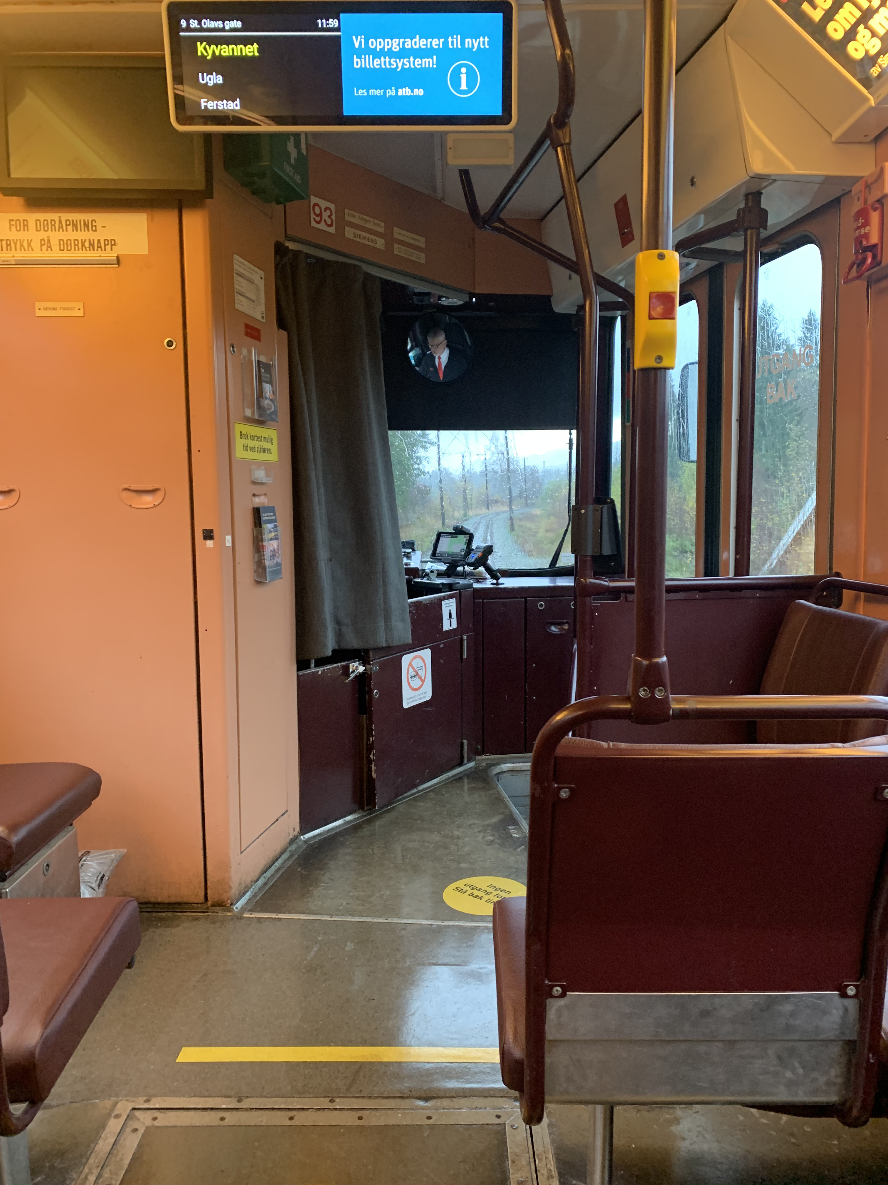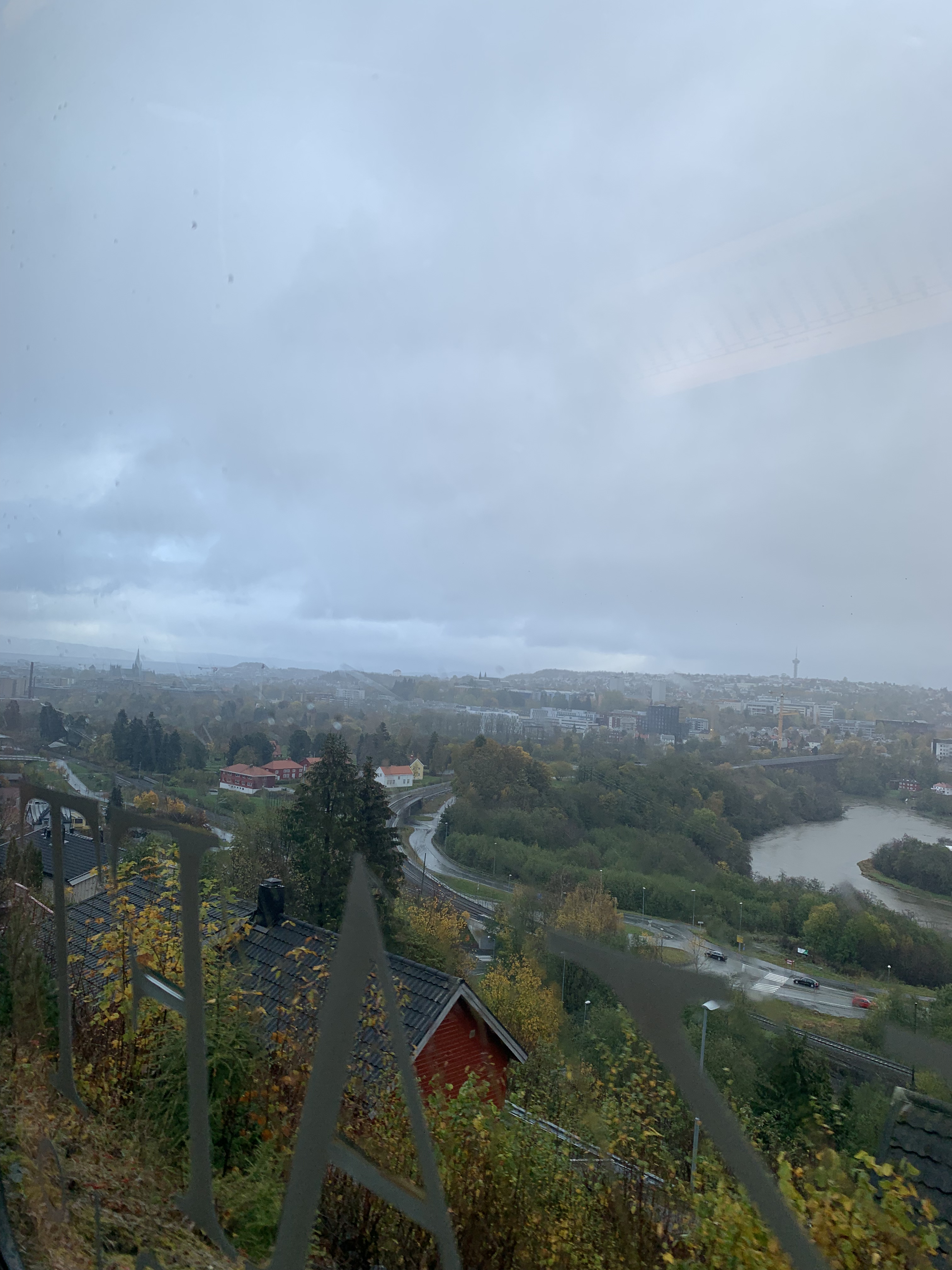 Sträckan, på nära 9 kilometer, tar oss från Sankt Olavs gate i centrala stan till Lian, en nätt klättring 233 meter ovanför havet, förbi stadsmiljön, upp genom förortens villakvarter till Trondheims nära fjällmiljö och friluftsliv. Vi hittar rätt, får hjälp av föraren att ladda ner giltig app, betalar för vår resa och efter en stund rör sig vagnen för vår färd på 50 minuter tur och retur.