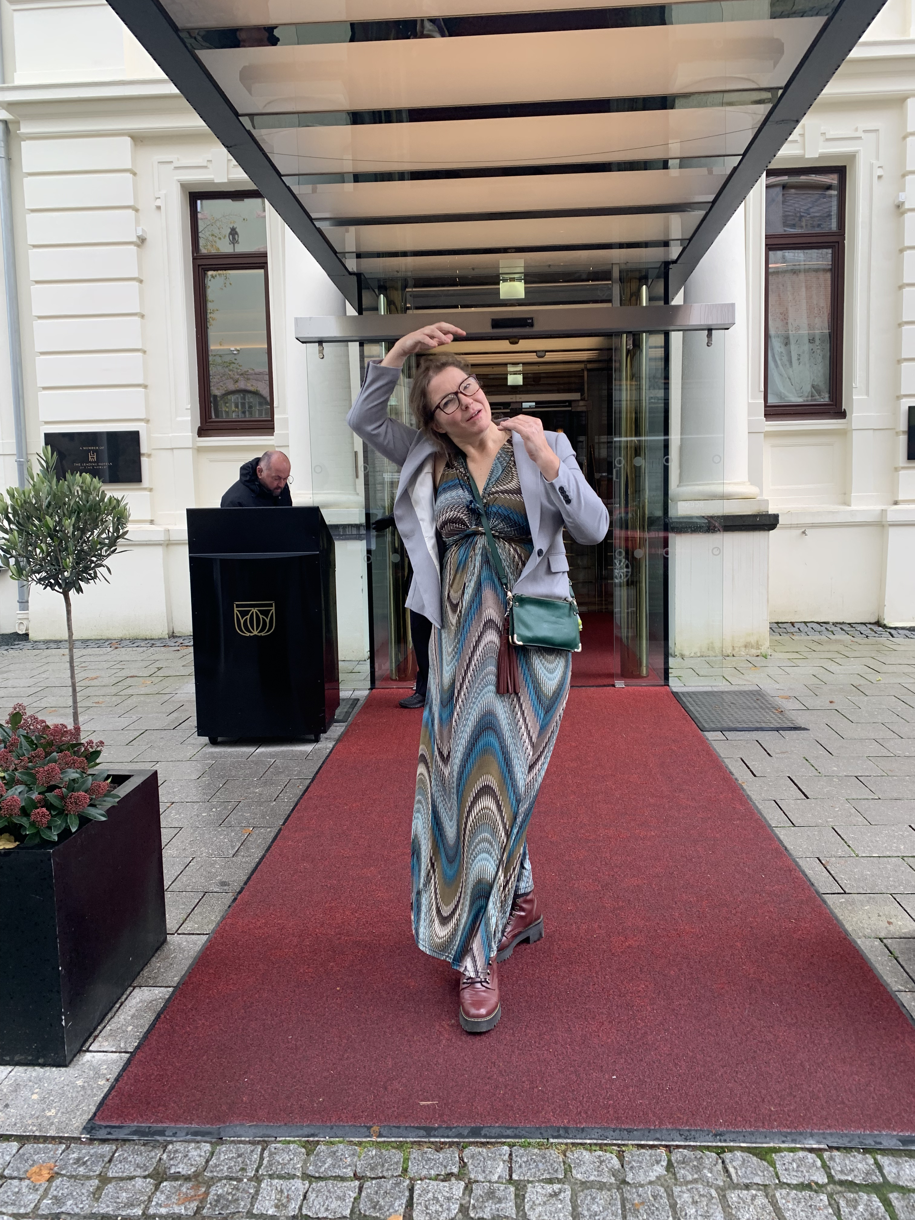 Regnet hämtar andan för att släppa på igen. Vi går in på Rema 1000 på Torvet, köper bubbelvatten, jordnötter, chips och konstaterar att julmusten är tidig till försäljning även i Norge. Z hittar en blomsterbutik och köper ett fång rosor som nogsamt slås in i cellofan för den hågade pensionisten. På vägen till hotellet smiter vi in på Kaffebrenneriet för köp av macka och quiche lorrain till lunch. Väl på plats låter vi oss smaka, dricker te till och lite bubbelvatten och färdas sedan in i våra drömmar ett tag. Jag läser lite ur Ragnar Jónassons ”Aska” för en tur till norra Island. Vi kikar på tv ur spegeln, gör oss i ordning för kvällen, för Z har bokat bord nere i vinbaren. En plats som lockades oss den där magiska stunden, juli 2019, med sina charkuterier och viner. Vi har bord 20.00. 21.00 kommer underhållningen. Allt är sobert. Jag har, eftersom vi bor på Britannia hotel, valt brittisk. Så det blir bruna manchesterbyxor (Oscar Jacobson, Reningsborg för några år sedan), en Burberryskjorta med tillhörande slips (Cirkeln secondhand i Mölndal respektive Ragtime herr, Göteborg) enligt tesen more is more. På fötterna mina Clarks, med brandgula skosnören, som renoverats med orange sula och klack hos Mölndals skomakeri. Samma skor som jag förövrigt, av slumpen, hade senast jag frekventerade hotellet.Z är smashing i en ylleklänning från Next, som jag köpte till henne vid ett Londonbesök.