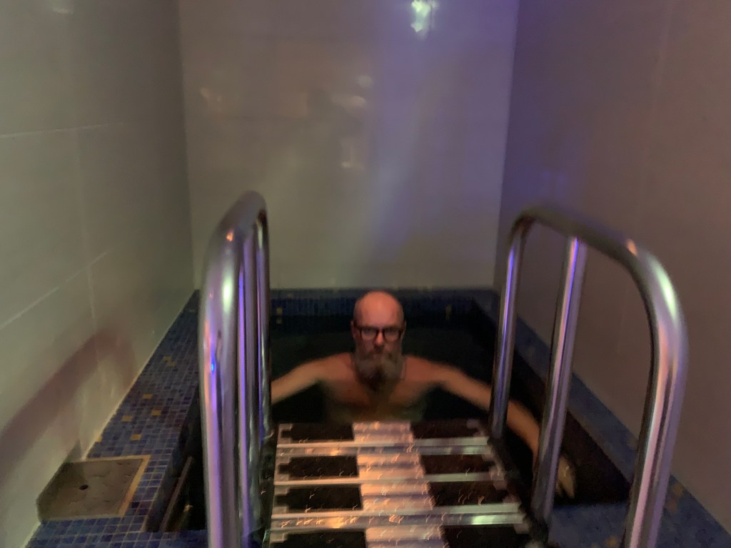 Miljön är som stämningen sober. Vi är som gäster till något som inte är vi, men som vi ändå stämmer in i. Timmen, den dryga, dansar iväg och vi dansar förtjusta ut och upp på hotellrummet för att planera resten av eftermiddagen och kvällen. Det blir hotellets spa, där vi bryter av mot det stundande bröllopets gäster med kvinnor i vackra klänningar och männen i pingvinuniformer när vi kommer gående i tofflor och bakrockar med badkläder inunder. Vi tar hissen ned till källaren, går i korridorerna och träder in i spavärlden. Inleder med bassängen, några längders simmande, tar en varmvatten pool, går vidare till de olika bastur som finns, värmen driver oss på flykt och vi svalkar oss med isbitar (!) innan vi går in i en ångbastu, tar en dusch, upptäcker kallvattensbassängen som jag kliver ned i för att stanna en kort, men ändå inte hastig, stund. Det är behagligt. Vi nöjer oss, går upp till rummet och klär på våra rentvagade kroppar.