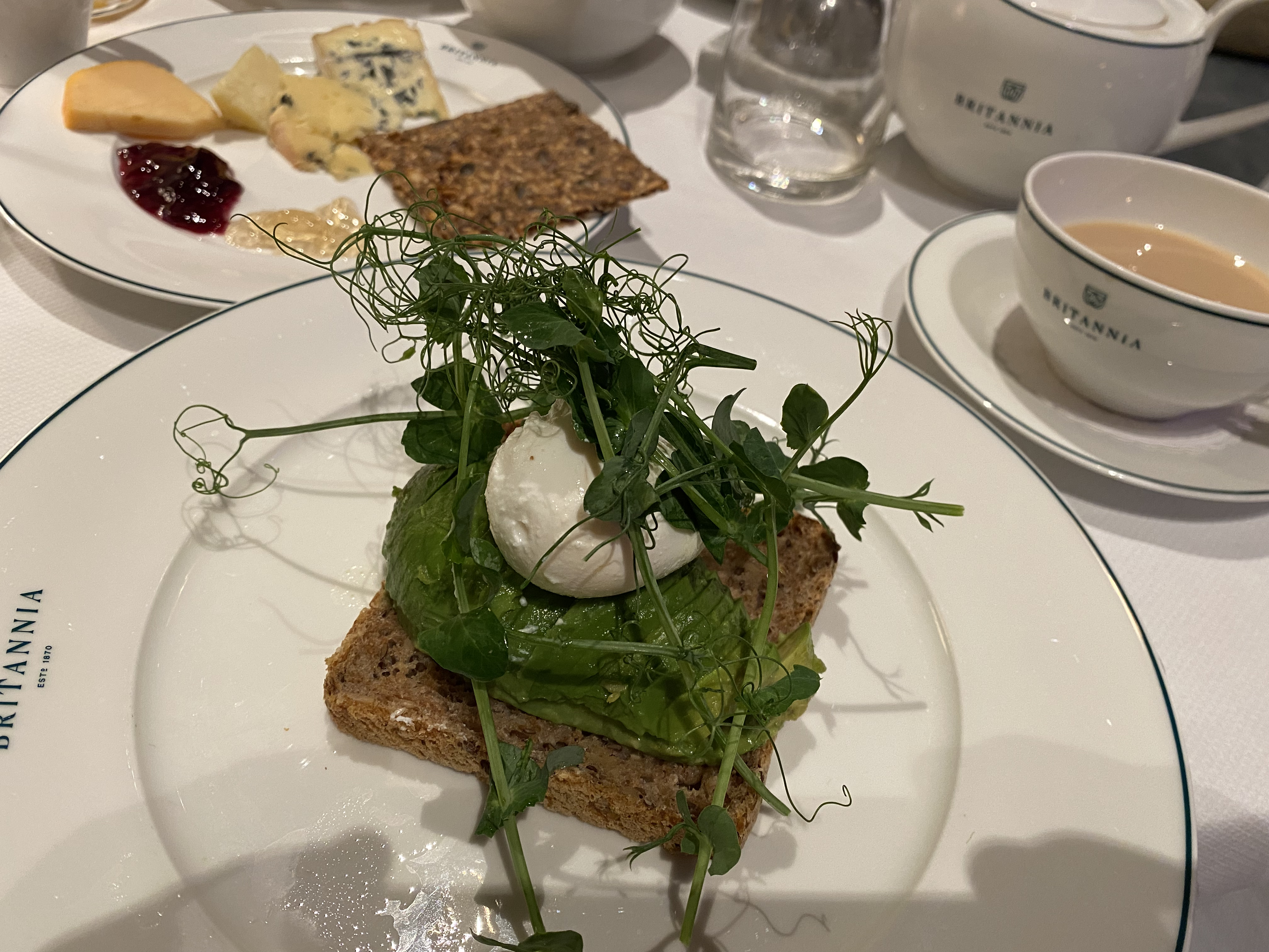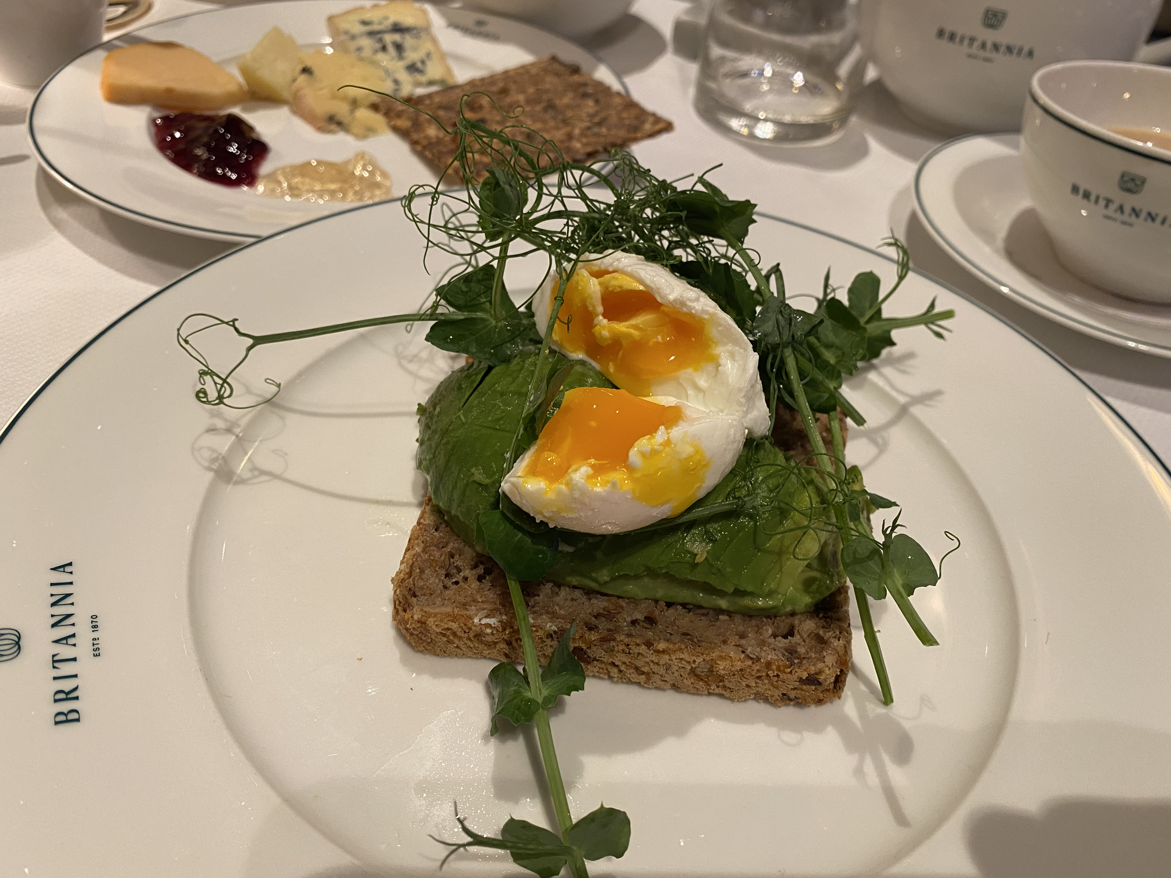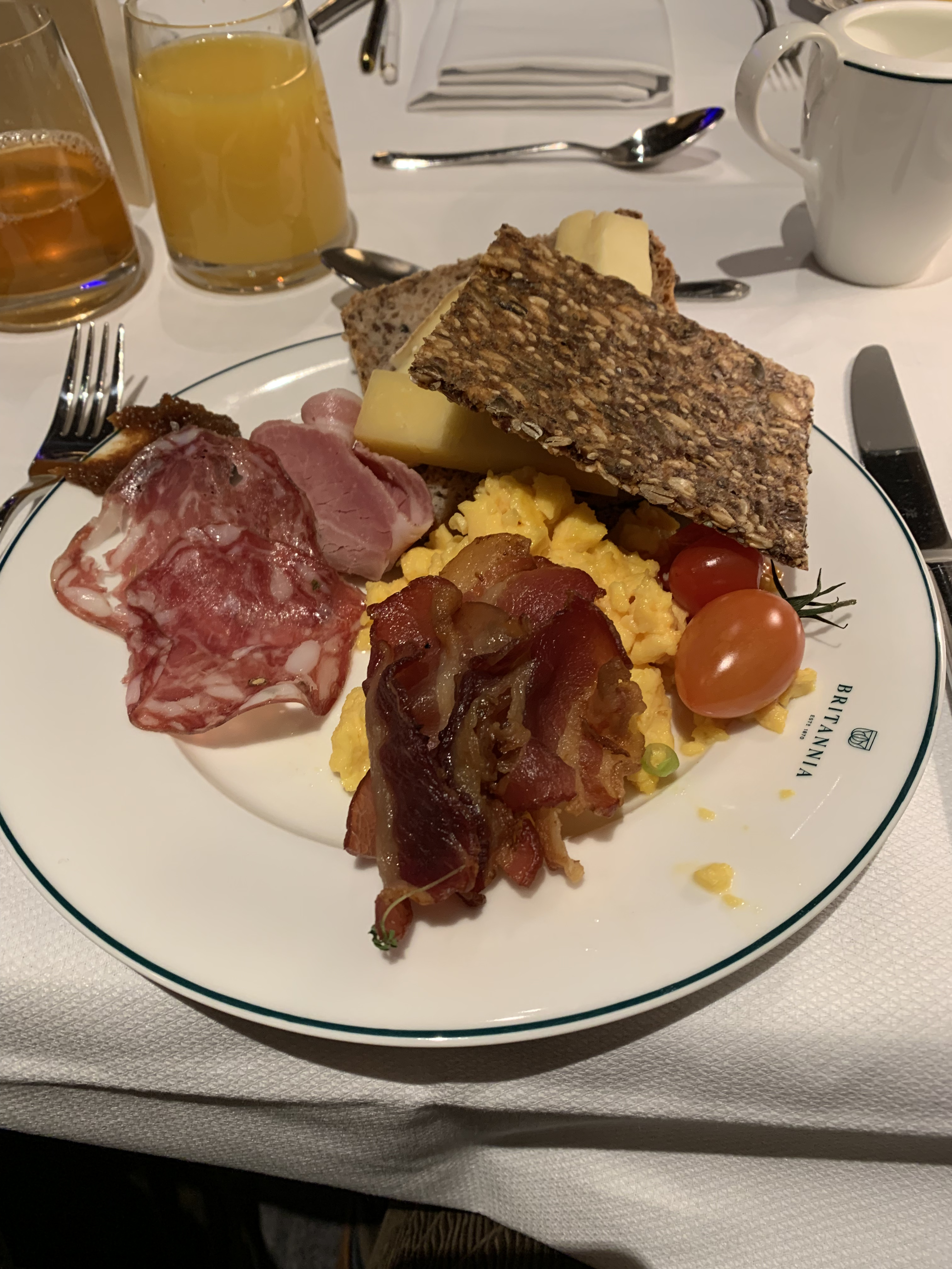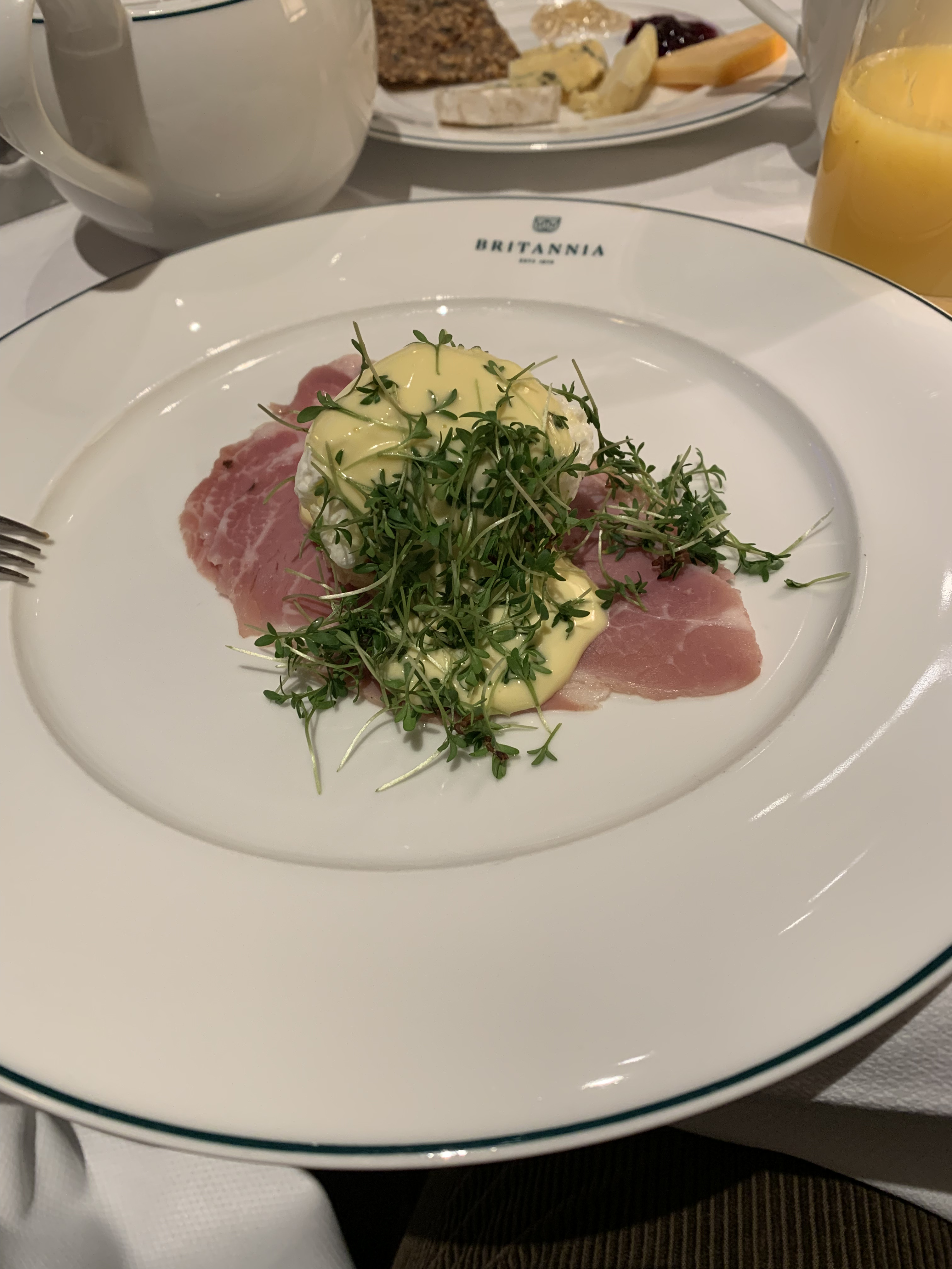 Vi vaknar medvetna om att vi gör våra sista timmar på Britannia hotel, kanske någonsin. Vi packar, gör oss i ordning för morgonen och vår final i frukostmatsalen. Njuter av varje tugga, sköljer för dagen ned med te, beställer in ägg Benedict, låter stunden stanna tiden, hör pianisten ta över och kikar sedan på klockan. Flygbussen väntar. Dags att ta farväl och checka ut.