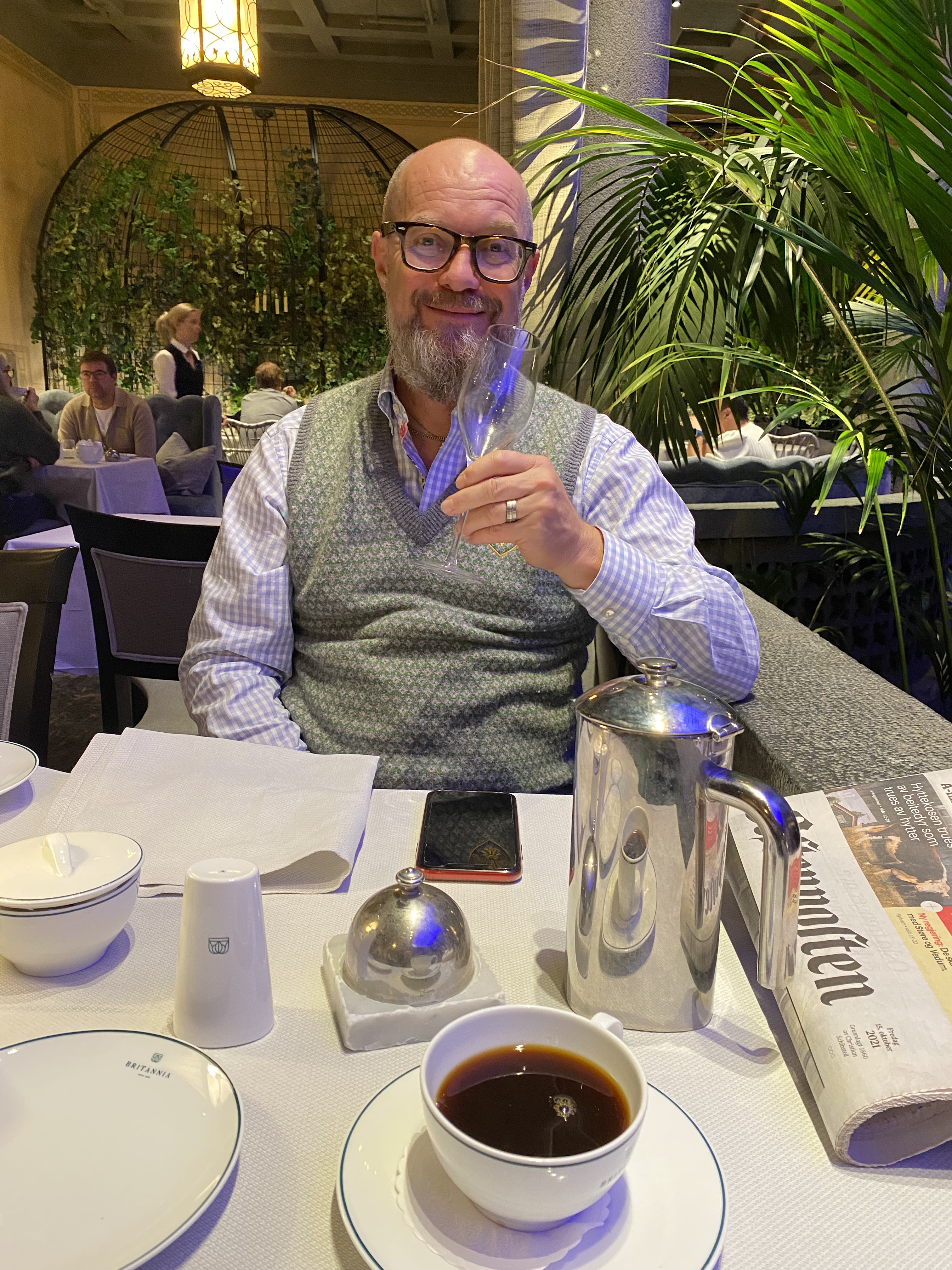 Rummet är mörklagt. Man sover gott och länge. Sängarna är sköna. Jag förstår att hustrun passar på. Men ska verkligen jag väcka henne? Hon har ju en make att gratulera! Nå, jag gör mig i ordning, hon vaknar sakta till liv. Vi förenas för en promenad nedför hotellkorridoren, hissen ned till foajén och mot frukostmatsalen, där gästerna samlats tidigt. Vi får vårt bord, en ung norska med pigg blick visar oss, kommer med kaffe och vi kan börja ta för oss av den digra buffén, där inget finns att sakna. Om man till äventyrs ändå gör det finns en meny som man kan beställa från, så varför inte pocherade ägg…? De kommer snabbare än vi hinner andas, är så delikata som man bara kan drömma om och när jag ser ett sällskap få in champagne till morgonmaten noterar älskade Z detta, beställer utan att blinka varsitt glas till oss och vi skålar för min ålderdom, eller vad man nu ska kalla det.