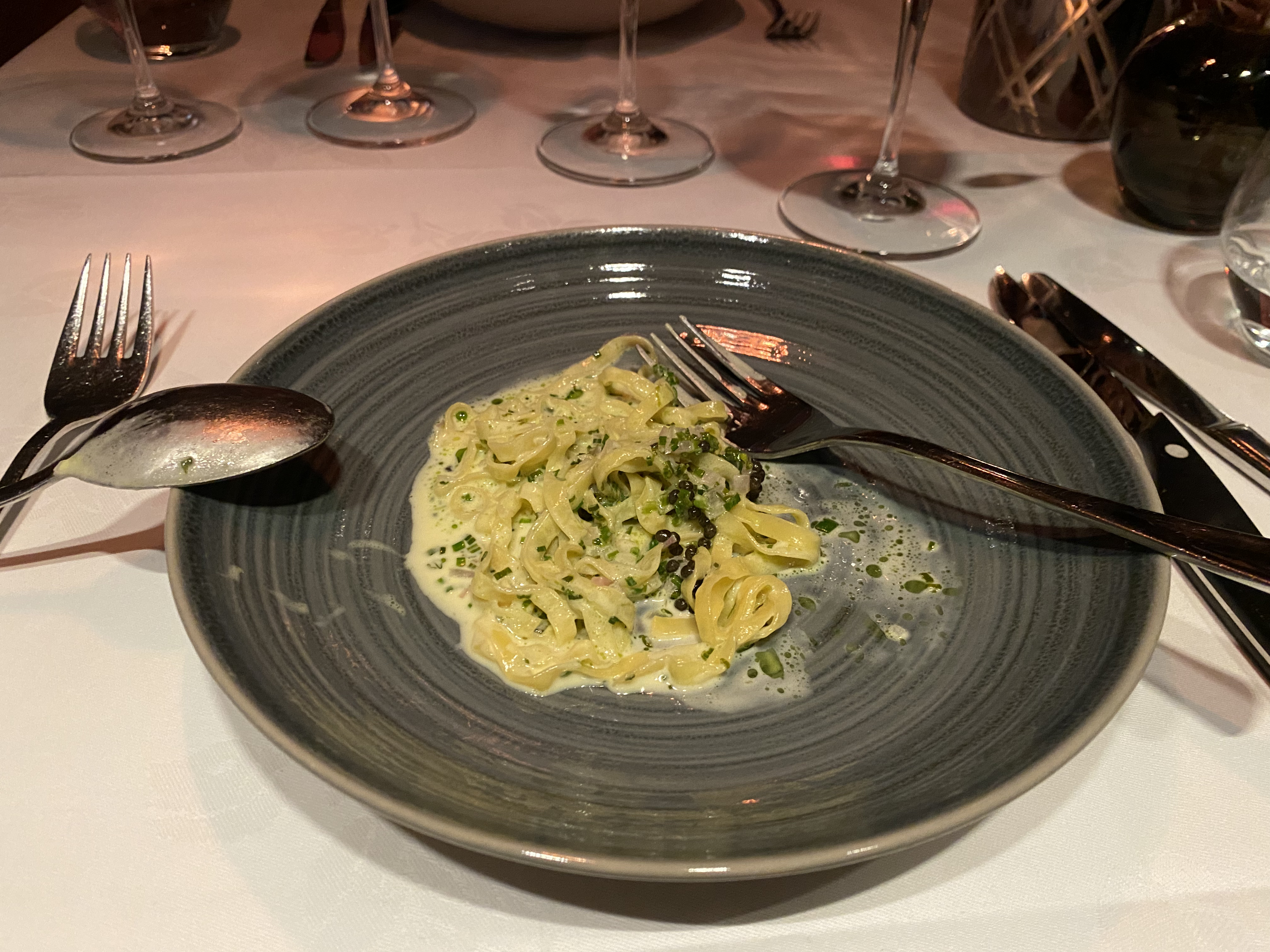 Hotellet har fullt i sina gourmetmatsalar sedan månader tillbaka, så där får vi inte plats. Men man har varit oss behjälpliga med bokning på en närliggande restaurang. To rom og kjøkken ska bjuda oss på födelsedagsmiddag. Eller, det är ju Z som gör det. Vi lotsas dit via vår karta, en rask promenad på några hundratal meter, får vårt bord och kikar på menyn. Bestämmer oss för en sjurättersmeny med en tillhörande vinmeny, för vi tänker att kvällen ska bli lång.