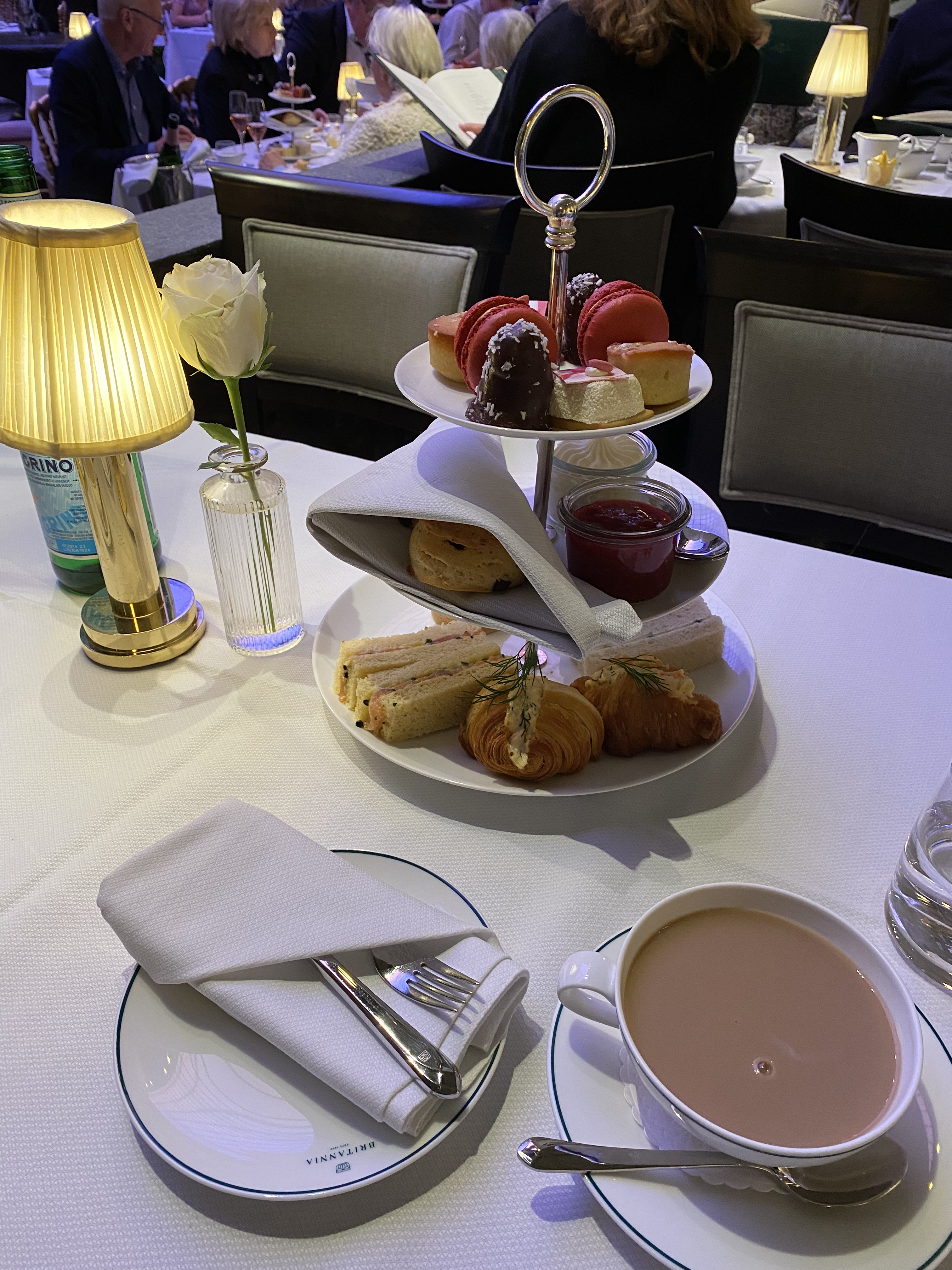 Vi kommer ned efter utflykten och utsikterna i god tid för att skifta kläder till vårt afternoon tea. Nu är det dags för min tweedkostym, Z stassar till sig med sin vackra Ilse Jacobsenklänning. Palmehaven är fylld av sorl, loungemusik från mannen vid flygeln, serveringspersonalen löper gatlopp med ställningarna med läckerheterna: fingersandwich, scones med sylt/marmelad, kakor… Ja, te till, förstås. Jag väljer husets egen blandning av Earl Grey.