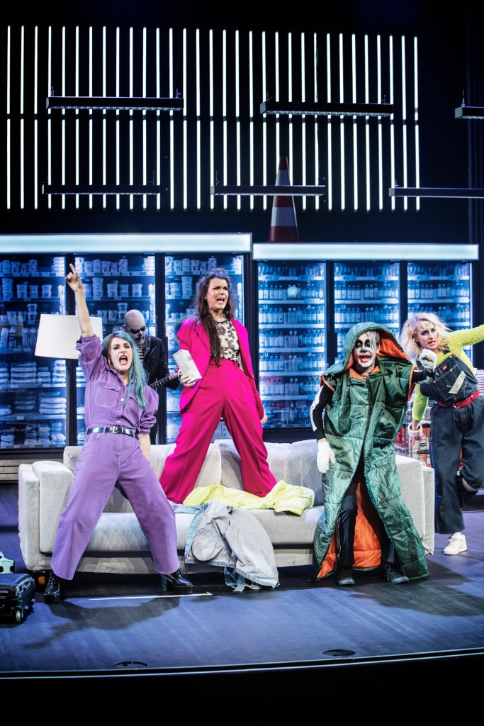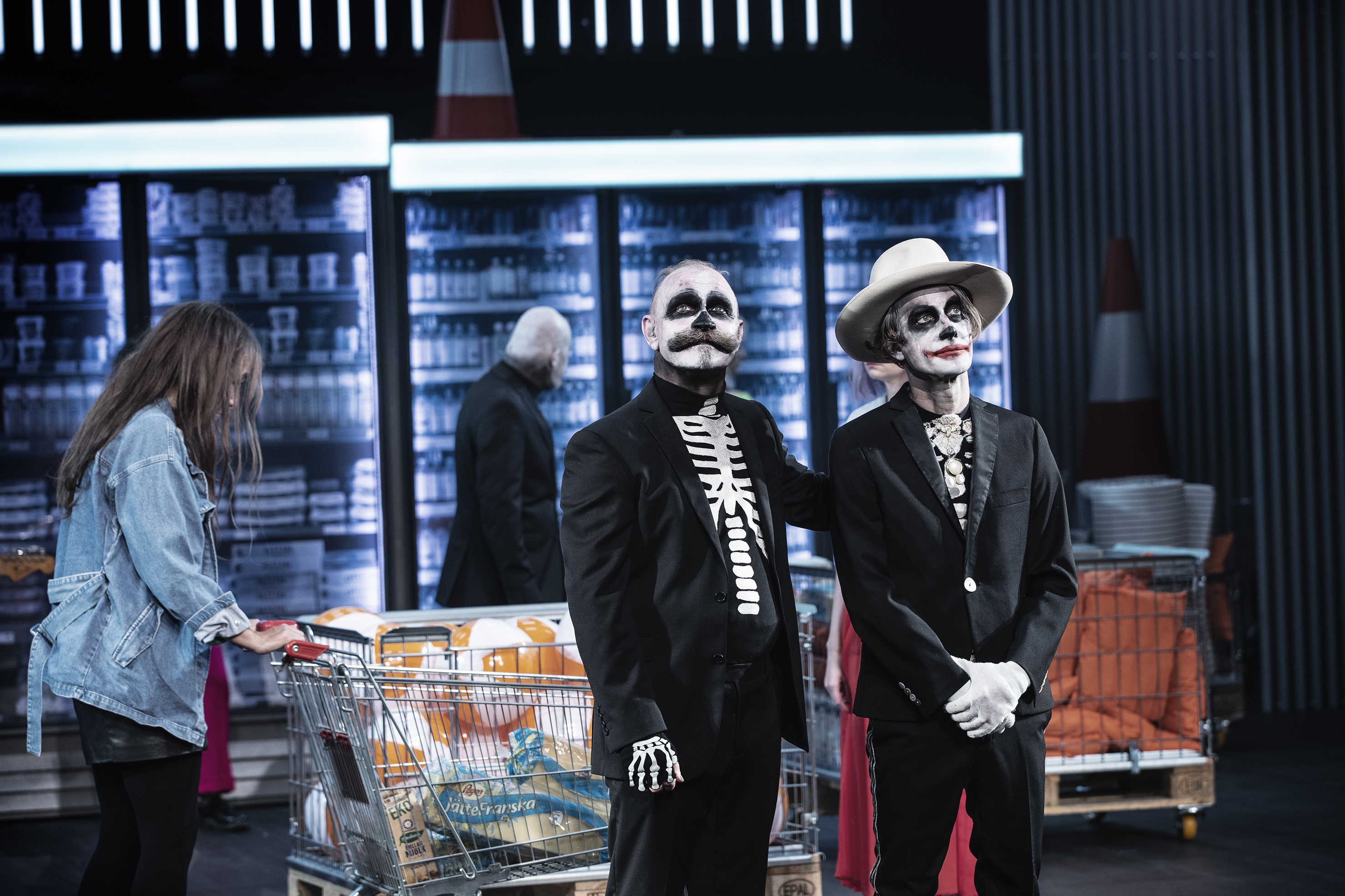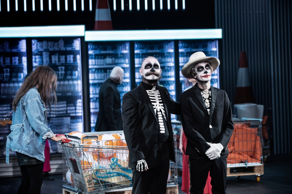 Hanna Nygrens manus är humoristiskt smittande och allvarsspäckad. Hennes inramning av ett modernt livsmedelsvaruhus med utrop med jämna mellanrum om att allt är tillgängligt, är svart komik och kärnfull nutidsorientering i färgstark prakt. Helle Damgård har gjort en smart scenografi som raskt förvandlar detta köpcentrum till replokal eller lägenhet. Hennes kostym kontrasterar Bob hunds, i regel, svarta skelett med Bob katts intensiva kulörer.