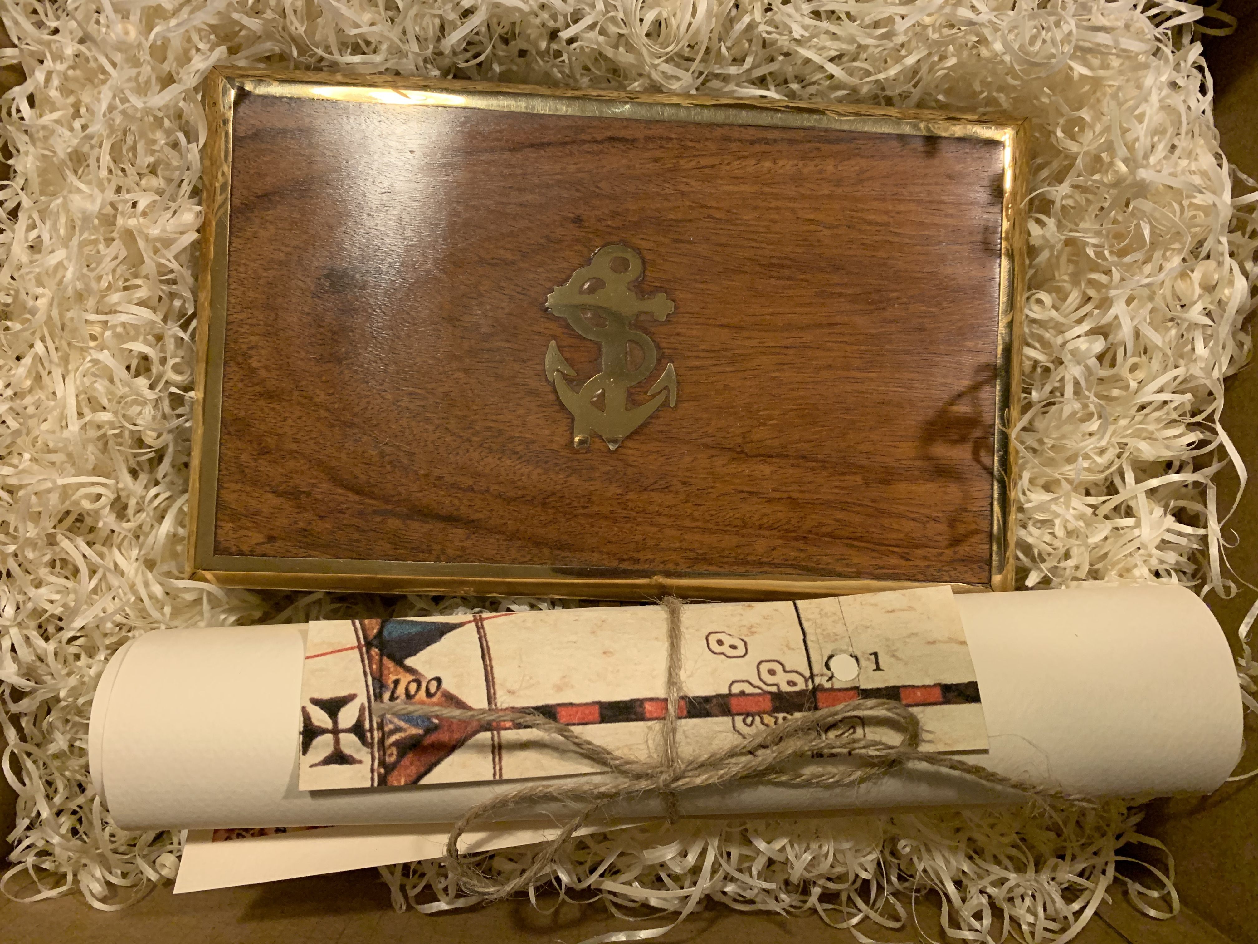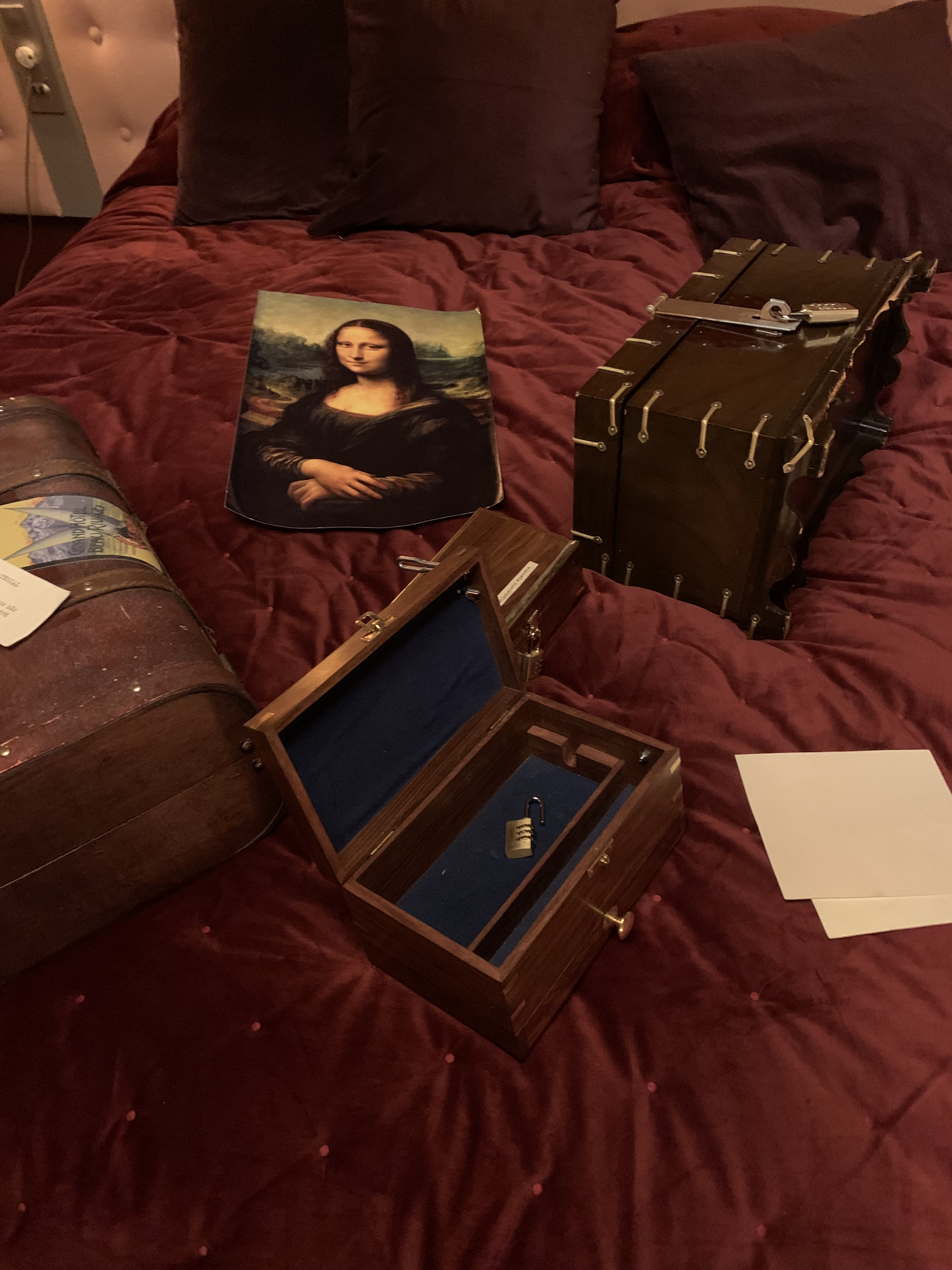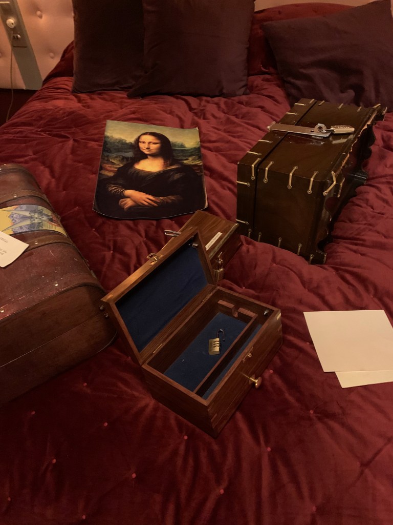 Vi får någon vecka innan vistelse en påringning – på dörren – av en ung, snygg man som lämnar över ett paket. Det initierar starten på vårt boende och vi packar nyfiket upp innehållet, hittar en kista med kodlås, en karta och ett brev. Den första gåtan ska lösas och det går relativt lätt. Vi har fått blodad tand.