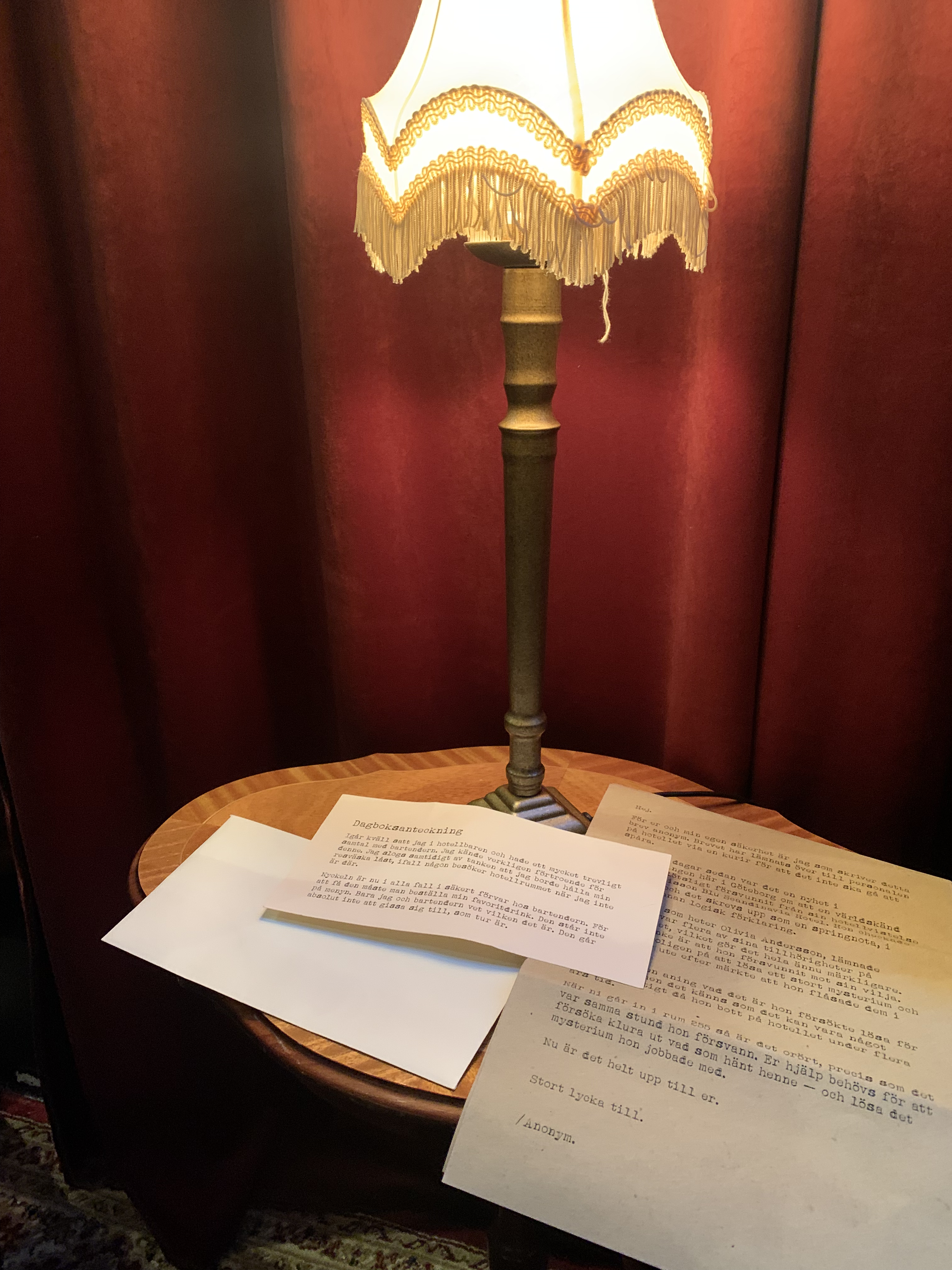 Vi tar till oss allt, försöker smälta det, sätter oss i vrån med stol, miljö och rekvisita, som för att göra en tidsresa tillbaka cirka hundar år. Det krävs fantasins makt, för hotellet vi bor på är ju från 80-talet och inte speciellt anrikt. Men det går, förstås. Vi får berättat att en kvinnlig detektiv, har haft som uppdrag att spana efter ett hemligt, förmodligen internationellt, sällskap. Allt är förstås mycket farligt och detektiven har spårlöst försvunnit, men i sitt rum lämnat ledtrådar hur vi – som gäster – ska lösa gåtan.
