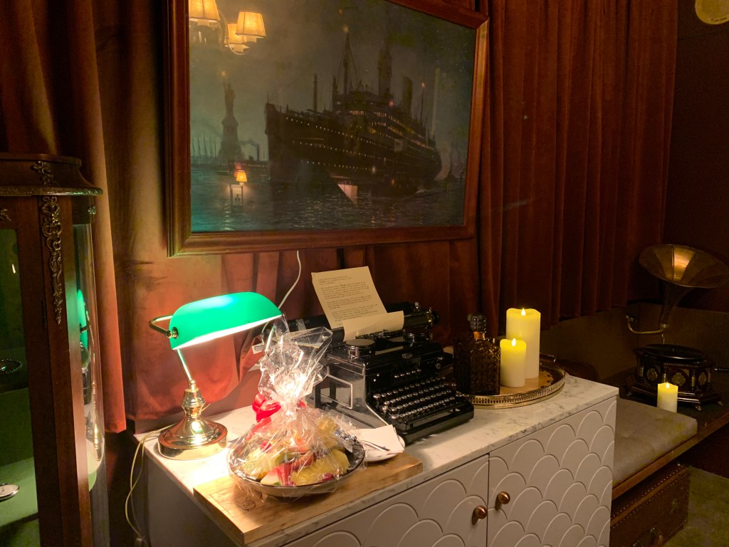 När vi checkar in är det till en concierge med en väl tilltagen blå, kraftig rock. Han vet mycket väl vilka vi är och välkomnar, berättar lite om vistelsen och rekommenderar oss att inleda i foajén där en speciell plats är vikt för att locka till detta mycket speciella boende. Vi får också rådet att, efter att ha fått vårt första brev, gå till baren för vidare ledtråd.