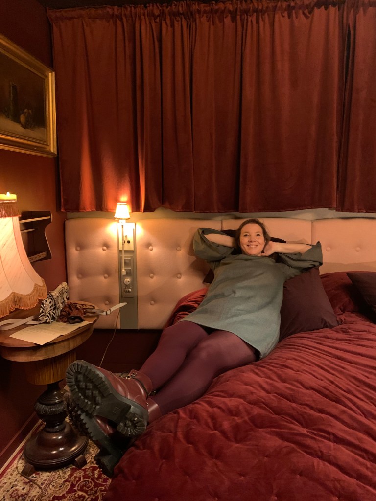 Vi tänker initialt att det är lämpligt att gå till bartendern för vidare tips på vägen, men där hamnar vi lite fel och han bjuder på något som vi kanske inte ska ha, vilket vi inser. Istället går vi till rummet där vi ska bo. Rum 255 är väsentligt annorlunda från i somras. Istället för en rosa galenskap är det brunmurrigt, tavlor på väggarna, en skrivmaskin, vitrinskåp, plysch och helt utan ljusinsläpp från de nogsamt igendragna, tungt hängande sammetsgardinerna. Ej att förglömma, rummet saknar teve!