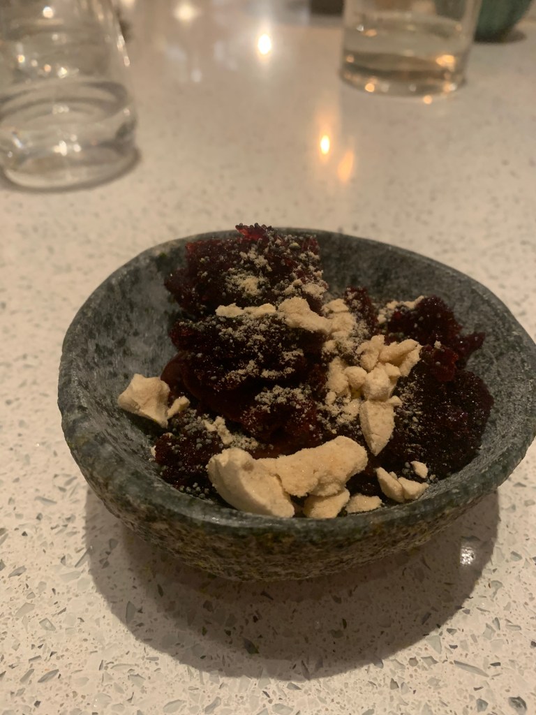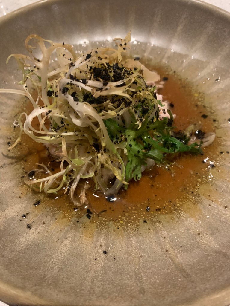Jag försöker vädra bort gåtorna, men hur vi än vrider och vänder på det, så återkommer vi alltid till dem. Vi vet att vi har knappt med tid, för efter middagen har vi möjlighet till att ringa några samtal för att, likt livlinor, får hjälp på vägen. Men det sker inom ett visst tidsfönster. Samtidigt är mat på Noot inget man slarvar bort. Vi har bara sippat på ölen, så den får fortsätta in till nästa rätt, där Z valt sotad pilgrimsmussla med svartrot, äpple, tång och jag kanin med svart oliv, grillad frissé, salvia, majrova. Det, som Z brukar säga om något som är riktigt välsmakande, knullar i munnen. Till huvudrätten rekommenderas vi en rödvin, som passar till den hängmörade entrecôten med rostad jordärtskocka, äpple, pepparrot, råg, raps, som vi båda beställt. Och, jo, Jumilla (spanskt vin från Juan Gil) passar utmärkt till den välsmakande maten och retar till fler än ett glas.