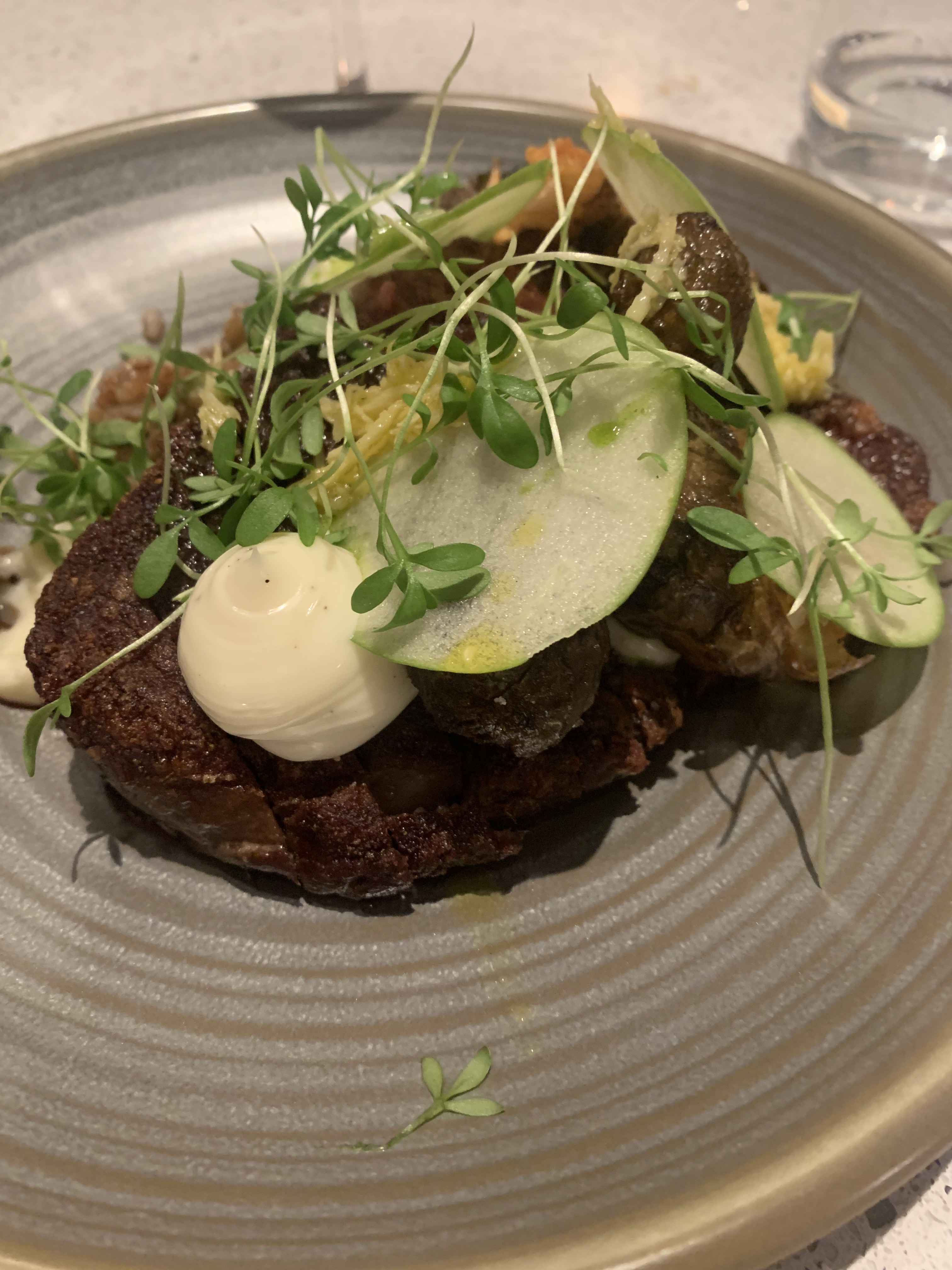 Vi hamnar in tidsnöd (ingen bra grej när man ska lösa problem) för vi har bokat bord på restaurang Noot Nordik Kitchen Bar, som ligger i anslutning till hotellet. Vi har varit där tidigare och varit förtjust i deras tänk och rätter. Det är sparsamt med gäster och vi får snabbt en plats, berättar om vår vistelse och får reda på att det är avsatt en trerätters meny i samklang med den. Men först smörrebröd. Inte det danska, utan svamp på knäckebröd med variation på svamp, inlagd palsternacka, friterad rotselleri. En frisk lageröl från Rådanäs till, som blir en bra start på välsmakande och salig middag.