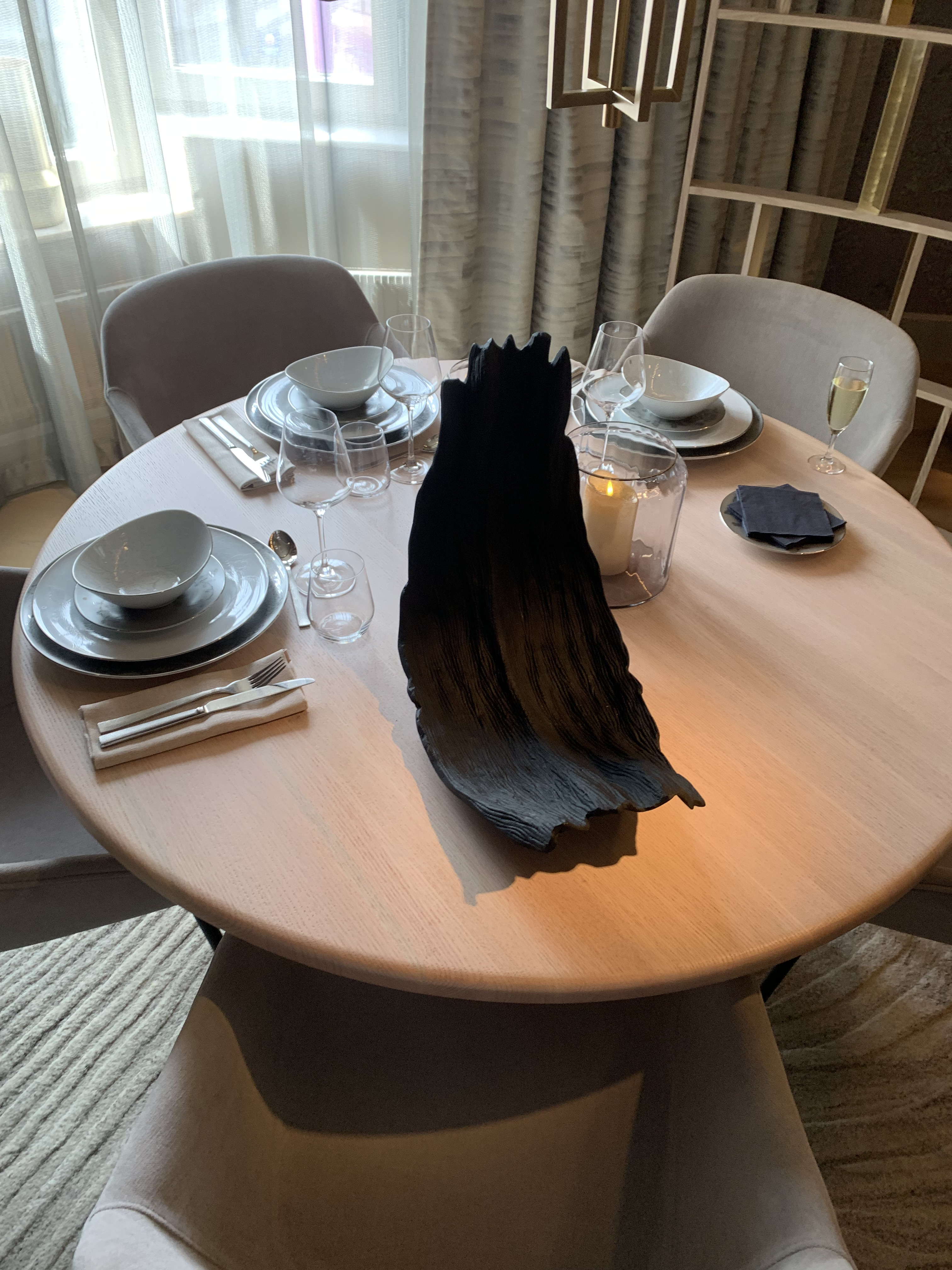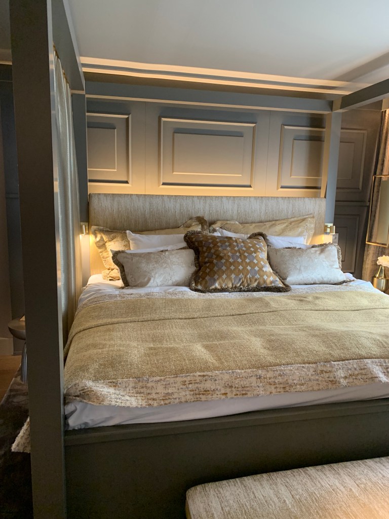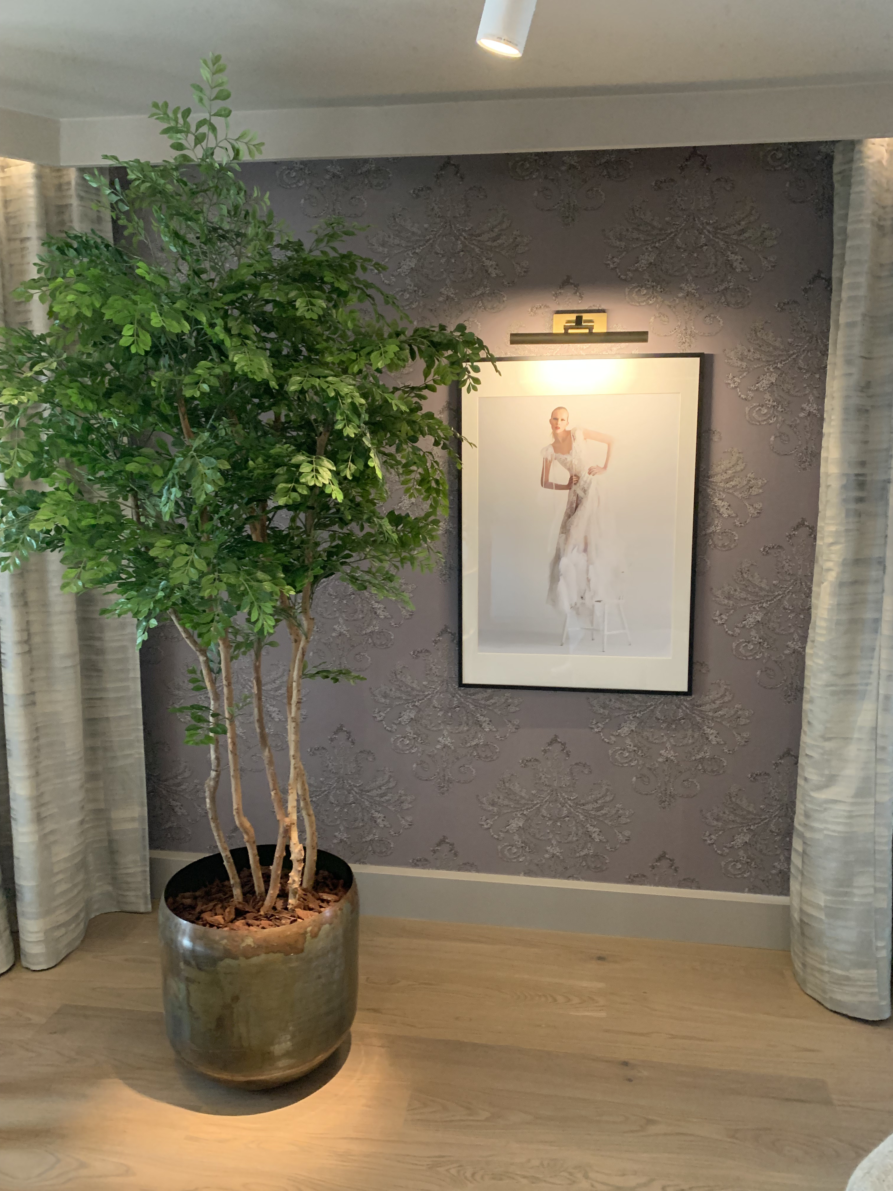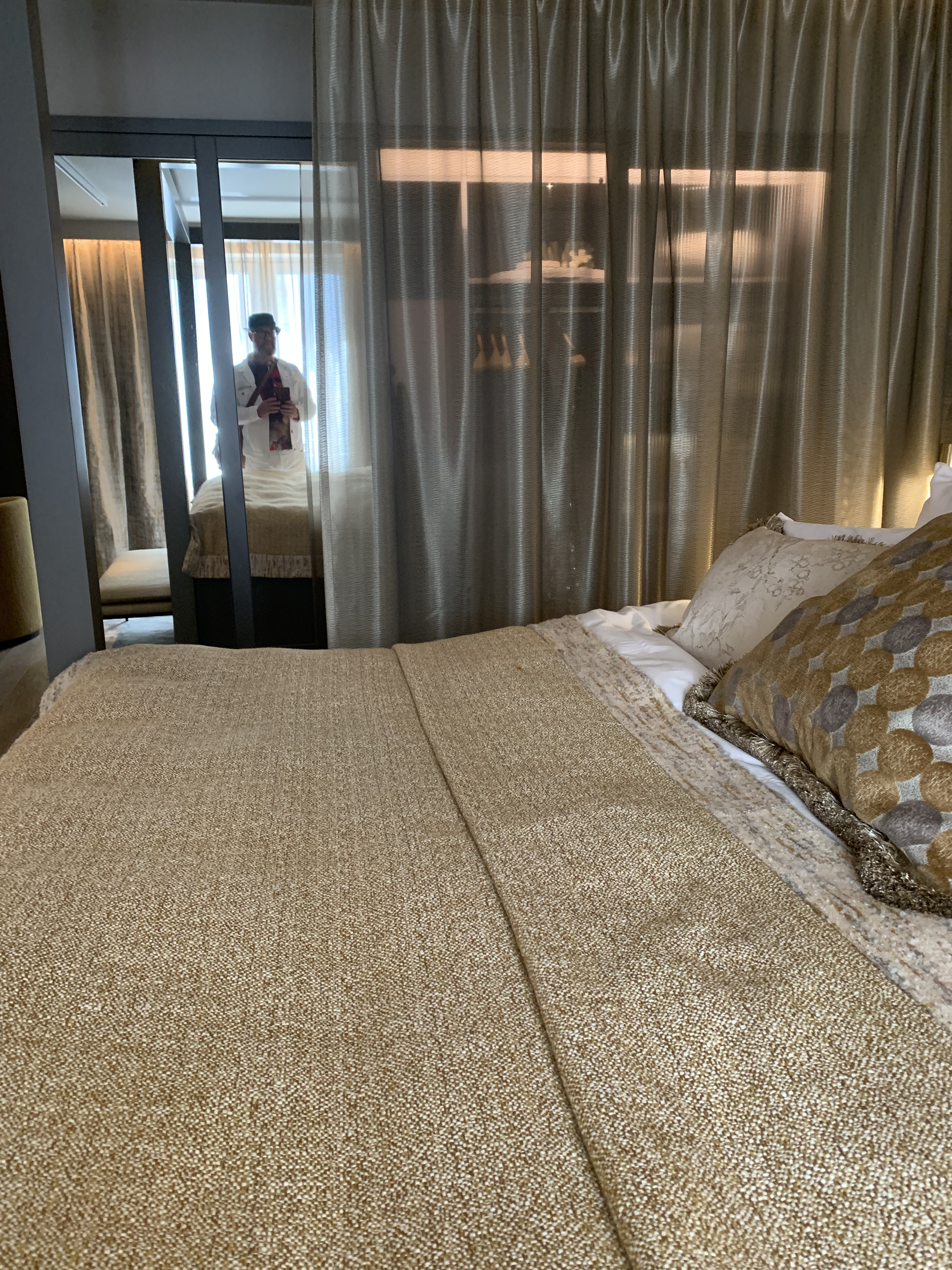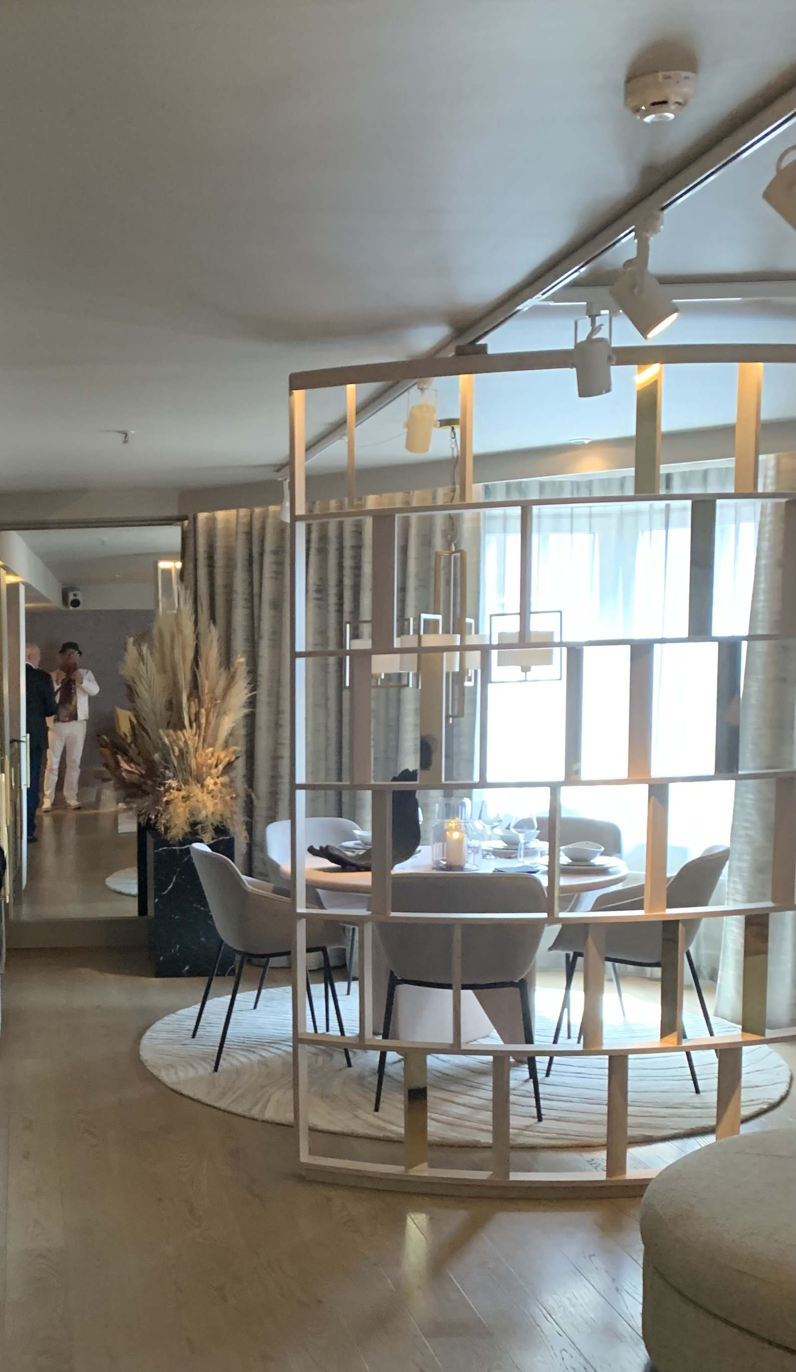 Sviten är sobert lockande. Lars Wallin har valt färgskalan greige – det vill säga gråbeige med svarta och vita detaljer samt guld. Rummet är öppet, men med en listig spaljé som avskärmar mellan matbord och vardagsrum. Tapeten på väggen är Lars Wallins egen, från början handbroderad för att sedan fotograferas av för att kunna bli tapet. Den stora spegeln på kortväggen gömmer listigt teven och pockar därför inte på onödig uppmärksamhet. På bordet står porslin dukat; design Lars Wallin, förstås. Himmelssängen är inbjudande, som hela sovrummet med höjd på garderoberna. Här ska ju bröllopsklänningar kunna hänga utan att behöva släpa. En herrbetjänt skvallrar om att brudgummen inte är bortglömd.
