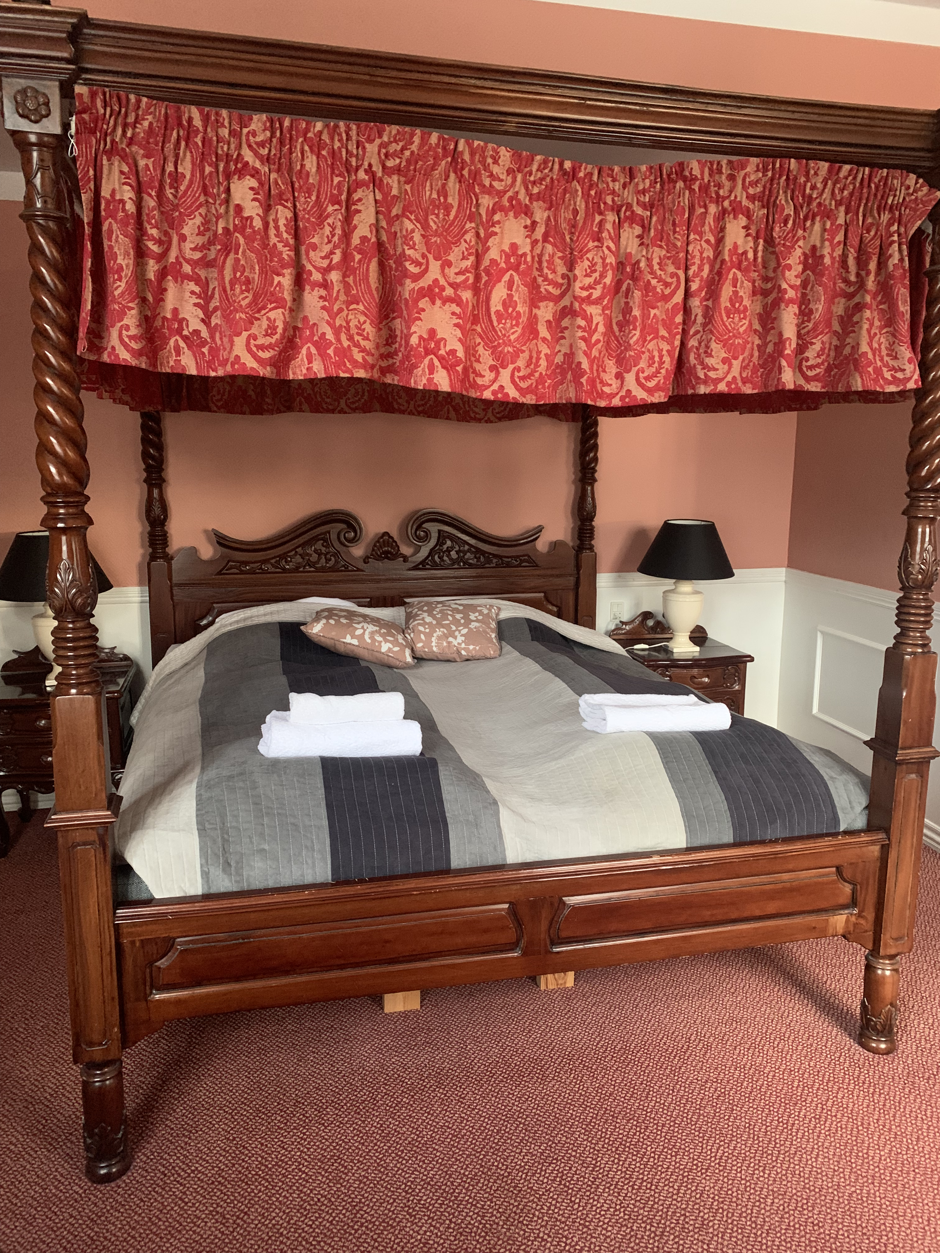 Klockan är åtta, i receptionen står en ung kvinna som hjälper oss med incheckning och berättar att nyckeln till vårt rum 26 sitter i dörren. Vi tar vårt pick och pack och går upp, ser nycklar i några dörrar, men inte till vårt rum. Z går ner, receptionisten följer med upp, beklagar, ringer ett samtal och ger oss sviten. Nå, nu är det förvisso ett stort rum, men svit… nja. Z jublar åt himmelssängen, något hon längtat efter att få sova i. Rummet är ok, möblerat med 1800-talsmöbler i hotellet med anor från 1700-talet, en soffa och två fåtöljer – inte så sittvänliga – och ett lågt bord. i andra ändan ett skrivbord med tillhörande stol. Det är spartanskt, men rymligt.